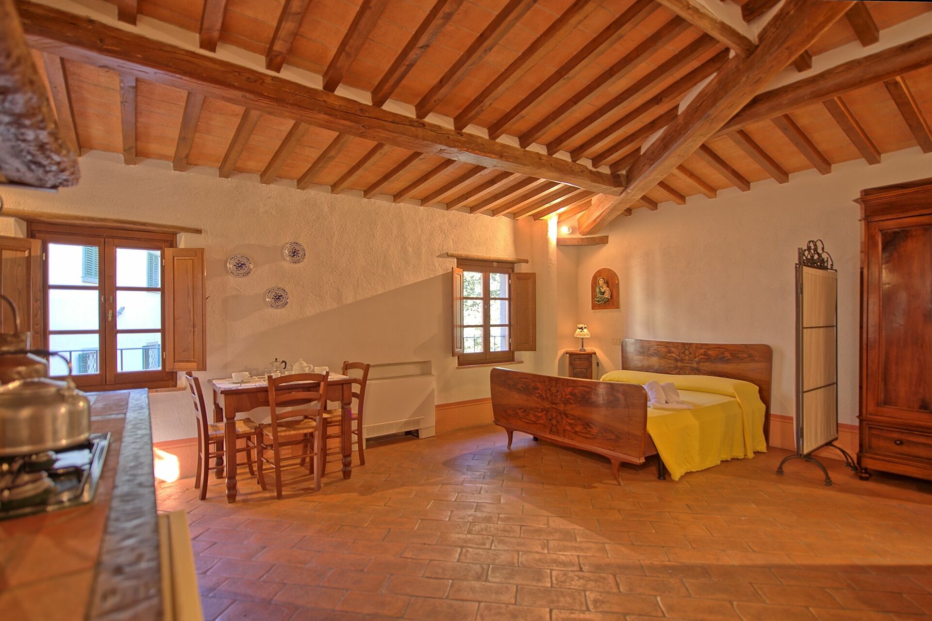30 m2; (2 personer) Første sal: studie (aircondition) med dobbeltseng og spiseplads med pejs og tekøkken (køleskab, mikroovn), badeværelse med bruser.