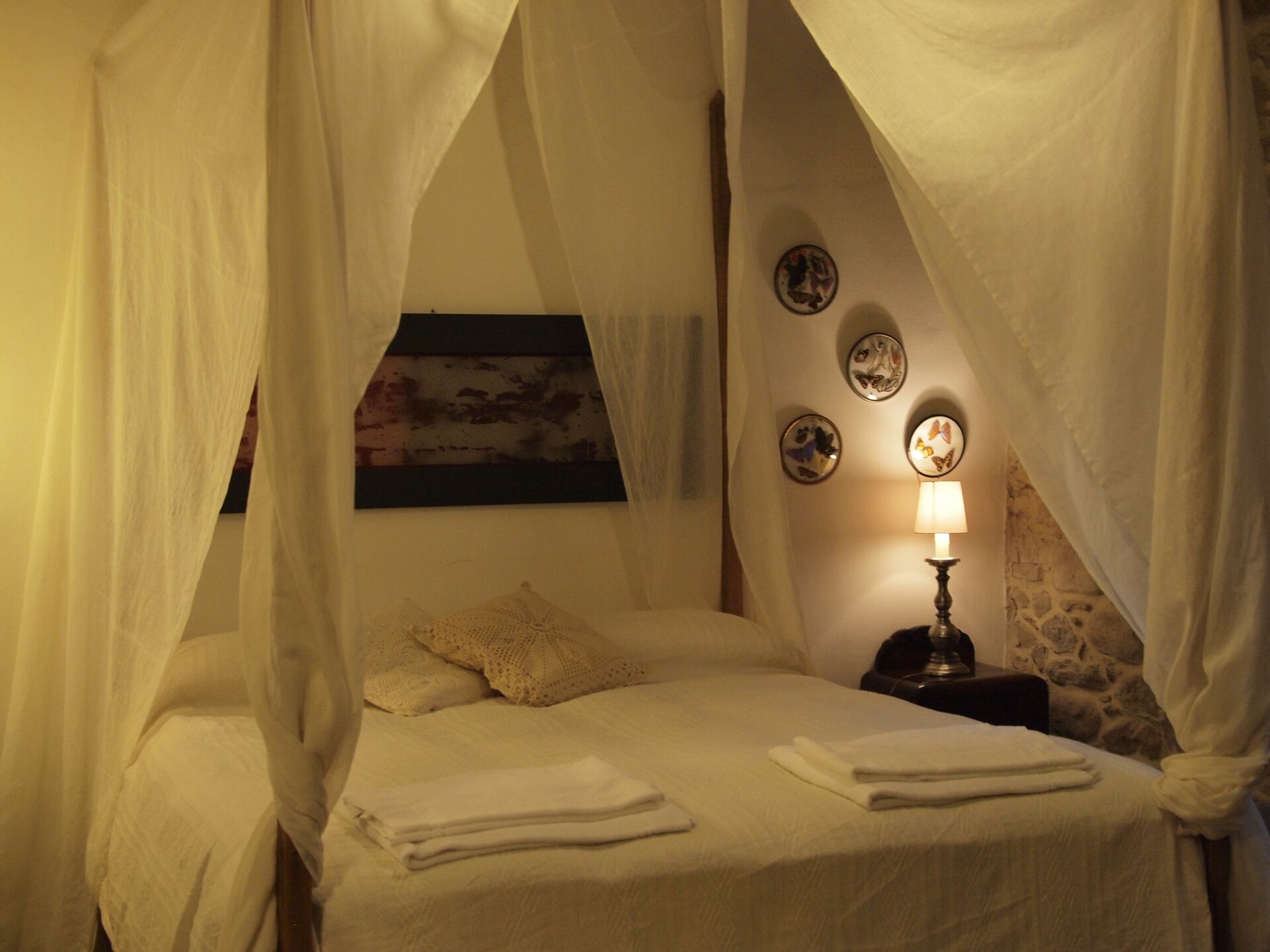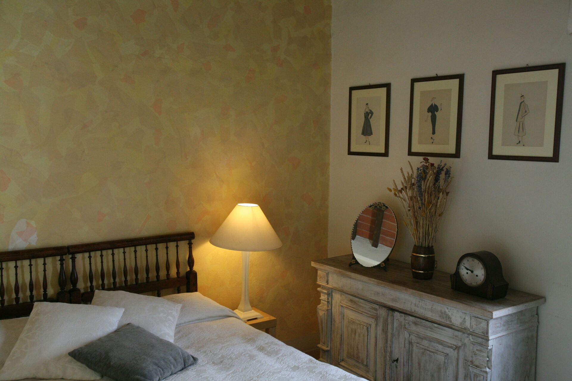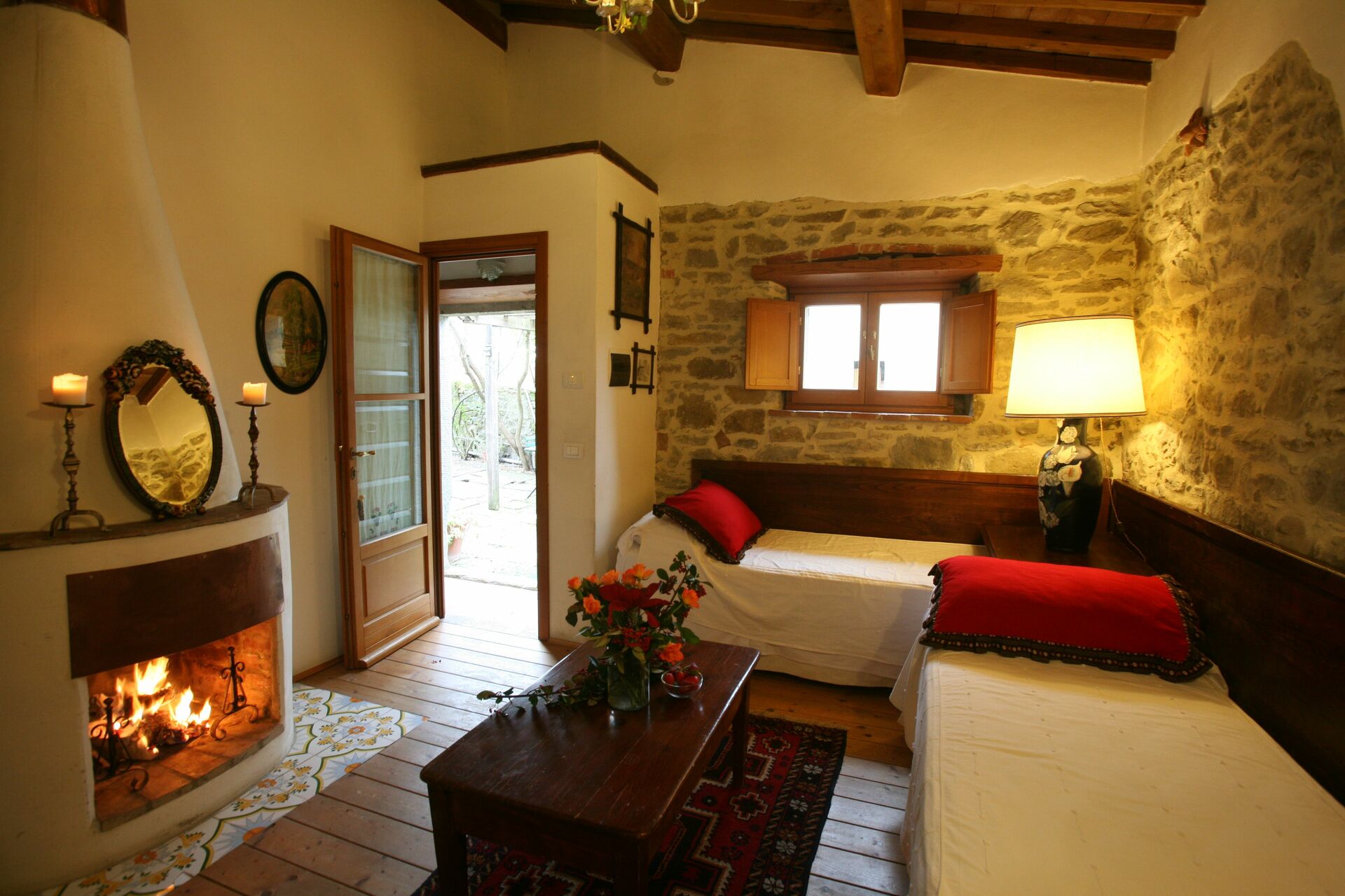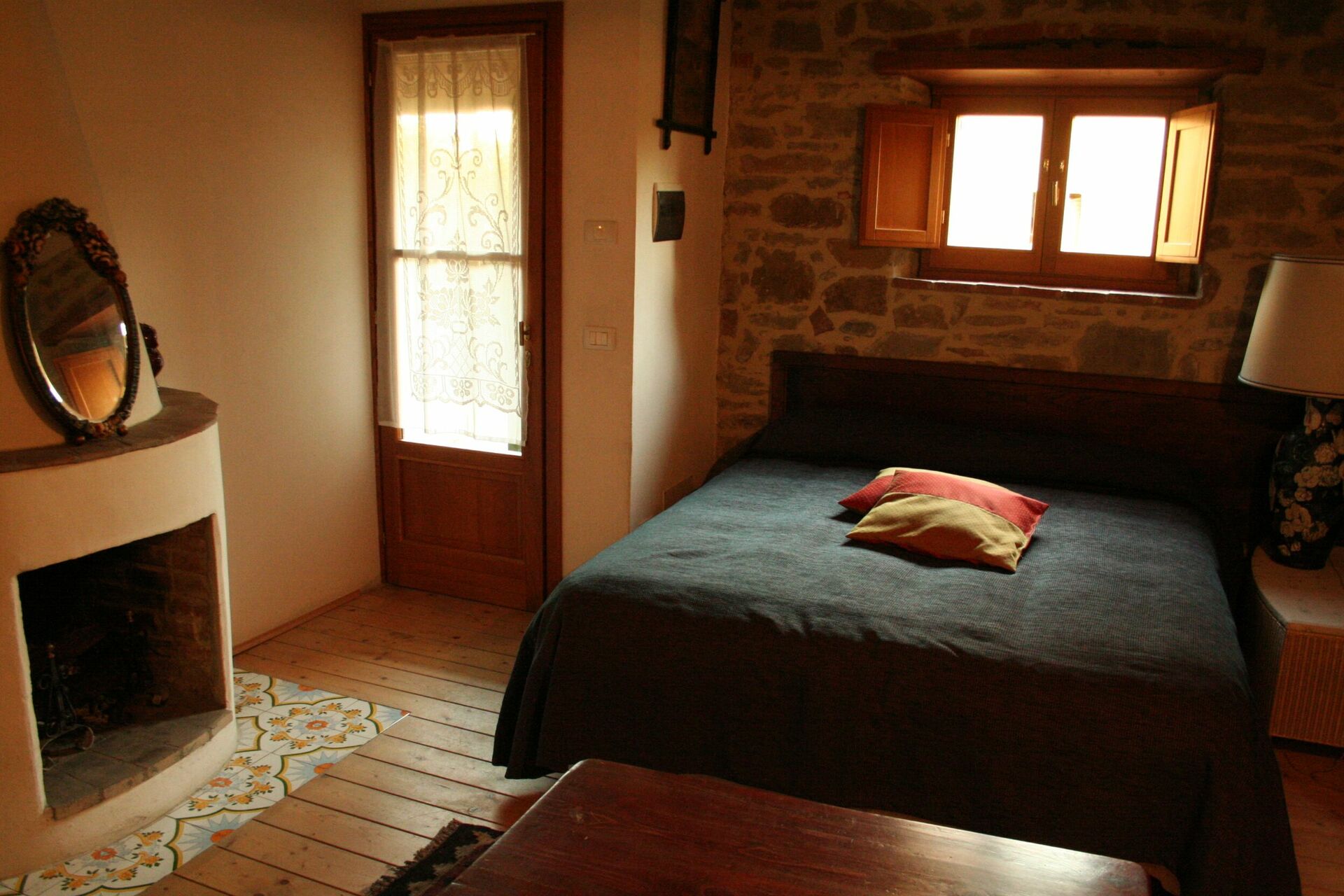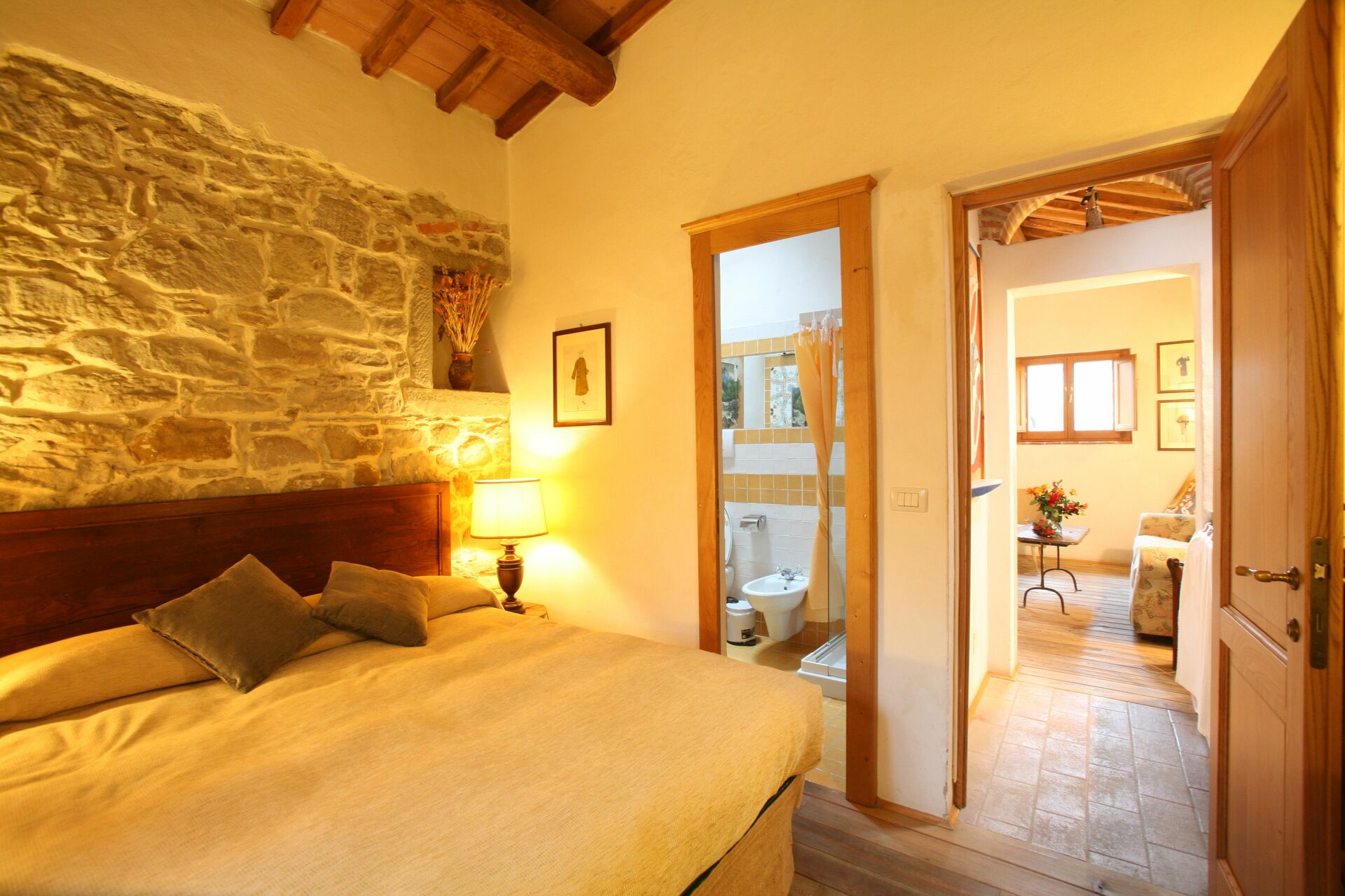 Soveværelse med bad 1 (25 m2): dobbeltseng, WIFI internet, klimaanlæg, mobil ventilator, lænestol, skrivebord, kamin, køleskab, wc, bidet, bruser, hårtørrer, udgang til gårdhave.