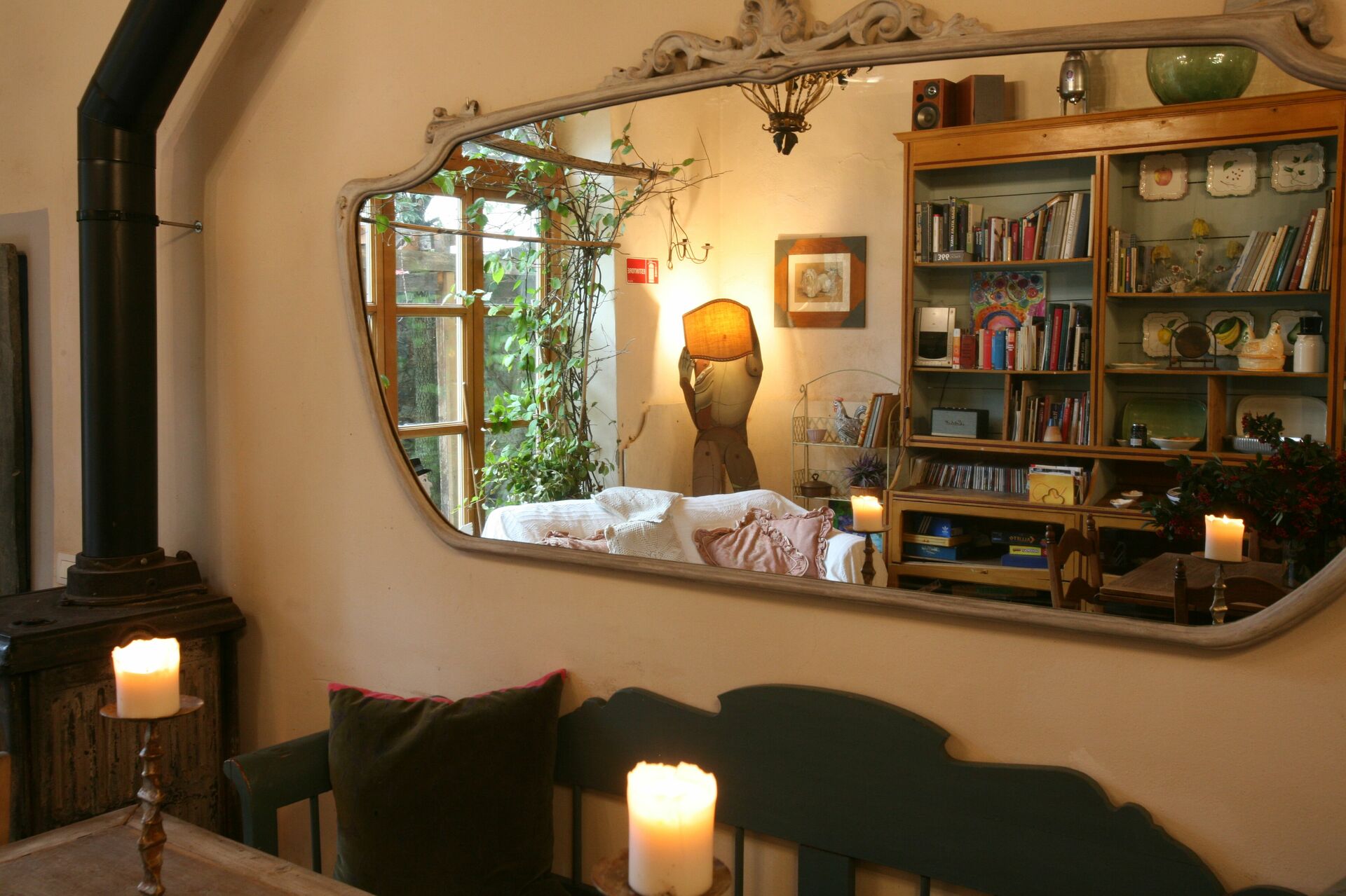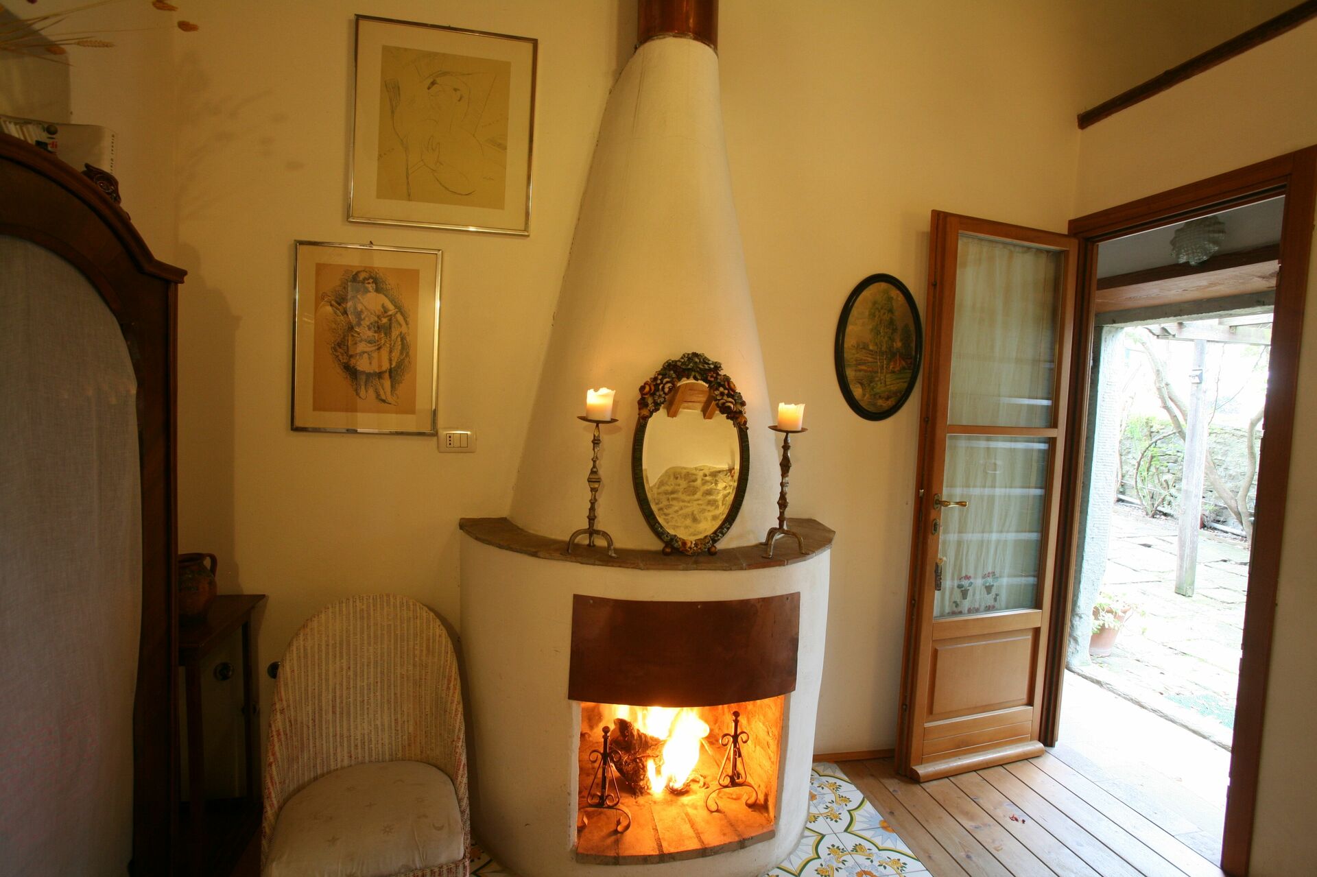 Stue (15 m2): to sofaer, kamin, WIFI internet, satellit tv, mobil ventilator, udgang til gårdhave.