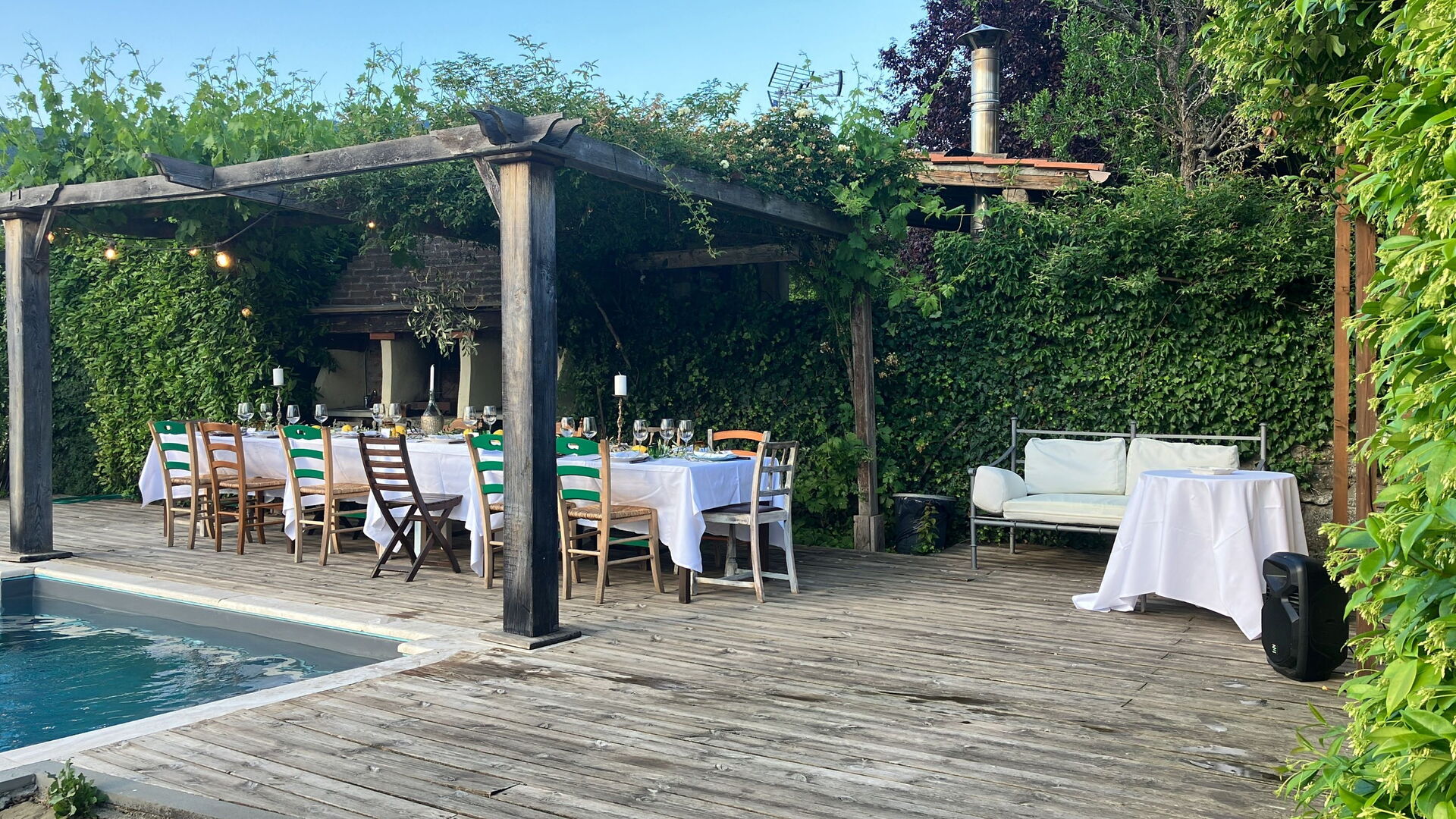 Have (200 m2): swimmingpool (privat, bredde: 4m, længde: 8m, max. dybde: 180m, min. dybde: 120m, udendørs, indhegnet), WIFI internet, grill, kamin, udendørs spiseplads, spisebord (personer: 21), havepavillon, liggestol, lukket ejendom.
