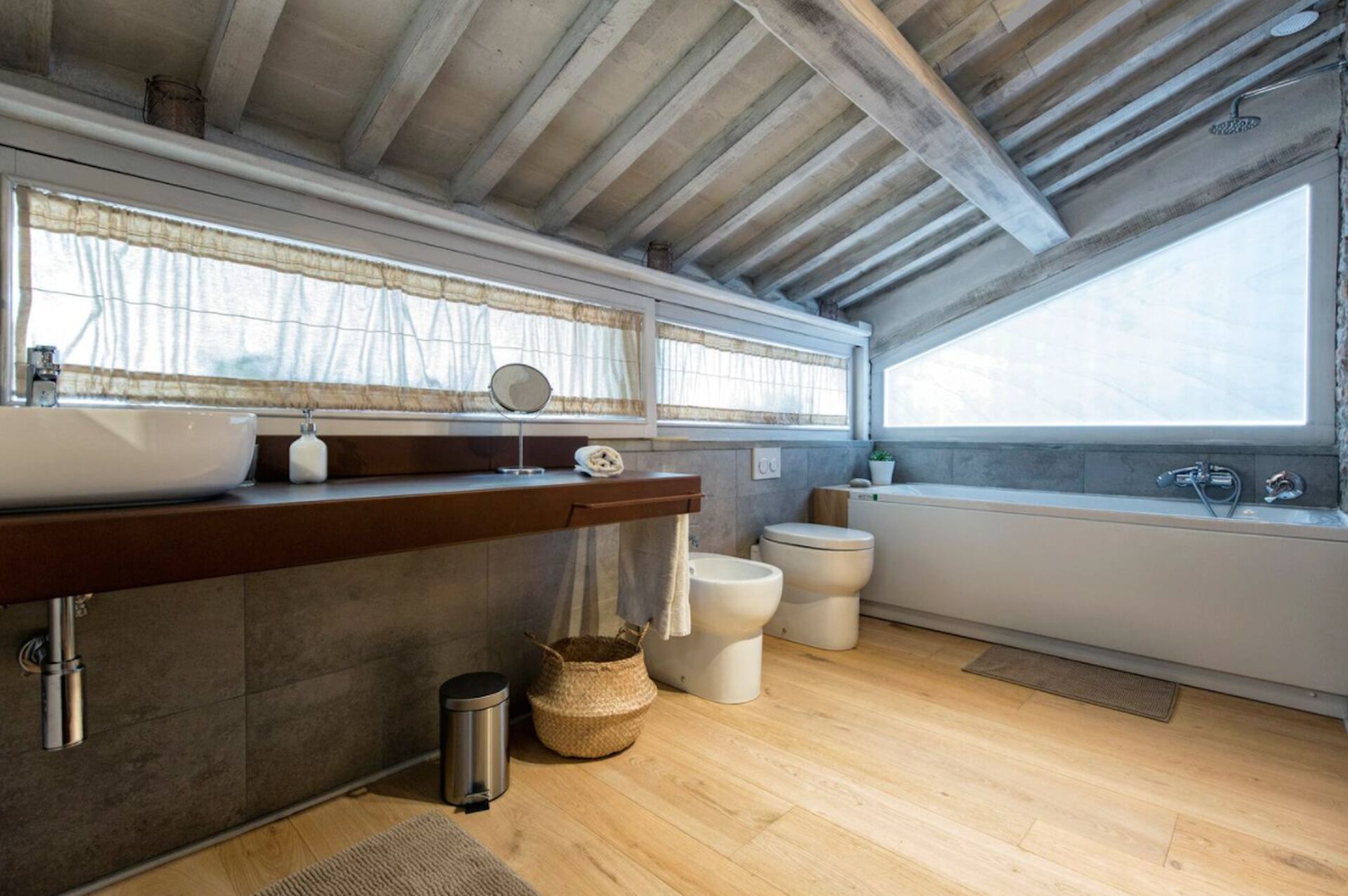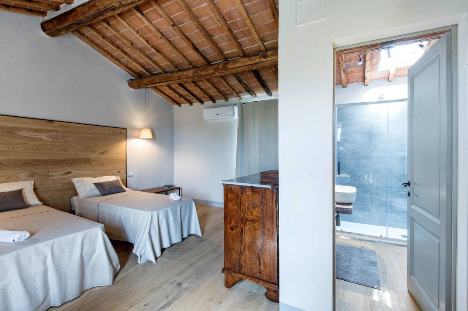 Soveværelse med bad 1: to enkeltsenge (bredde: 85m, længde: 190m), WIFI internet, klimaanlæg, myggenet, vask, wc, bidet, bruser, hårtørrer.