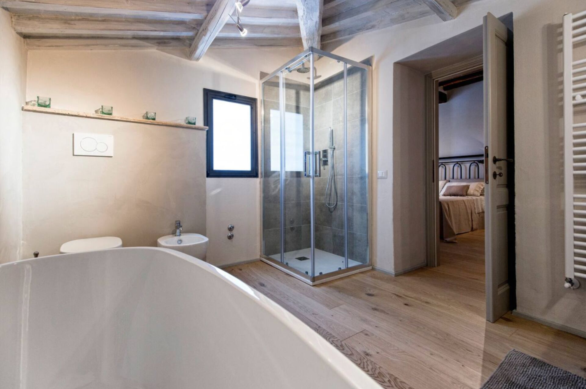 Soveværelse med bad 1: king size seng (bredde: 200m, længde: 200m), WIFI internet, klimaanlæg, myggenet, boblebad, vask, wc, bidet, hårtørrer.