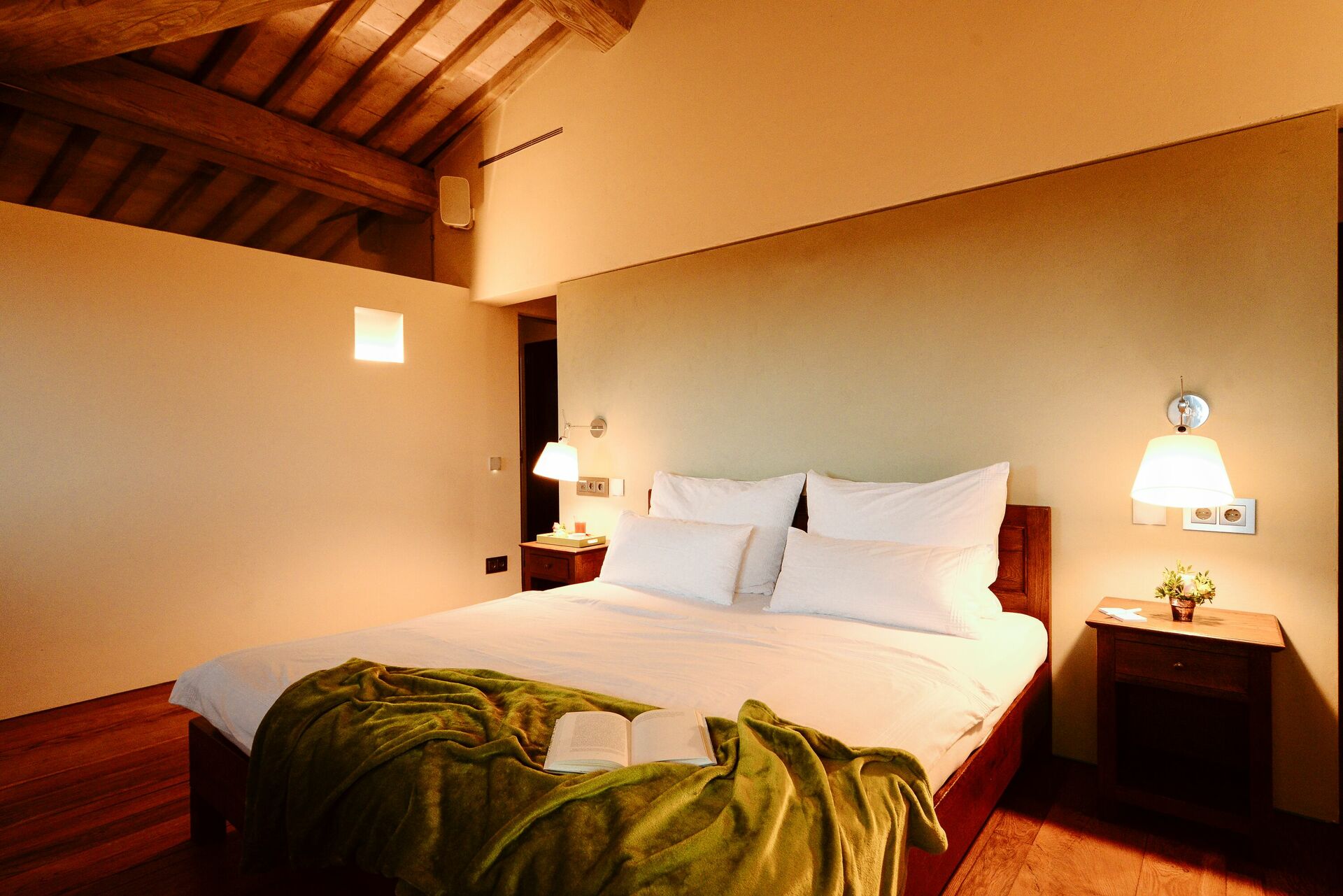 Soveværelse med bad 1: dobbeltseng, WIFI internet, klimaanlæg, lænestol, skrivebord, vask, wc, bidet, bruser.