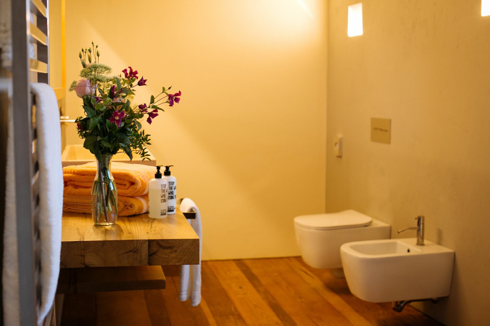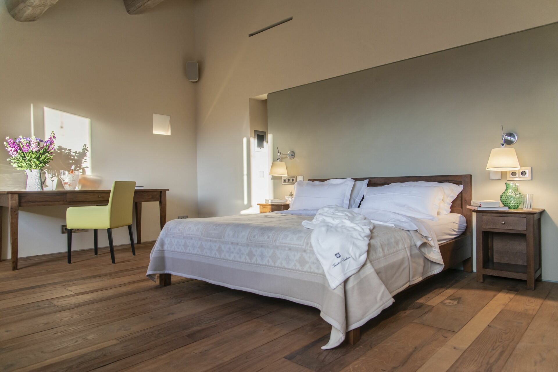 Soveværelse med bad 5: dobbeltseng, WIFI internet, klimaanlæg, lænestol, skrivebord, vask, wc, bidet, bruser.