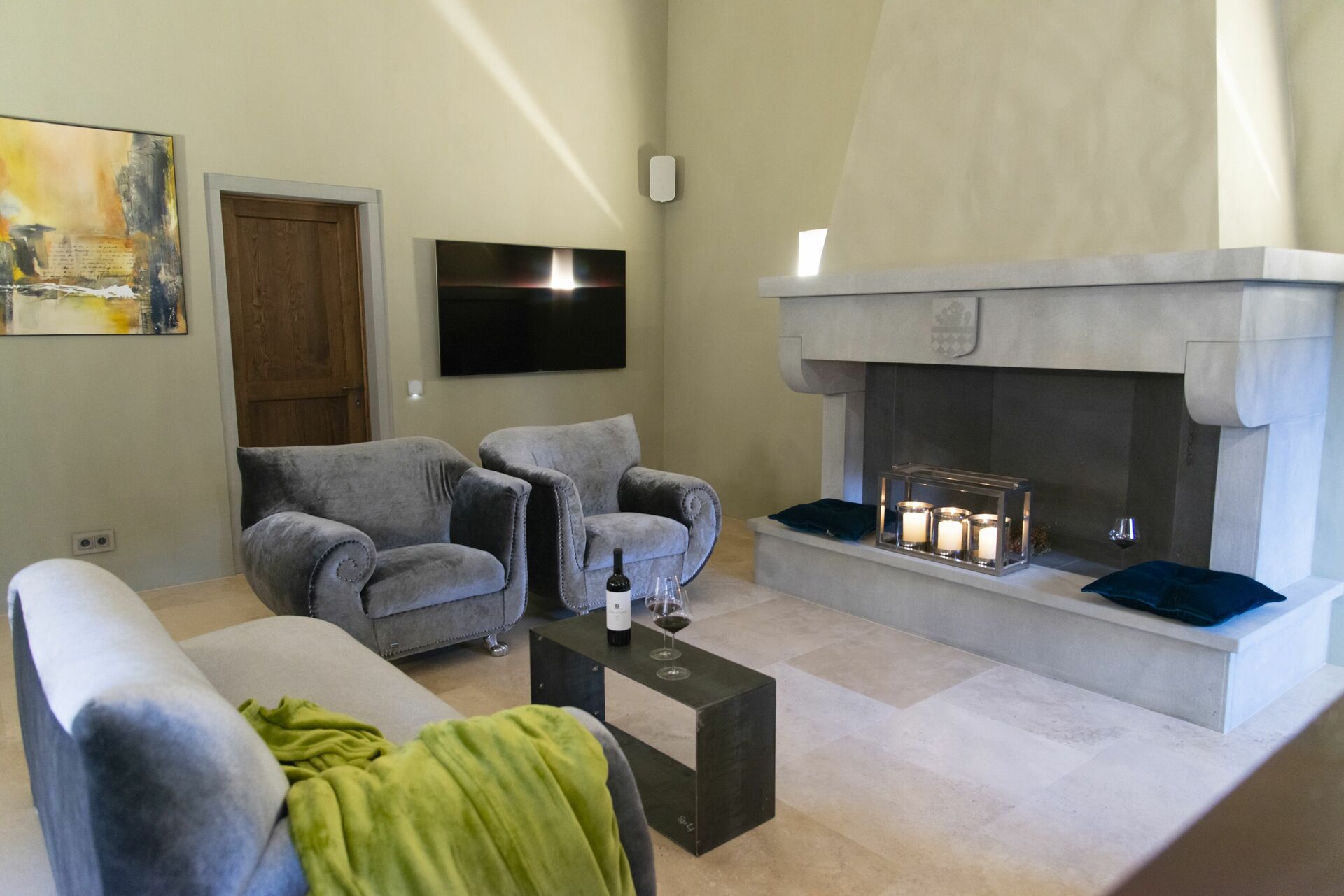 Stue: to sofaer (personer: 3), to lænestole, kamin, klimaanlæg, tv.
