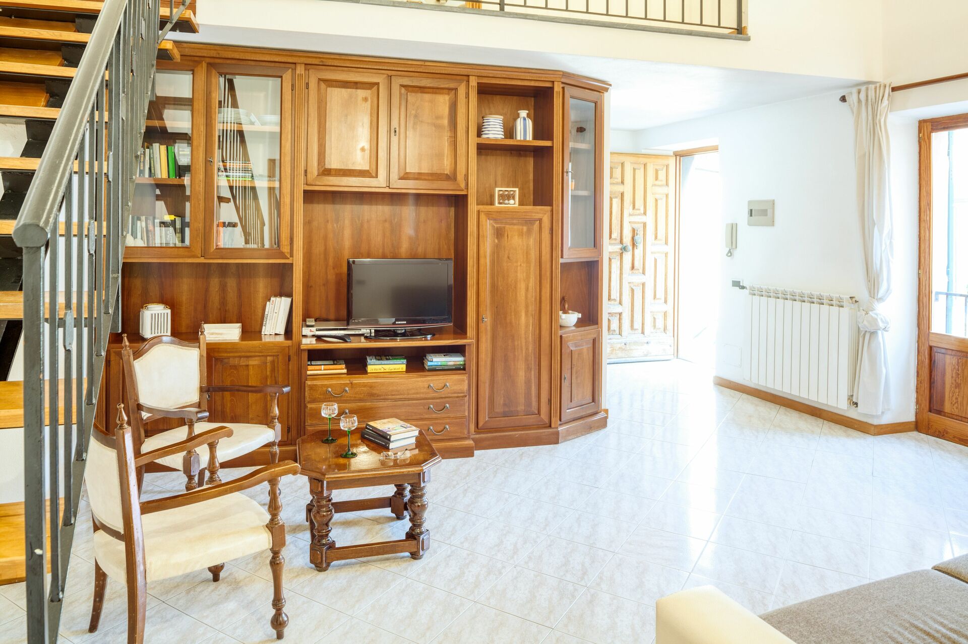 Lejligheden består af en stor stue, et veludstyret køkken, et soveværelse med dobbeltseng, et enkelt soveværelse, et lille badeværelse på nederste etage og et komplet badeværelse på øverste etage.