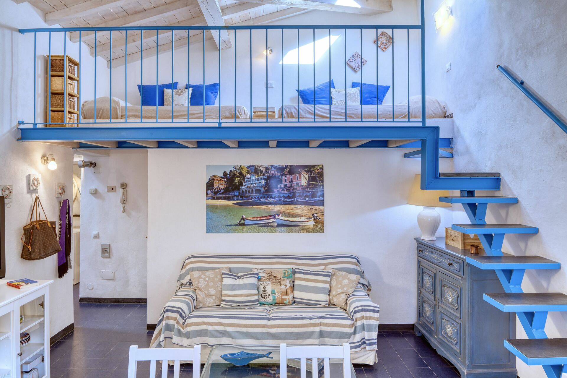 Lejligheden har plads til op til 3 personer med et soveværelse med dobbeltseng og to enkeltsenge i stuen, på mezzaninen.