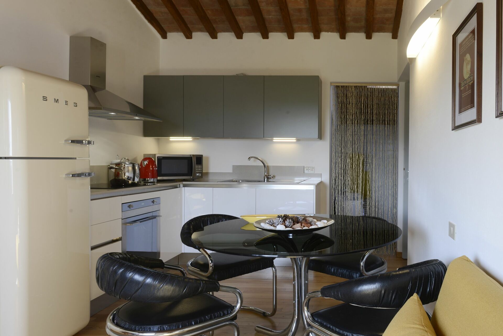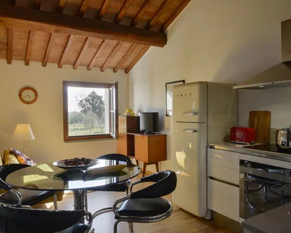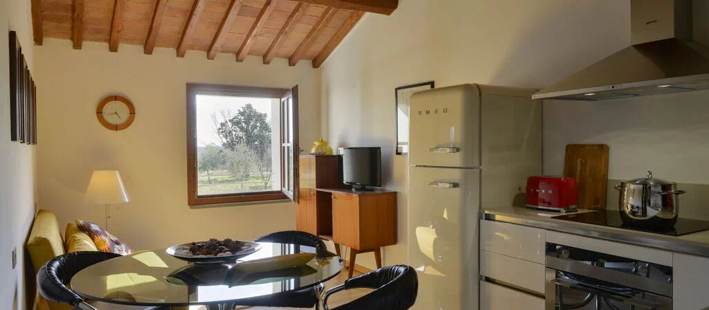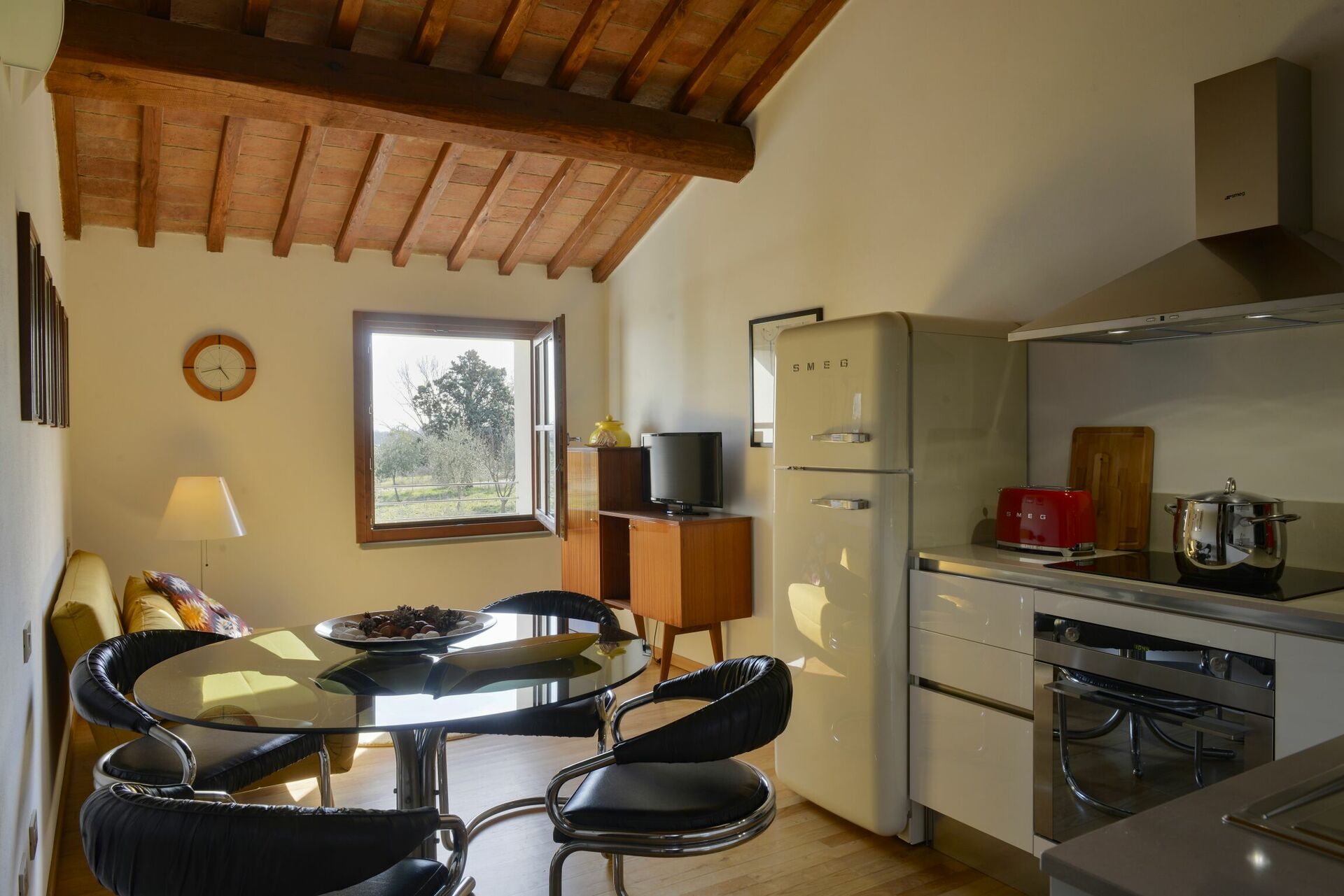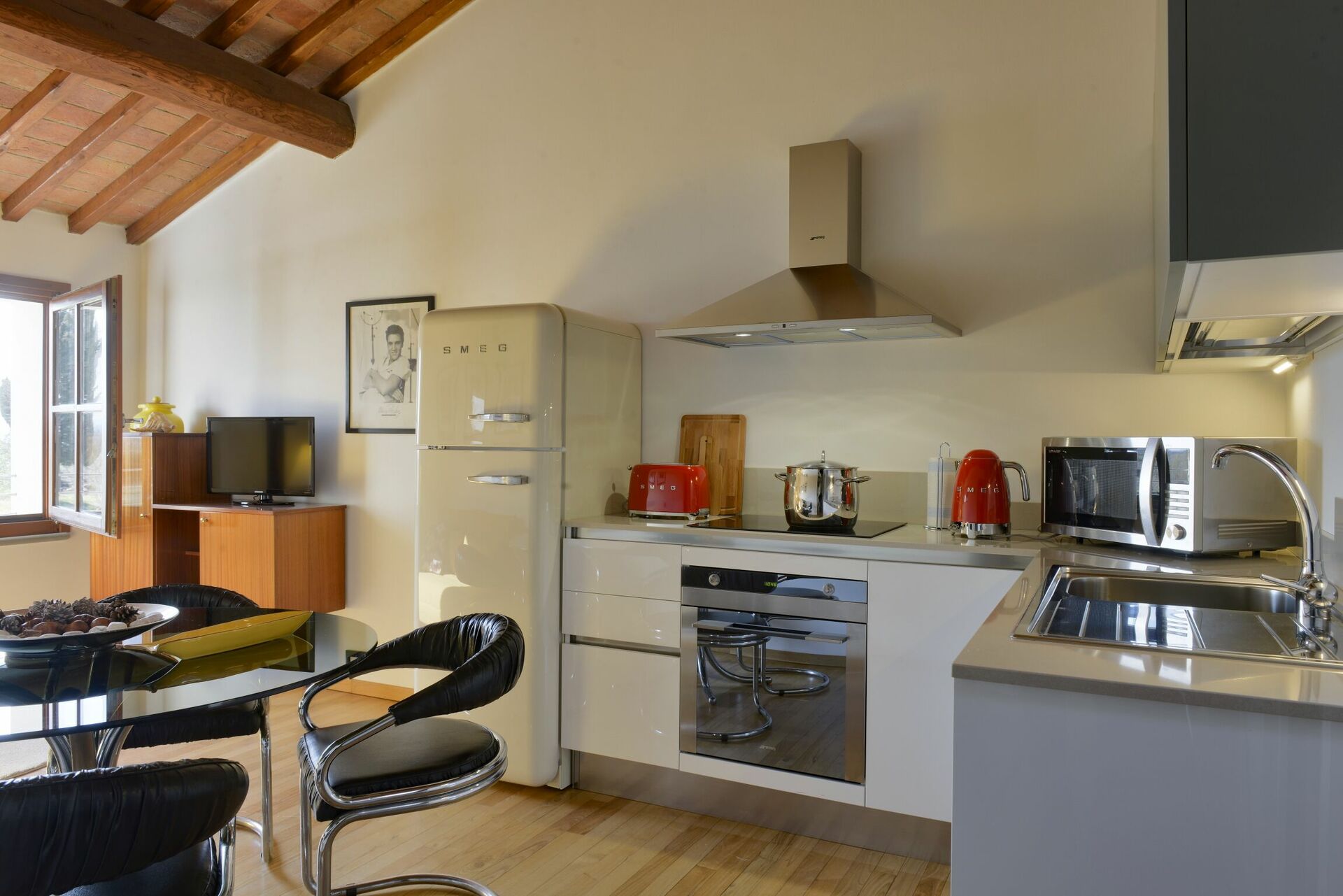 Ved ankomst vil I møde en fin ren velholdt ejendom med udsigt over bakkerne ideel til fredelig ferie i Toscana. Uanset hvordan I tilbringer dagene - med shopping, museumsbesøg, sightseeing eller bare ved at køre rundt på landet, så kan I slappe af med familie og venner ved poolen, når I kommer hjem, hvilket er en perfekt måde at afslutte endnu en dejlig dag på i Toscana. Hvis I nyder at lave mad til familie og venner så er der et veludstyret køkken inkluderet kaffemaskine, mikroovn, brødrister og køleskab, samt, , samt masser af service og bestik til op til tre personer. Hvis I foretrækker at spise 'al fresco', er der en fuldt møbleret have, hvor I kan nyde vejret, mens I spiser udendørs.