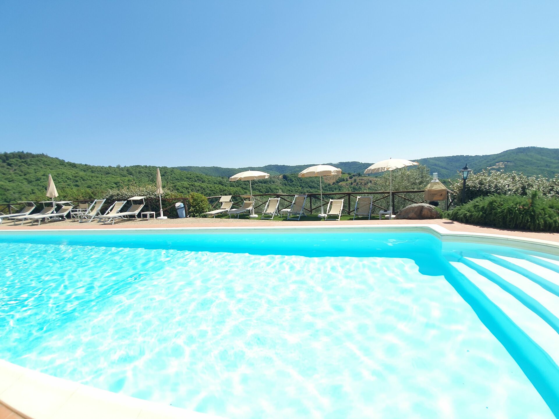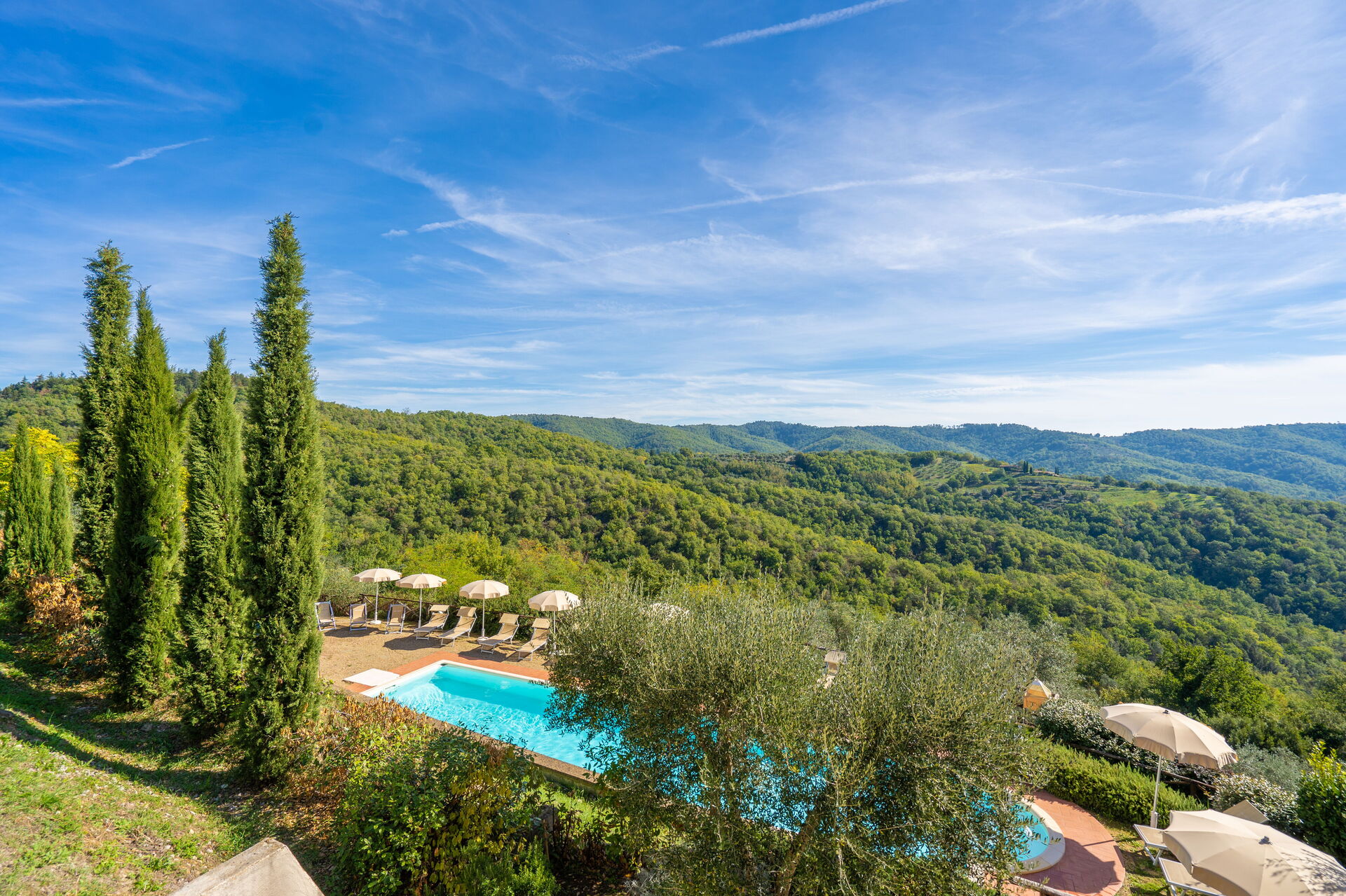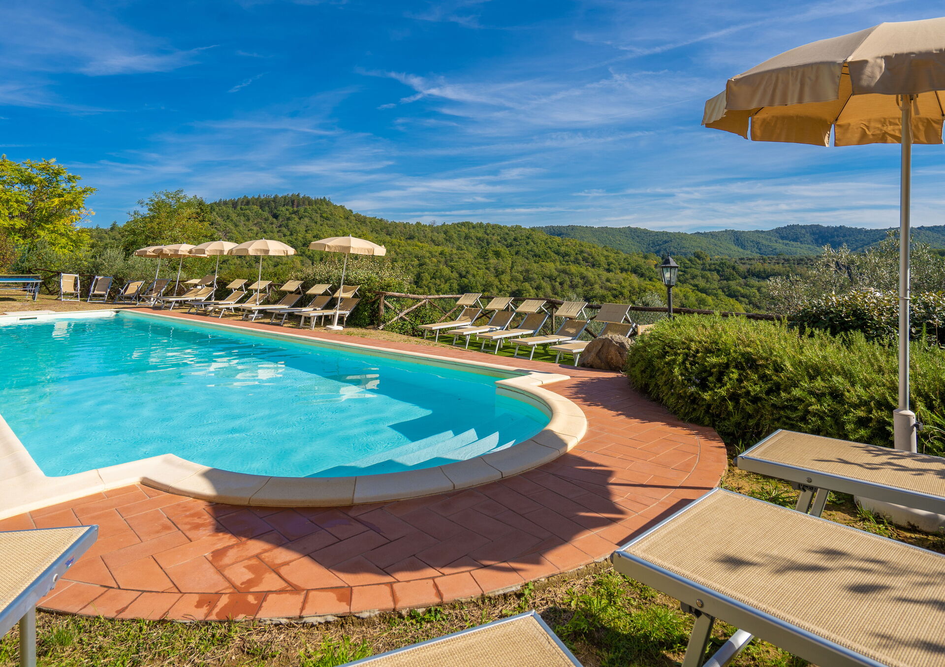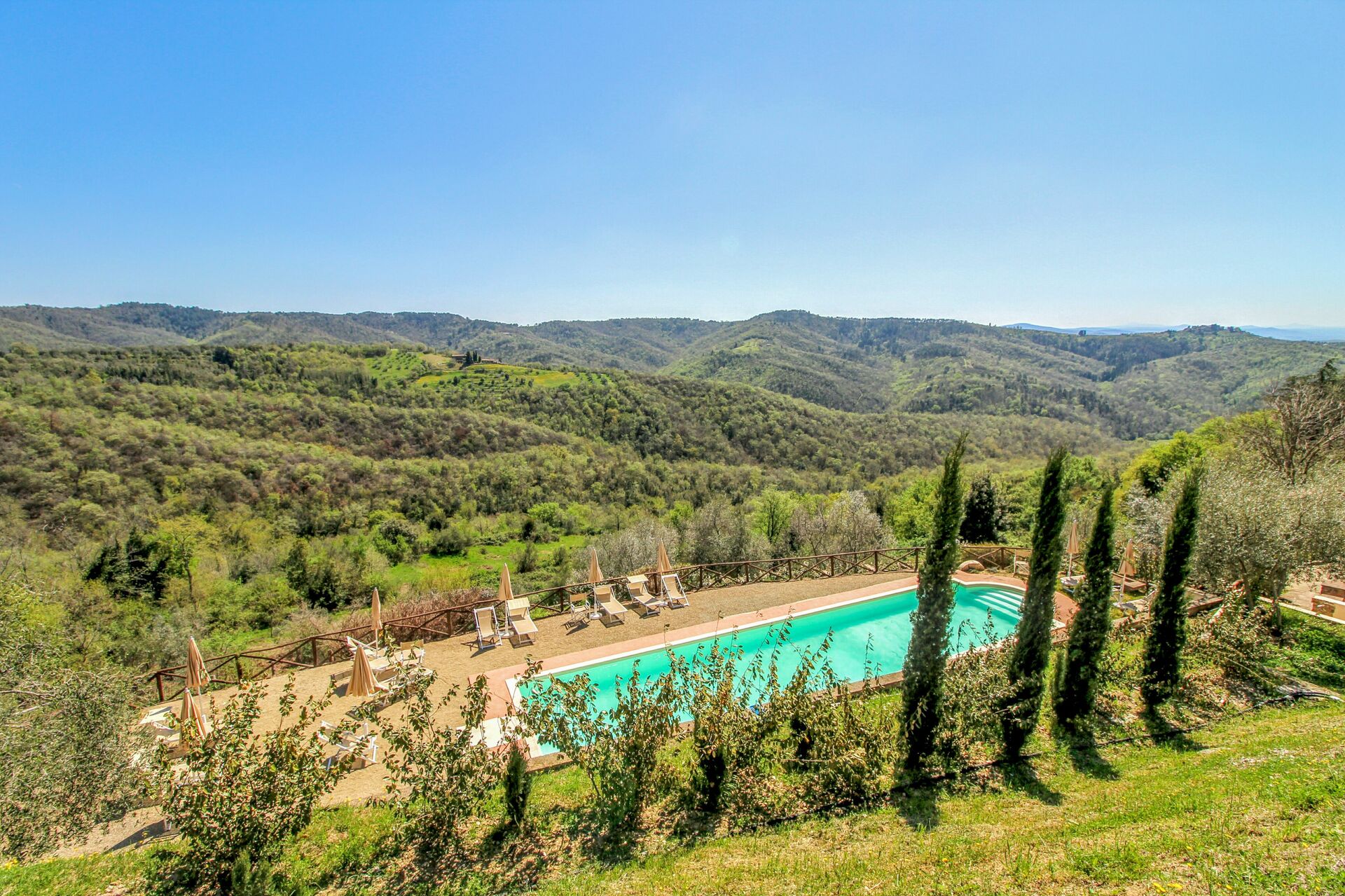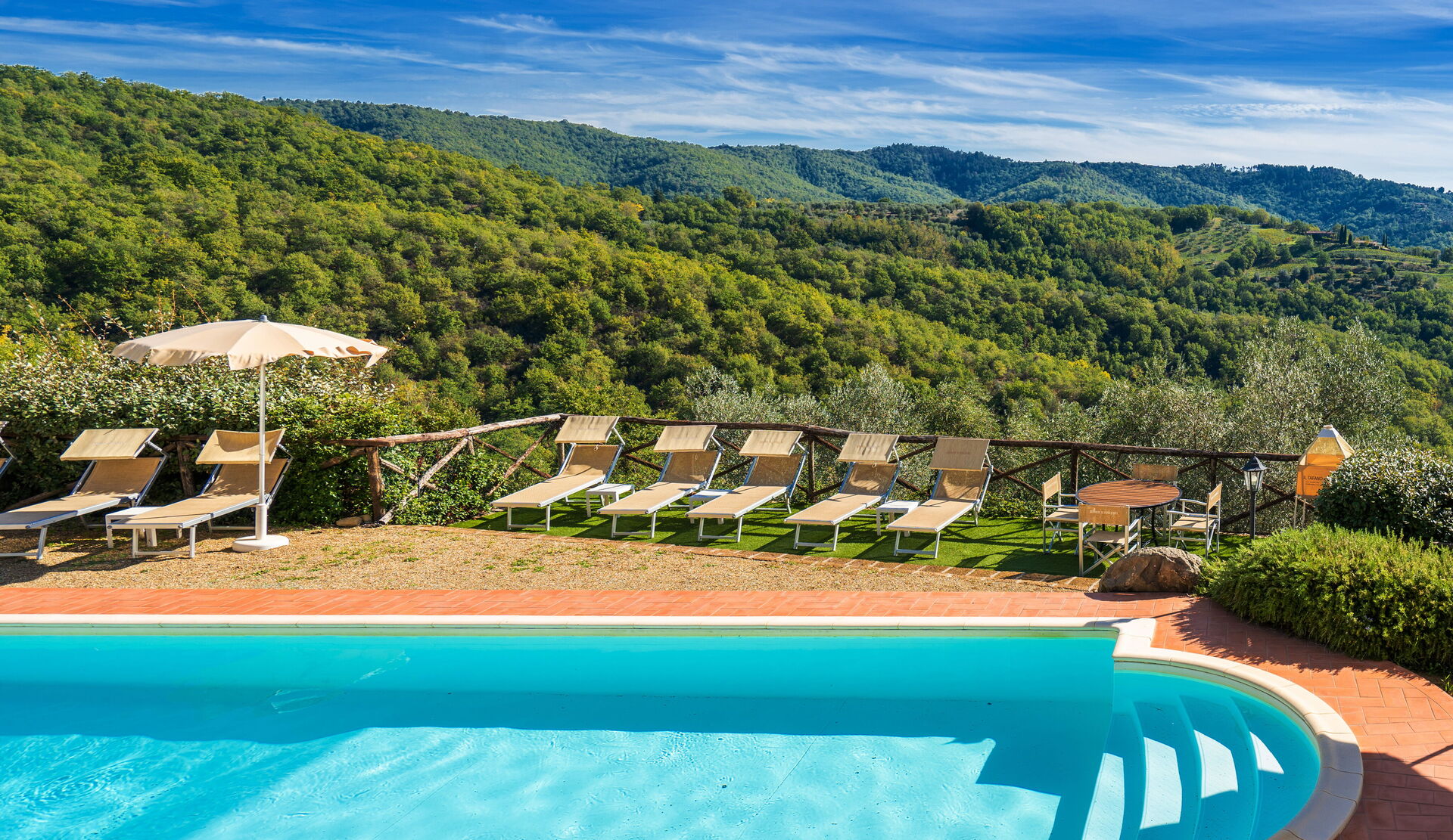 Ved ankomst vil I møde en fin ren velholdt ejendom med udsigt over bakkerne ideel til rolig ferie i Toscana. Til jeres store nydelse vil I finde en privat pool, hvor I kan køle ned, mens I nyder en dejlig kold drik efter en travl dag med shopping. At nyde et måltid med venner og familie er en stor del af den toskanske kultur. Benyt det velekviperede køkken til madlavning med lokale produkter, når du er på ferie. Køkkenet indeholder kaffemaskine, mikroovn, brødrister og køleskab, samt, masser af service og bestik til op til 22 personer. Spis 'al fresco' som en ægte toskaner. Den fuldt møblerede er det perfekte sted for at nyde sit måltid, familien og det dejlige toskanske vejr.