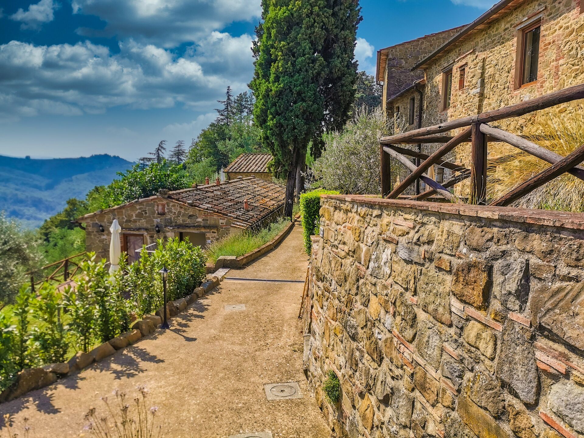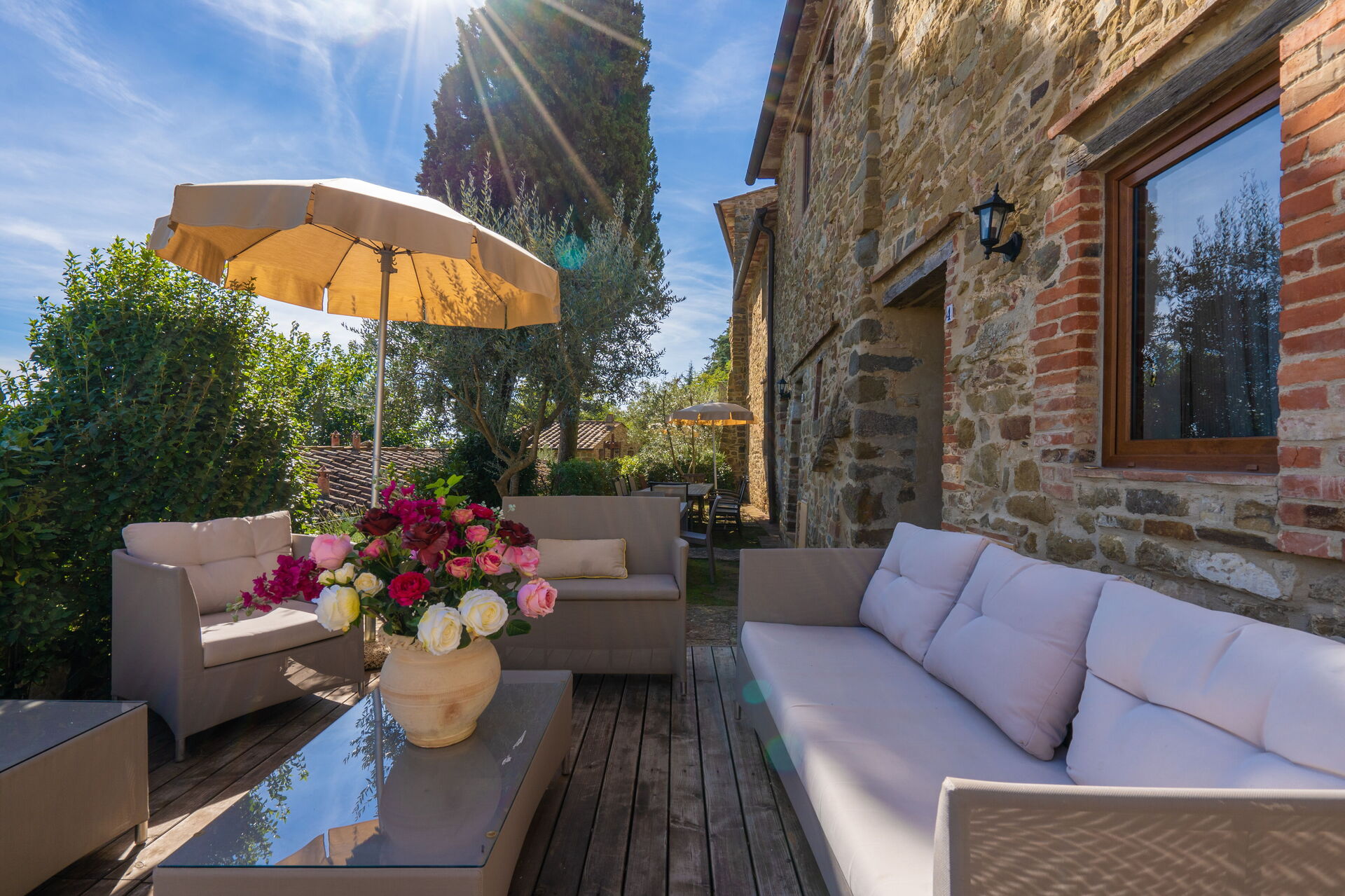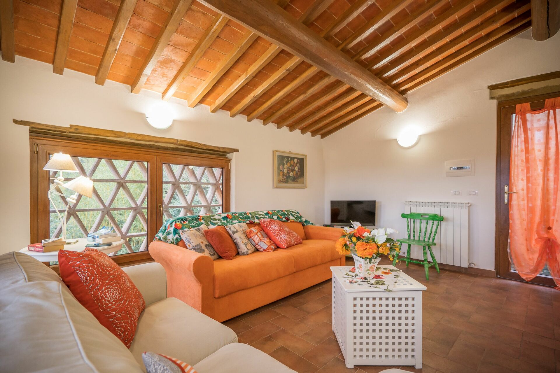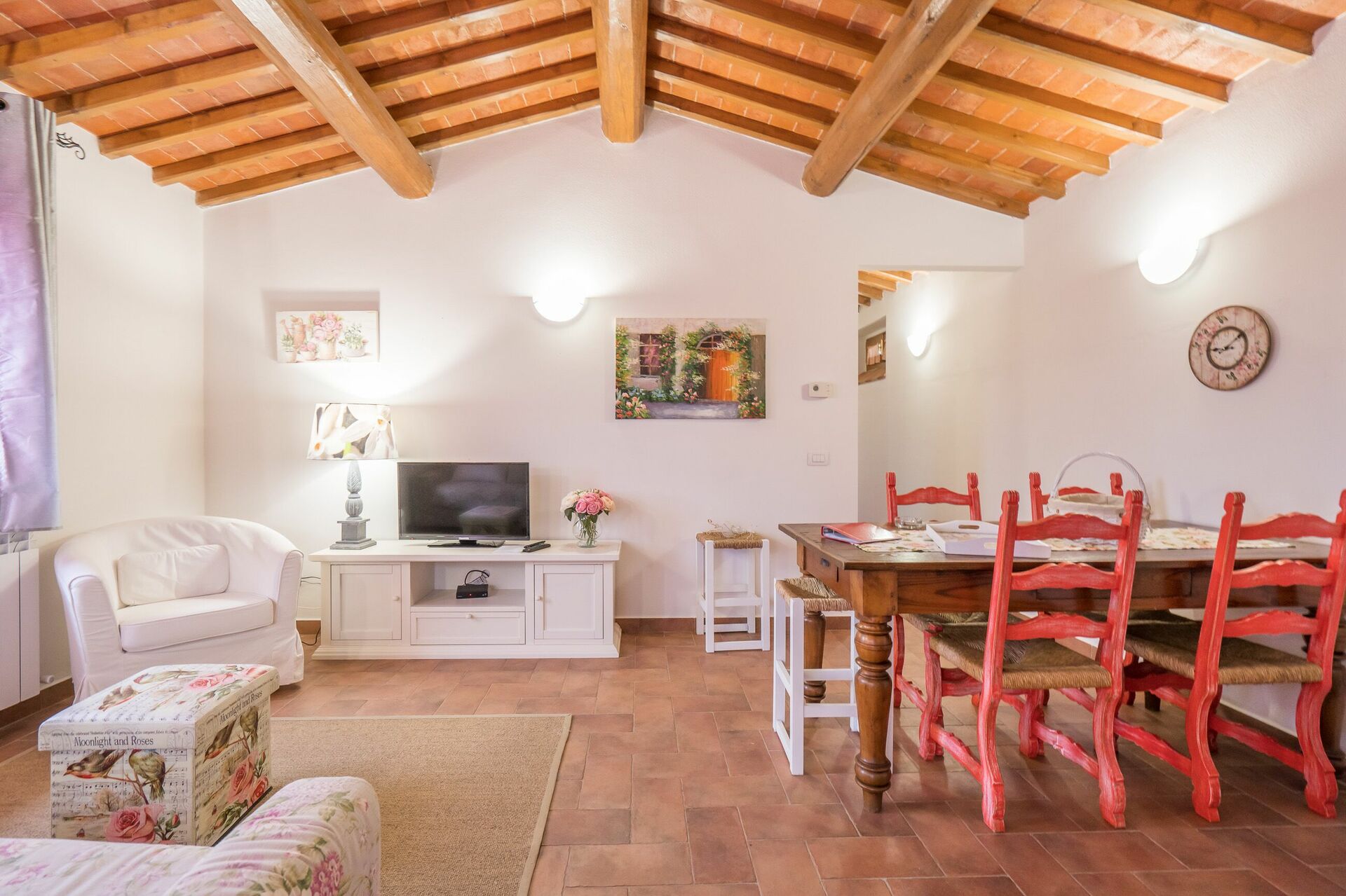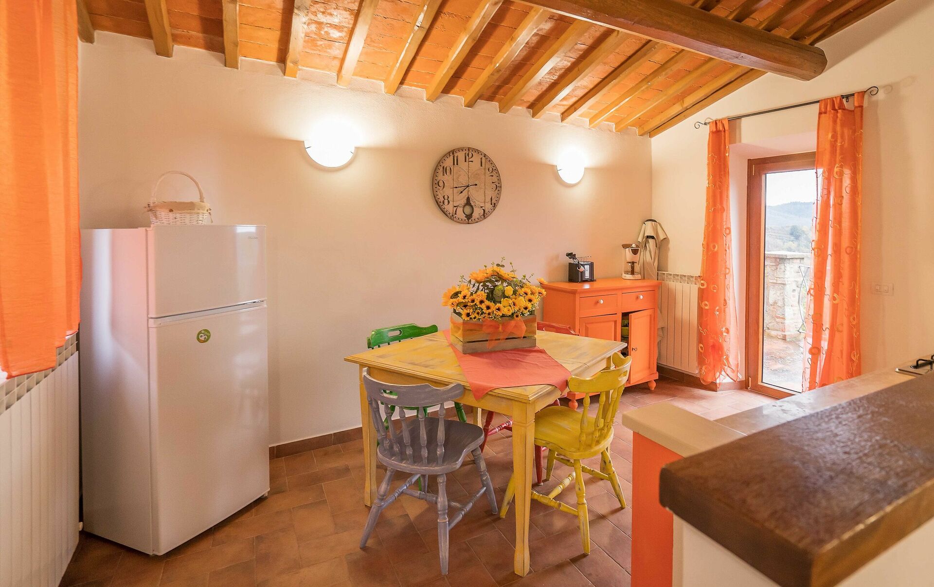 Ved ankomst vil I møde en fin ren velholdt ejendom med udsigt over bakkerne ideel til rolig ferie i Toscana. Til jeres store nydelse vil I finde en privat pool, hvor I kan køle ned, mens I nyder en dejlig kold drik efter en travl dag med shopping. At nyde et måltid med venner og familie er en stor del af den toskanske kultur. Benyt det velekviperede køkken til madlavning med lokale produkter, når du er på ferie. Køkkenet indeholder kaffemaskine, mikroovn, brødrister og køleskab, samt, masser af service og bestik til op til 22 personer. Spis 'al fresco' som en ægte toskaner. Den fuldt møblerede er det perfekte sted for at nyde sit måltid, familien og det dejlige toskanske vejr.