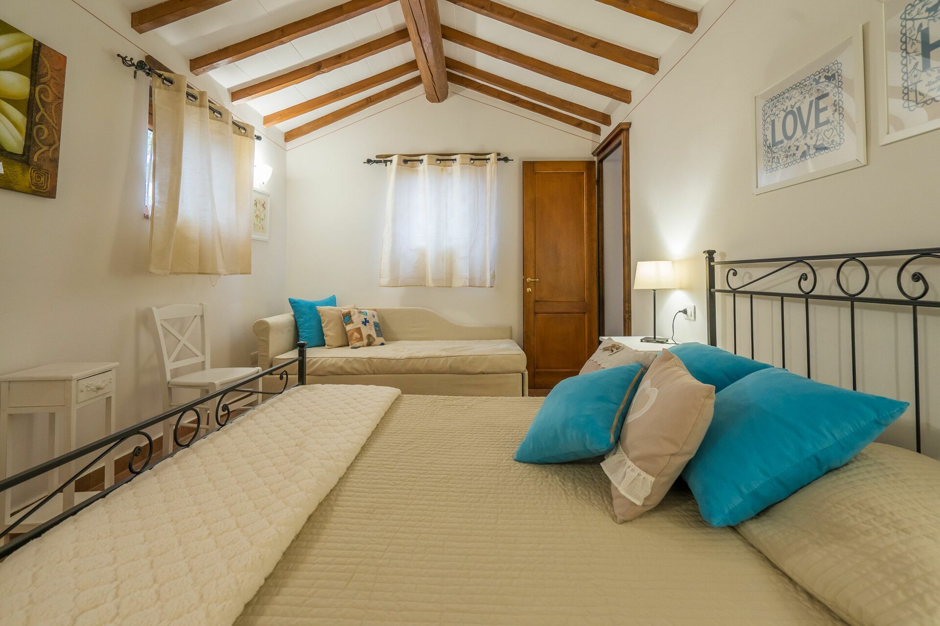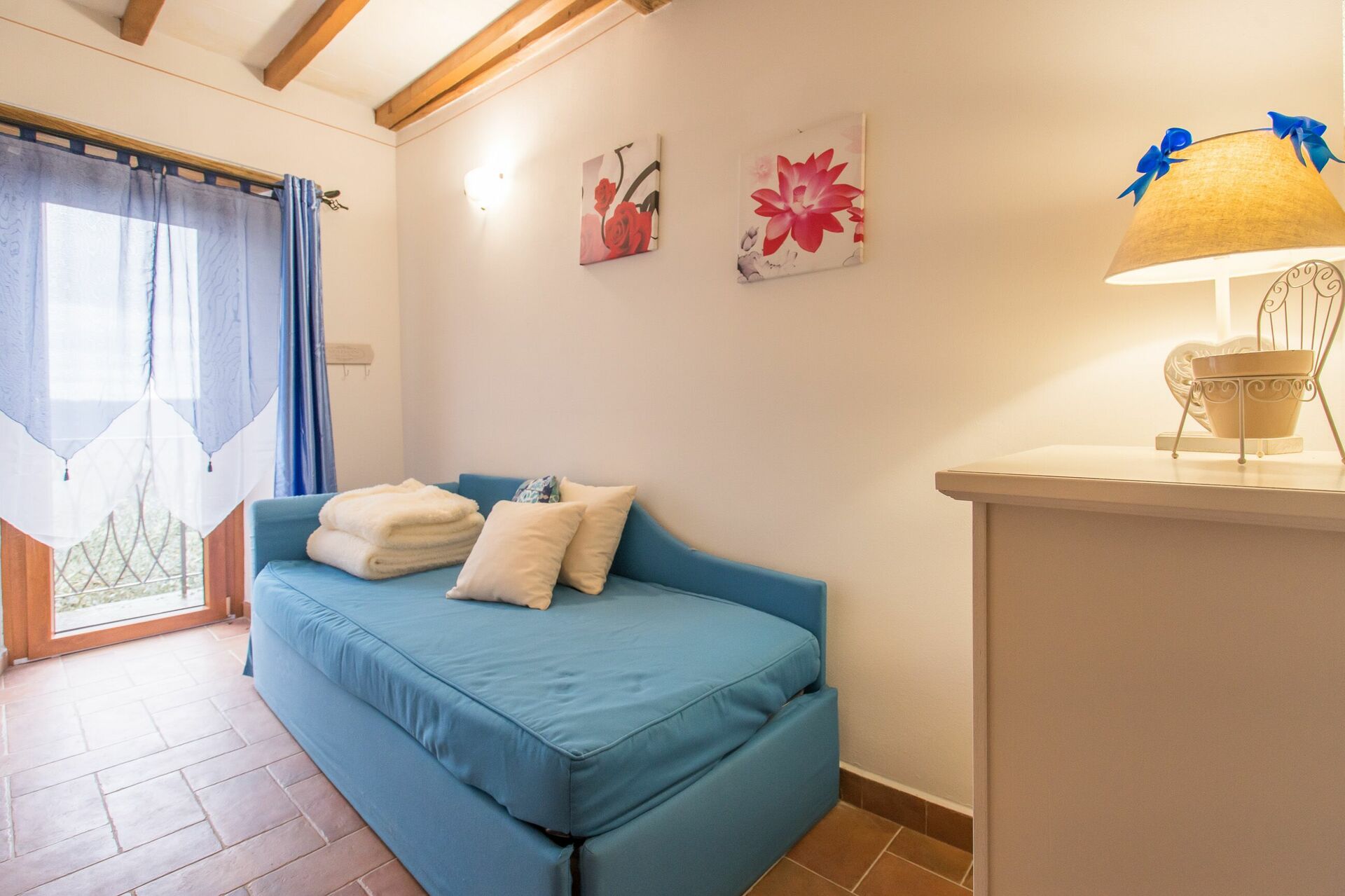 Soveværelse med bad 1: to enkeltsenge, WIFI internet, klimaanlæg, vask, wc, bidet, bruser, hårtørrer, udgang til gårdhave.