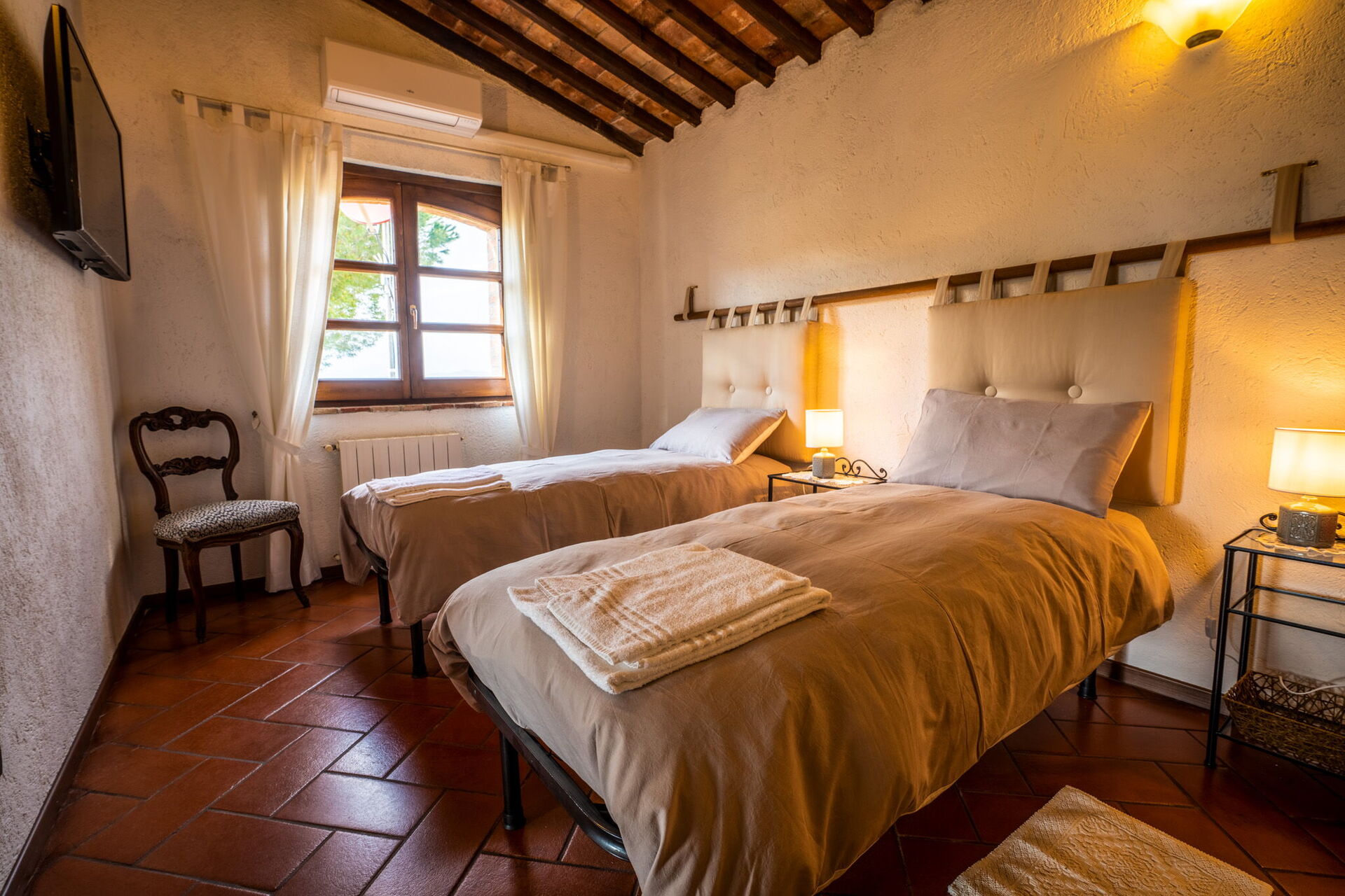 Soveværelse med bad (15 m2): to enkeltsenge, WIFI internet, klimaanlæg, myggenet, satellit tv, handikap ok, lænestol, vask, wc, bruser, hårtørrer, udgang til have.