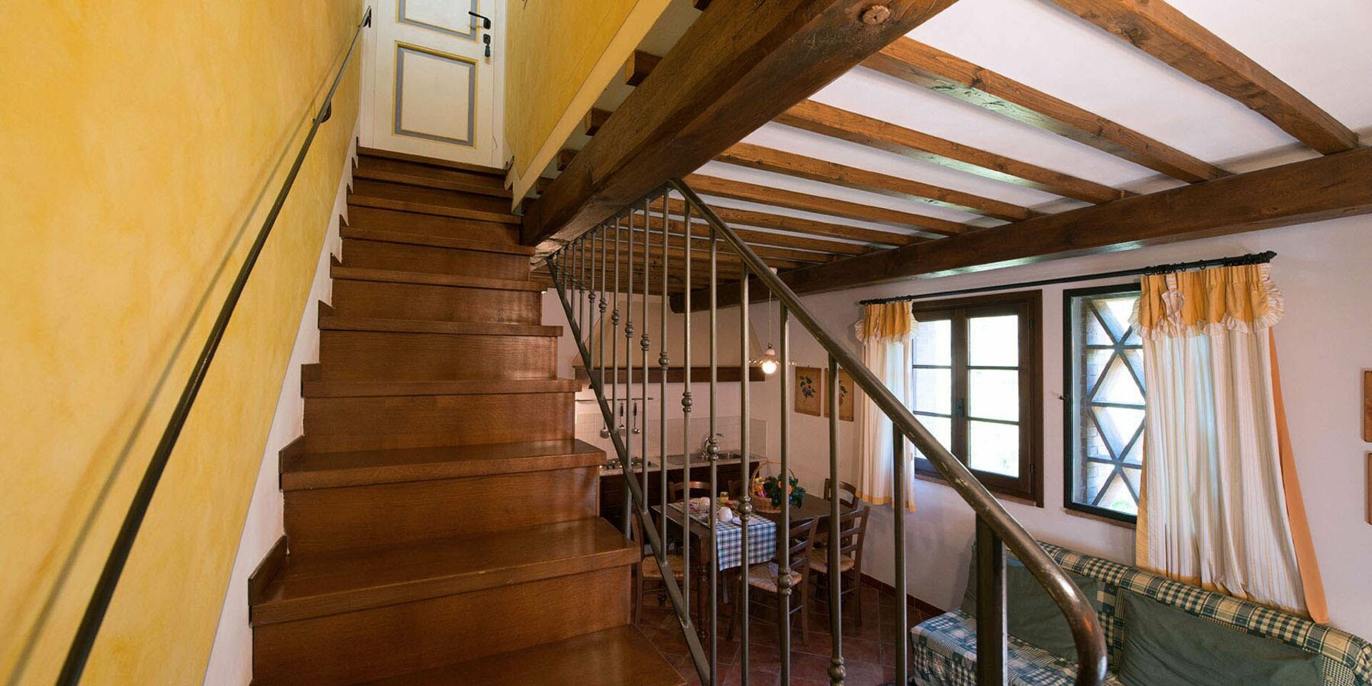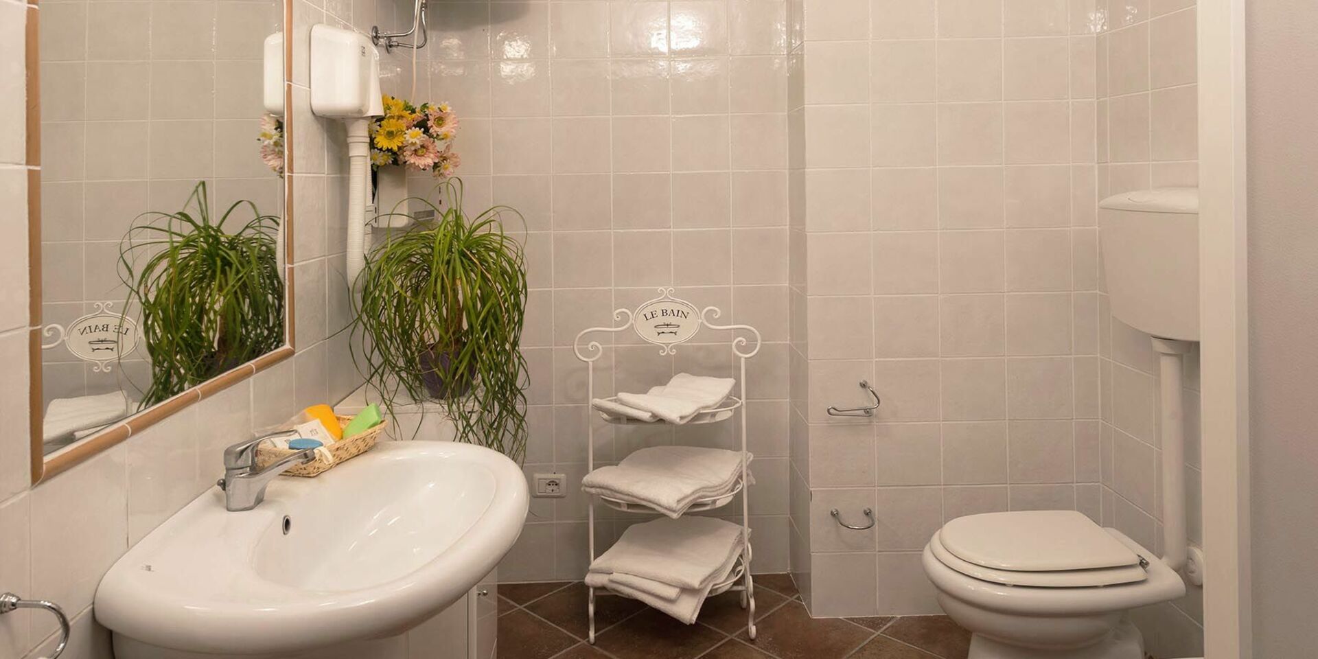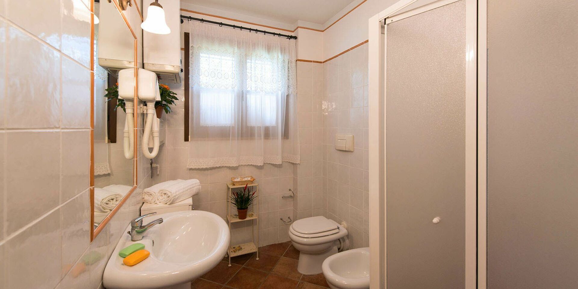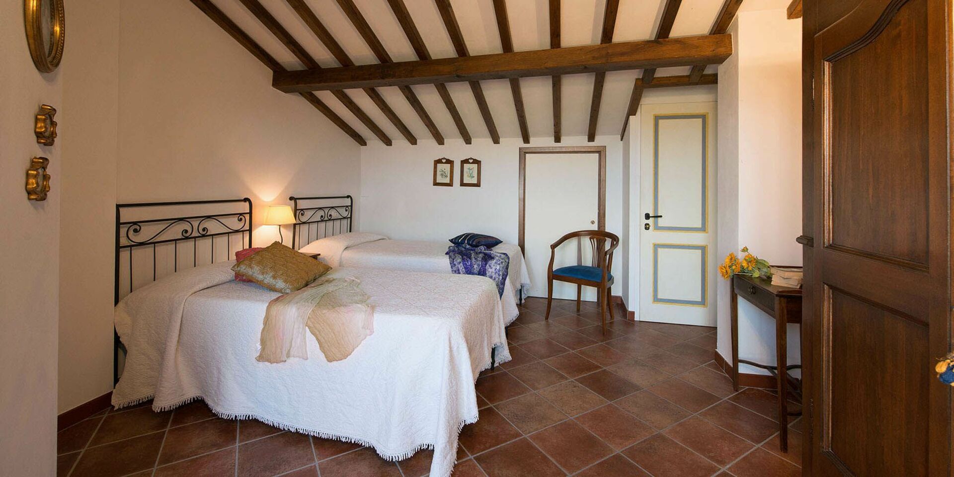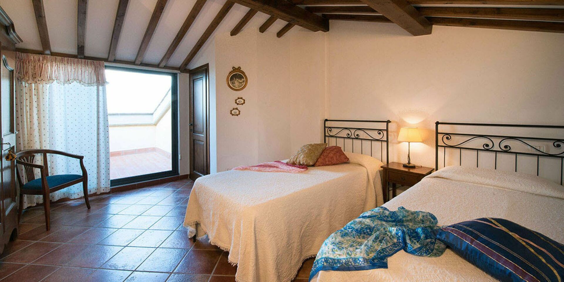 Første sal: soveværelse med to enkeltsenge og adgang til terrassen, badeværelse med bruser.