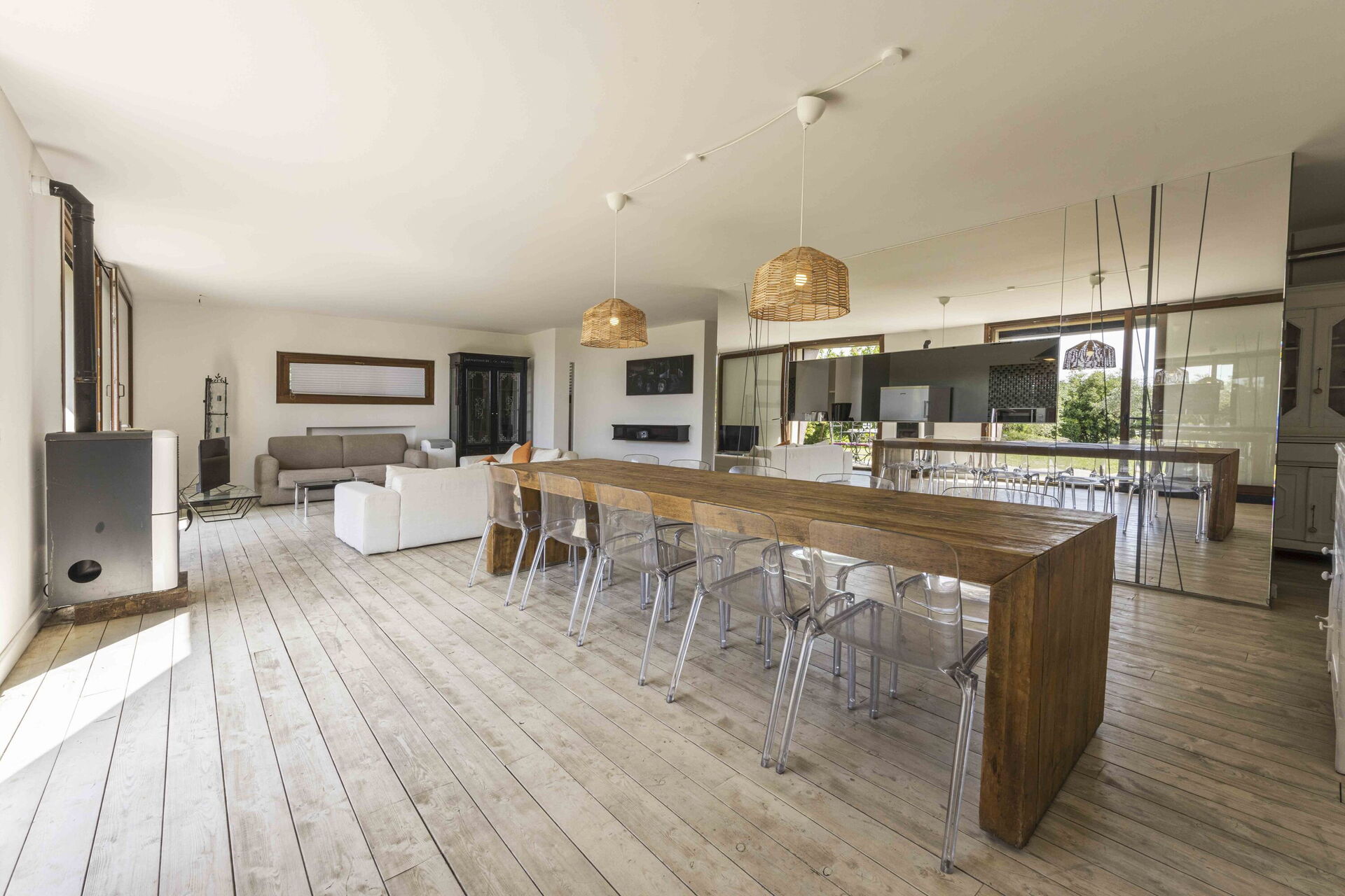 Køkken - stue: veludstyret køkken, spisebord (personer: 8), opvaskemaskine, køleskab, fryser, mikroovn, kogeplader, ovn, italiensk kaffemaskine, to sofaer, dobbelt sovesofa, WIFI internet, klimaanlæg, tv, udgang til have.
