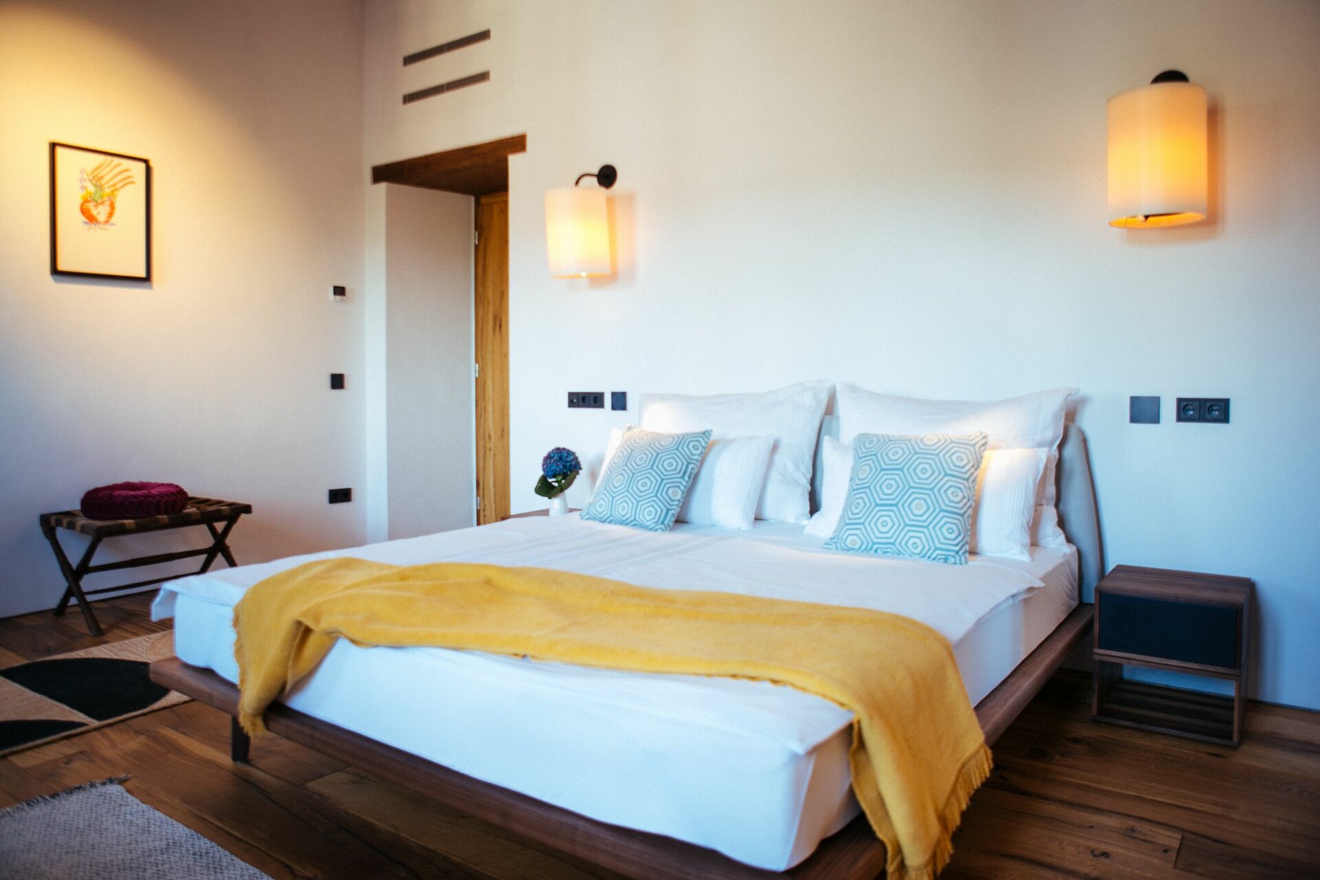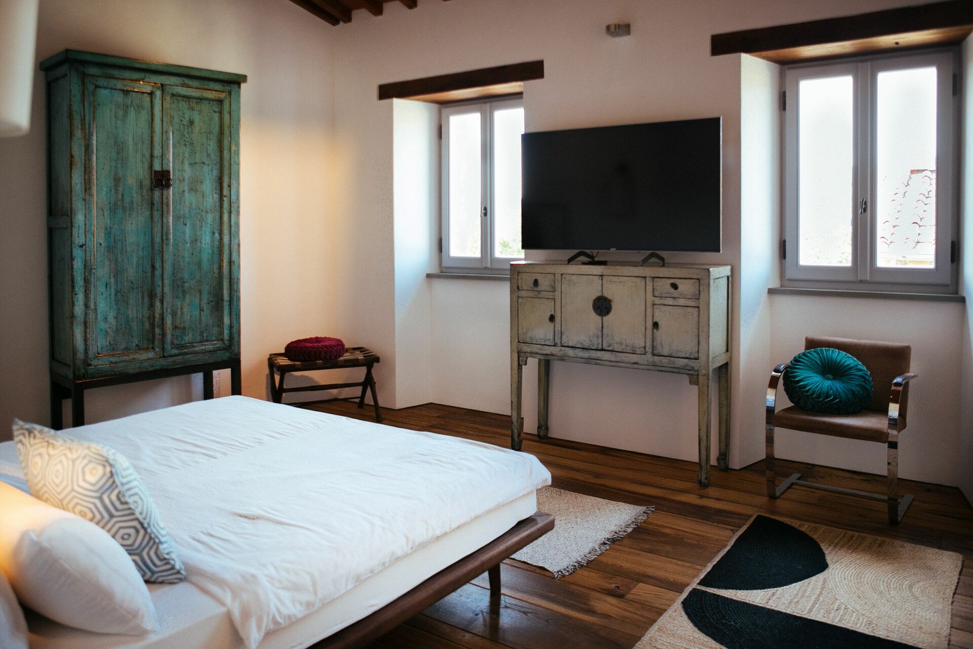 Soveværelse med bad 1: dobbeltseng, WIFI internet, klimaanlæg, tv, lænestol, vask, wc, bidet, bruser.