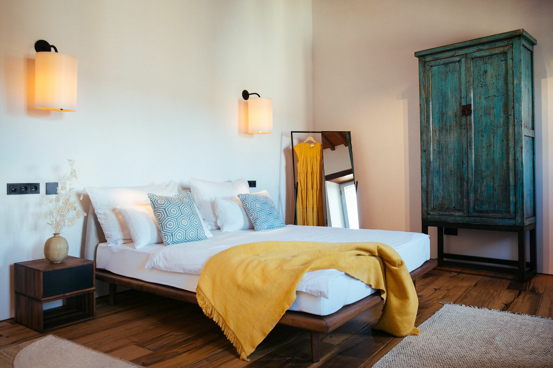 Soveværelse med bad 2: dobbeltseng, WIFI internet, klimaanlæg, tv, lænestol, vask, wc, bidet, bruser.