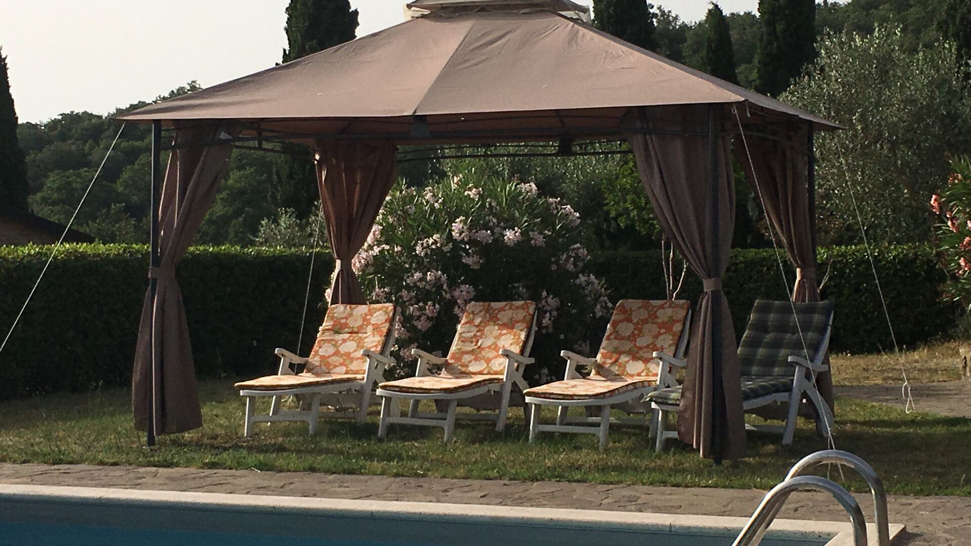 Have: swimmingpool (bredde: 5m, længde: 12m, max. dybde: 1.5m, min. dybde: 1.5m, udendørs), swimmingpool, bruser, grill, kamin, spisebord (personer: 25), havepavillon, havemøbel, terrassemøbel, liggestol, lukket ejendom.