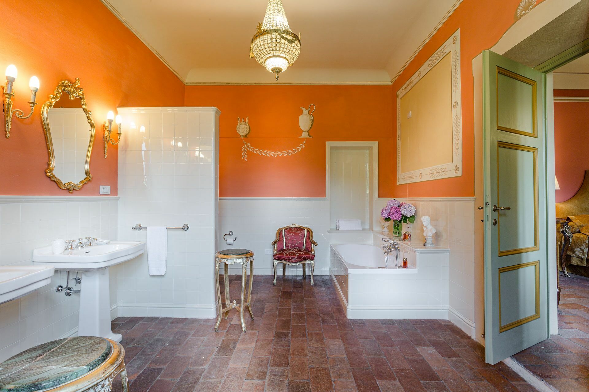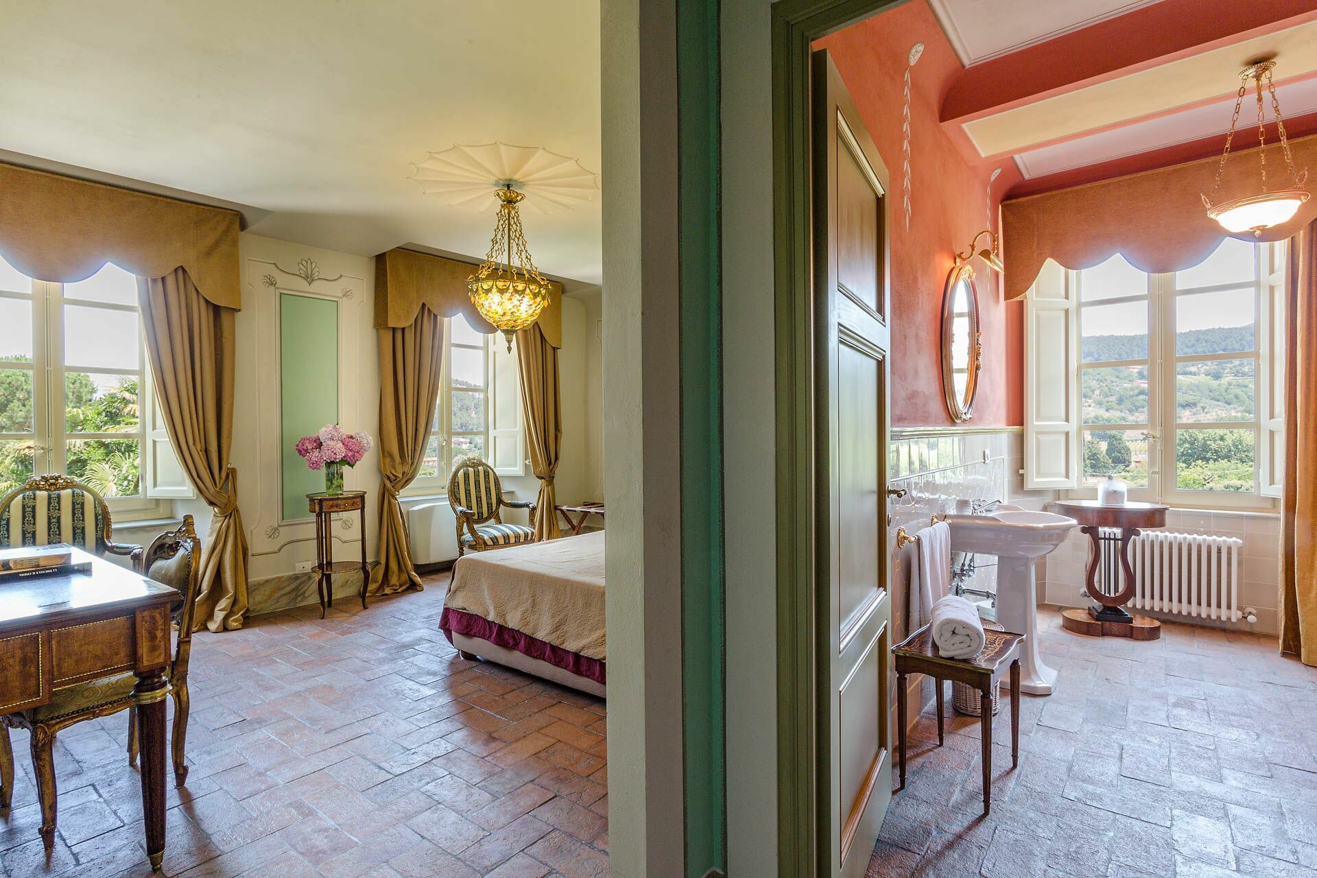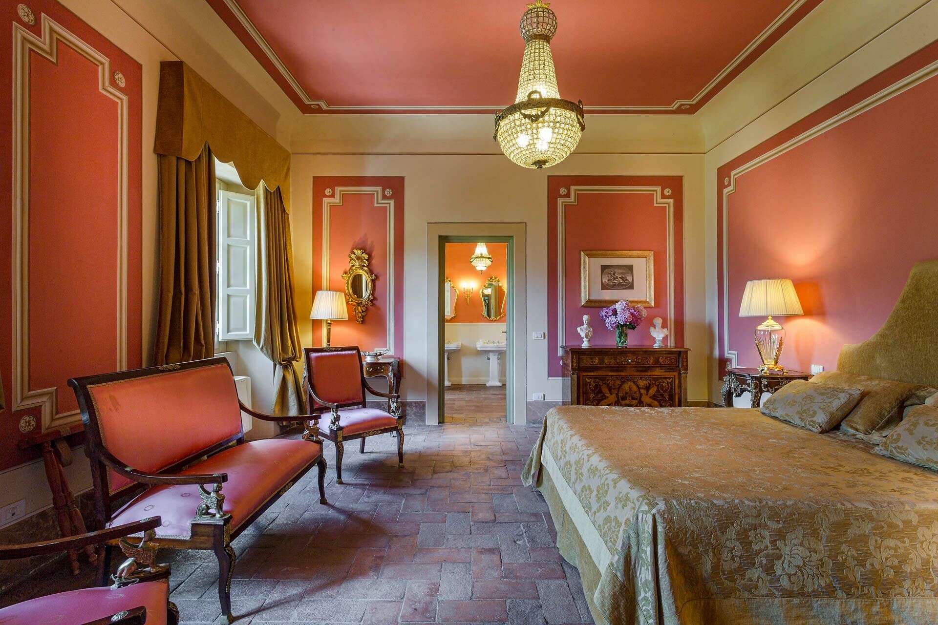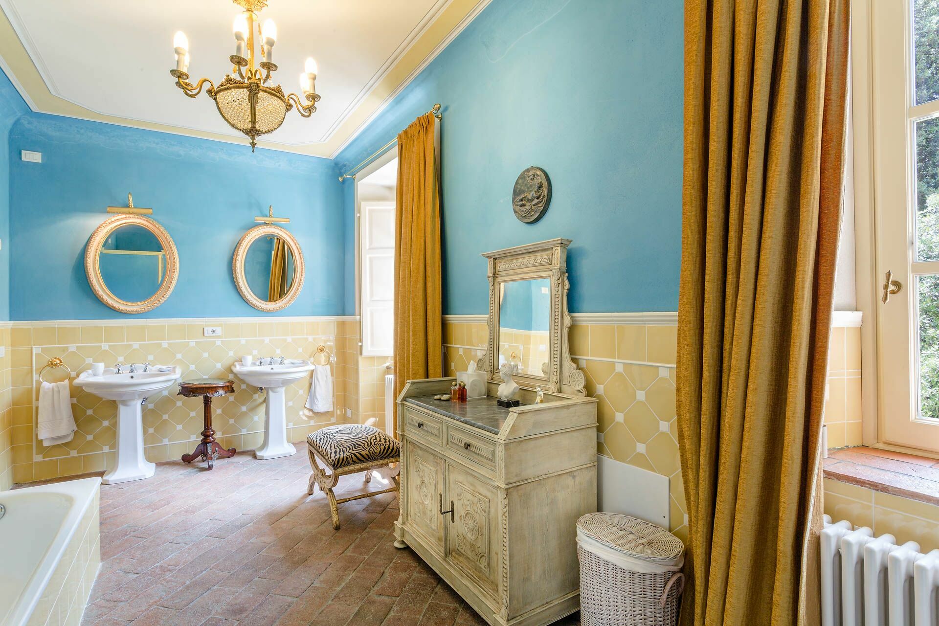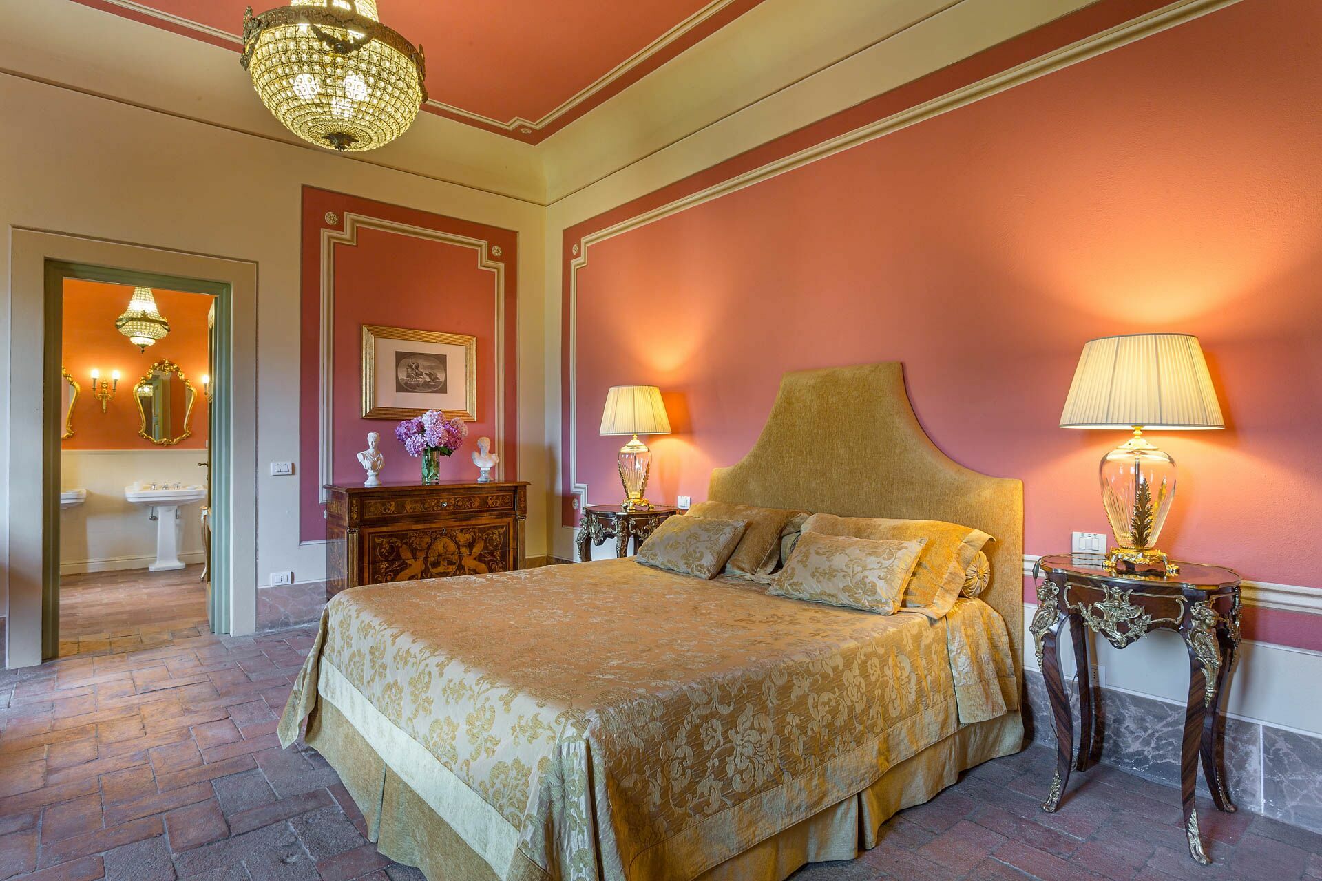 Soveværelse med bad 1: dobbeltseng (bredde: 1.7m, længde: 2m), klimaanlæg, dobbeltvask, wc, bidet, badekar, bruser.