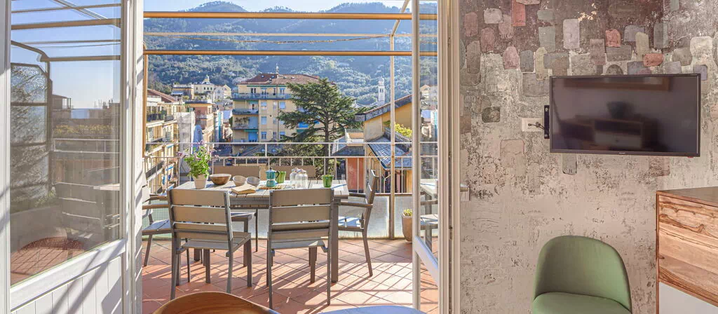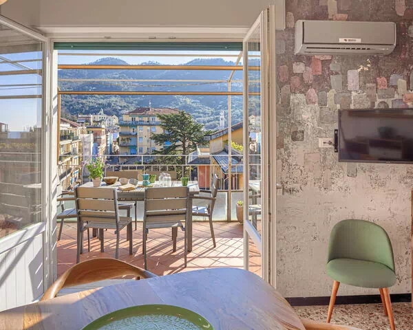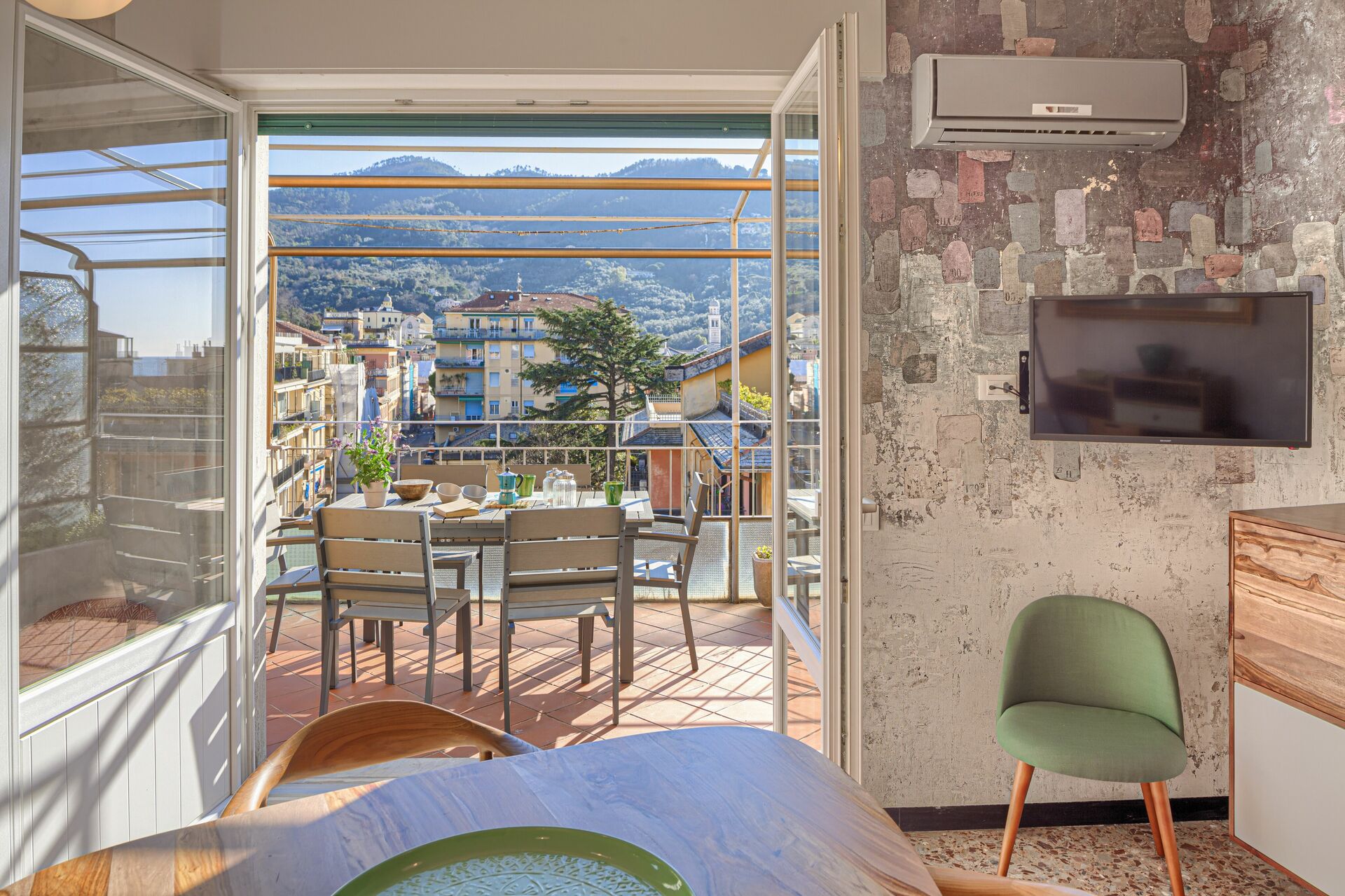 Den store terrasse, med udsigt over byen Levanto, har et bord og stole til udendørs spisning.