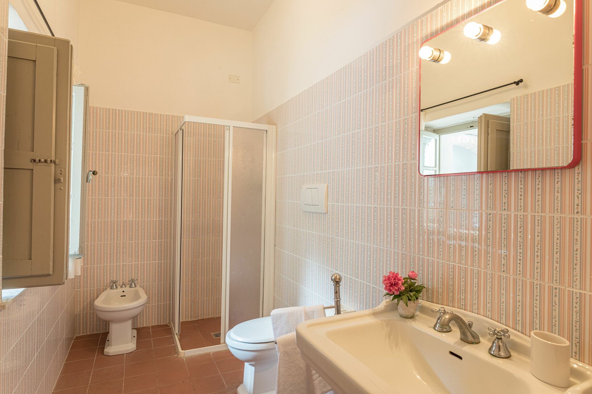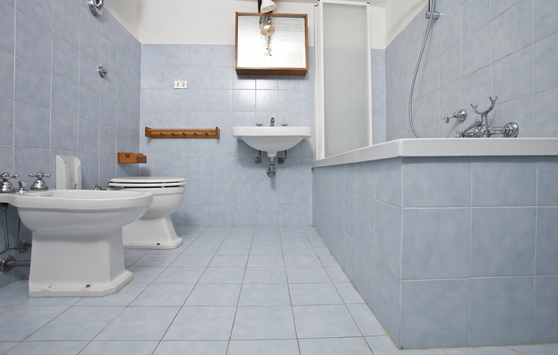 Badeværelse: vask, wc, bidet, bruser, hårtørrer.