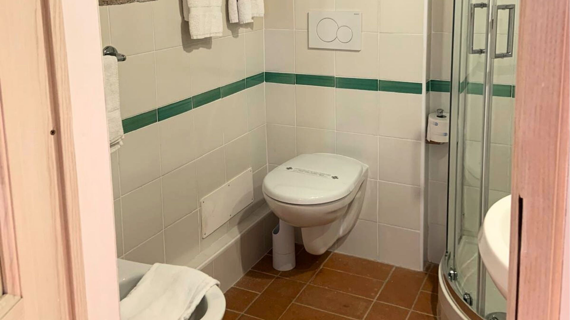 Badeværelse: vask, wc, bidet, bruser, hårtørrer.