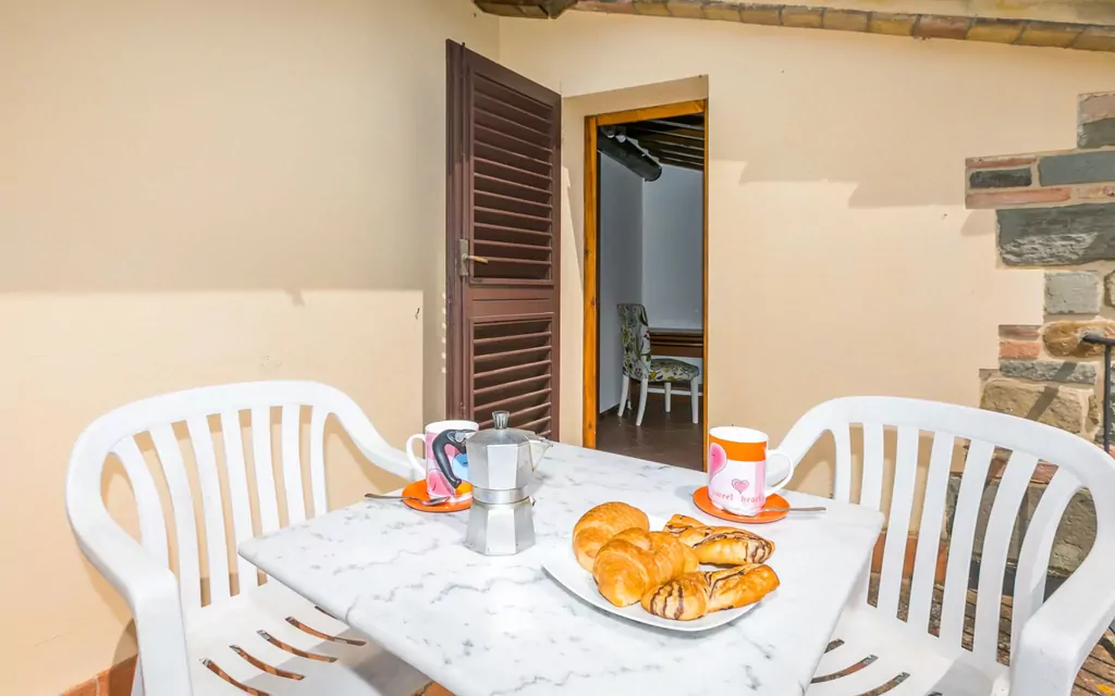 Stueetagen består af et kombineret opholdsværelse og soveområde med en dobbeltsovesofa, en pejs med åbent ildsted og et spisebord. Køkkenet råder over en ovn, en gaskomfur med 4 gasbrændere, en brødrister, en elkedel og en elektrisk kaffemaskine. Første sal indeholder et soveværelse med dobbeltseng samt et ekstra værelse med en enkelteng på 80 cm × 190 cm. Badeværelset på denne etage er udstyret med bruser, bidet og WC. Natursten på gulvene giver interiøret et karakteristisk og elegant præg. Fra første sal fører en udgang direkte til en møbleret terrasse og patio med udsigt til omliggende landsdele.