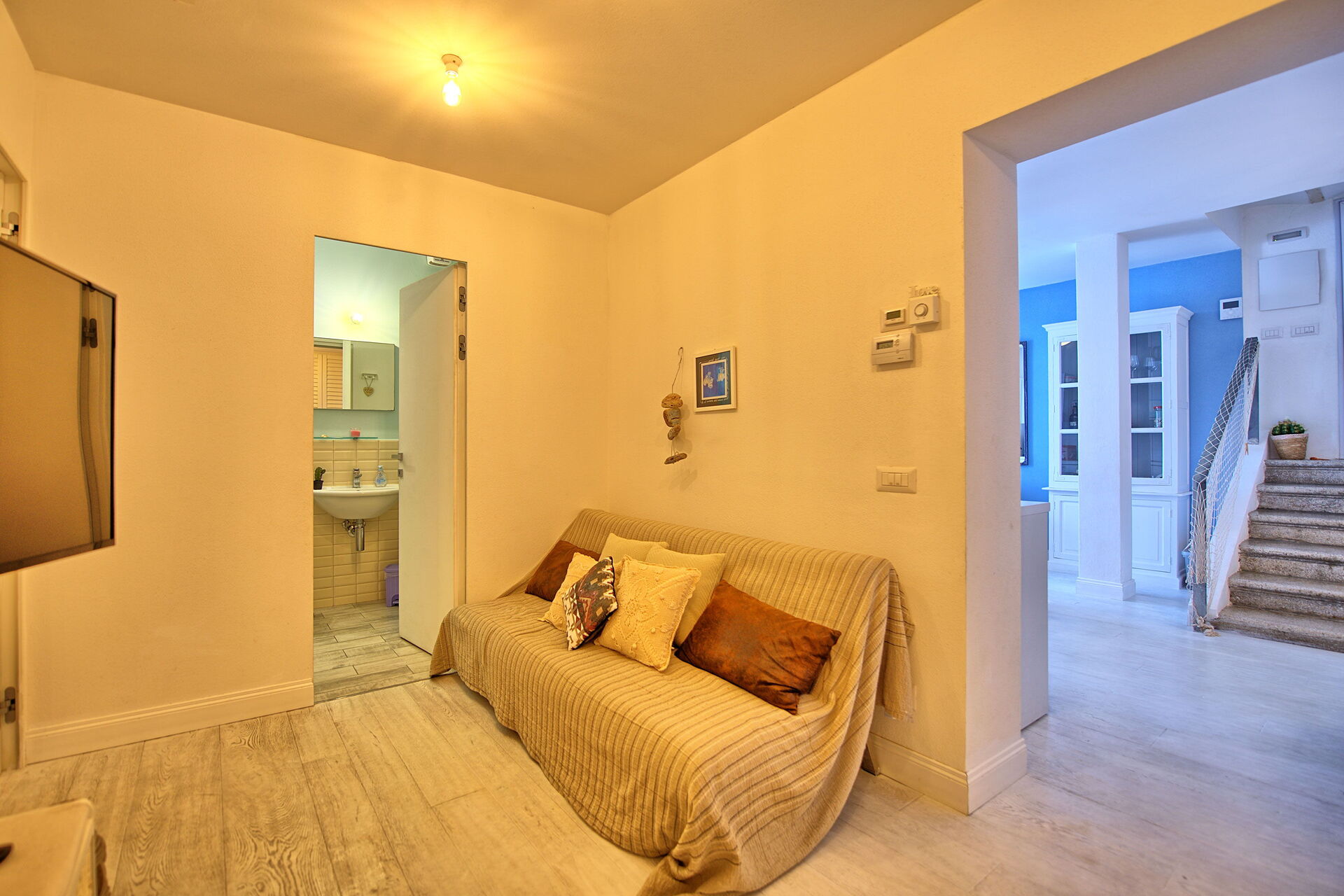 En gammel bygning er opdelt i 4 lejligheder og Casa Riva har en indgang i stueetagen og seks trin ned. Lejligheden har en god temperatur selv om sommeren.