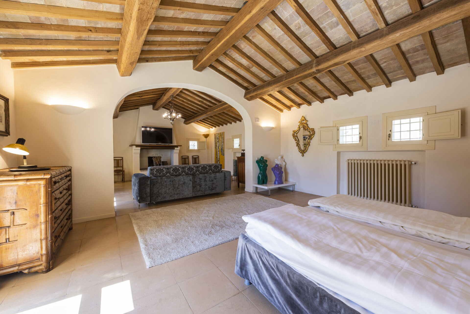 Soveværelse med bad: dobbeltseng, WIFI internet, klimaanlæg, tv, sofa, vask, wc, bidet, bruser.