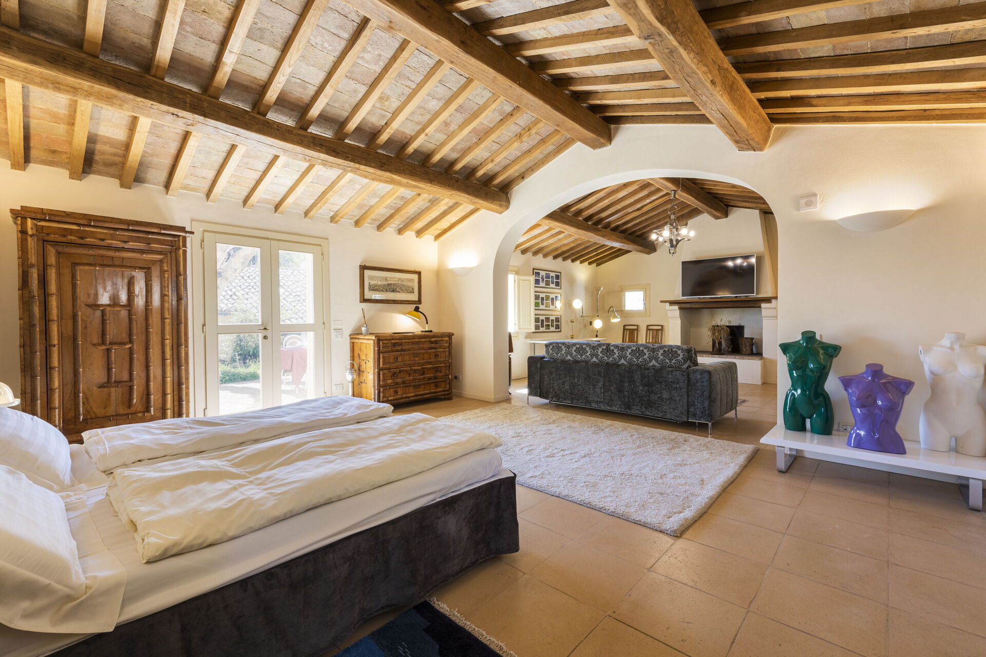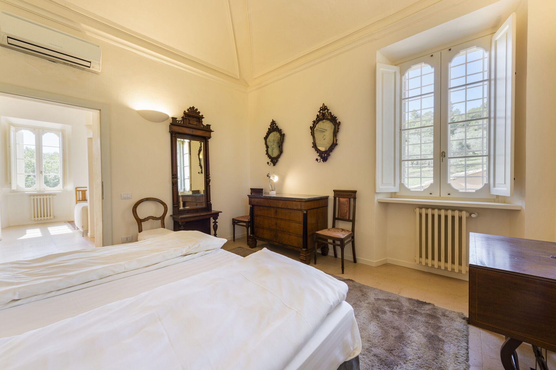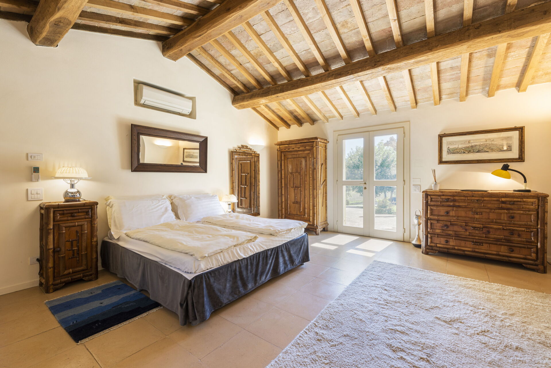 Soveværelse med bad: dobbeltseng, dobbelt sovesofa, WIFI internet, klimaanlæg, tv, vask, wc, bidet, bruser, udgang til have.