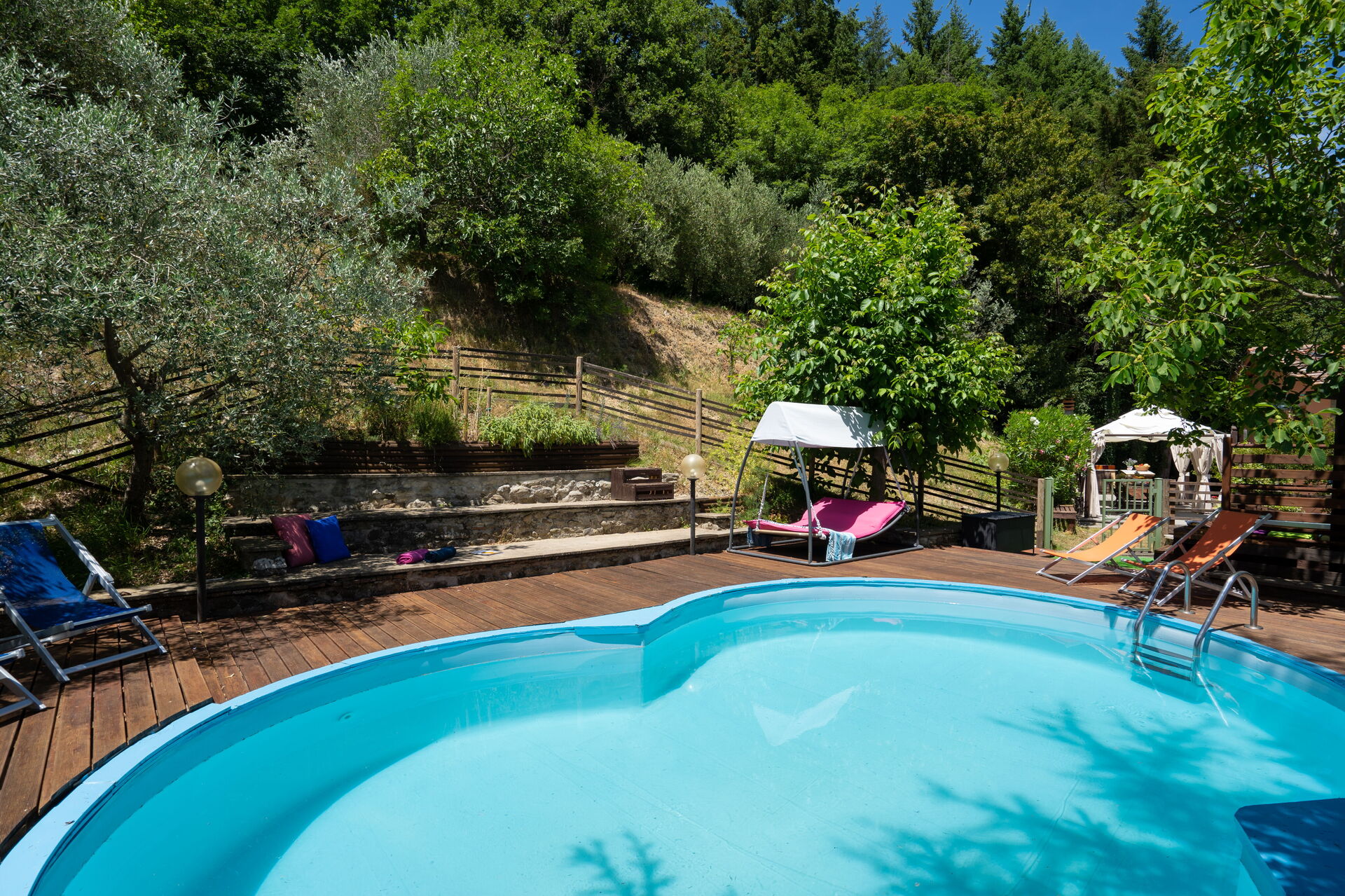 Når I ankommer, vil I møde en flot ren velholdt ejendom med udsigt over bakkerne perfekt til behagelig ferie i Toscana. Efter en hektisk dag med shopping, er det dejligt at nyde lidt tid med venner og familie ved kanten af poolen med et glas vin - det er en perfekt måde at køle ned på sidst på dagen. Til jeres store nydelse er der på ejendommen barbecue og jacuzzi. At spise med venner og familie er en stor del af den toskanske kultur. Benyt det velekviperede køkken til madlavning med lokale produkter, når du er på ferie. Køkkenet indeholder kaffemaskine, mikroovn, brødrister og køleskab, samt, masser af service og bestik til op til otte personer. Spis 'al fresco' som en ægte toskaner. Den fuldt møblerede veranda er det ideele sted for at nyde sit måltid, familien og det dejlige toskanske vejr.