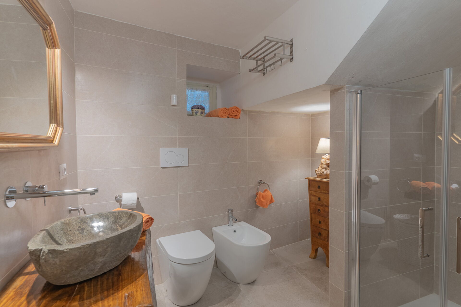 Badeværelse 2: vask, wc, bidet, bruser.