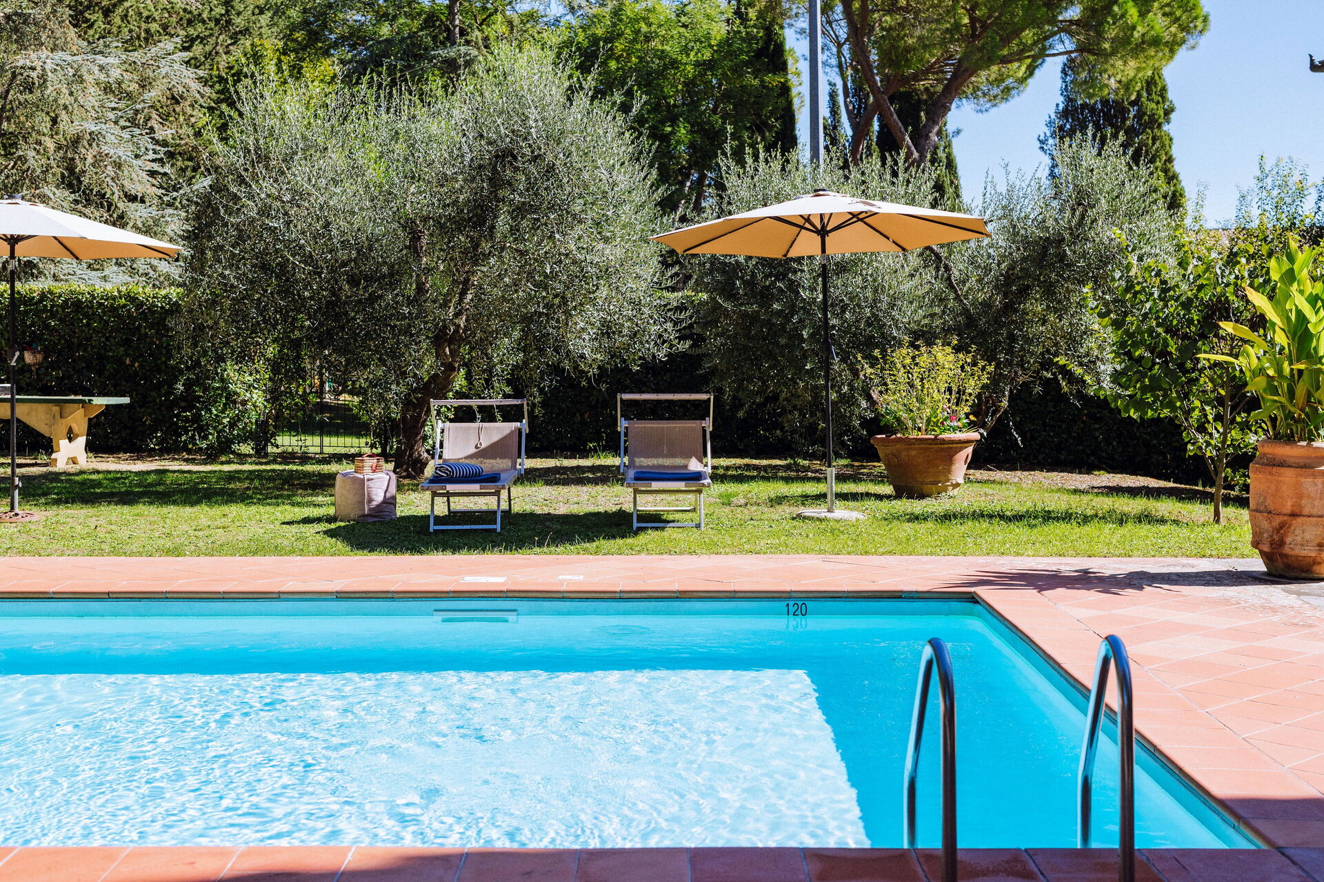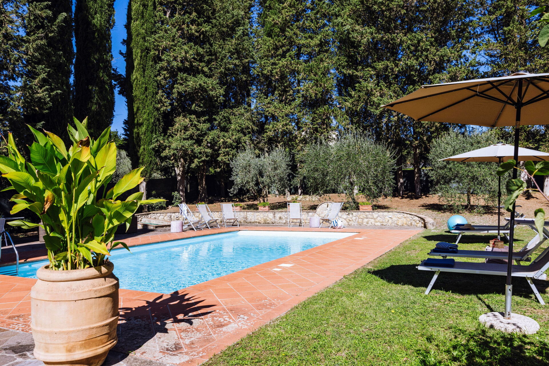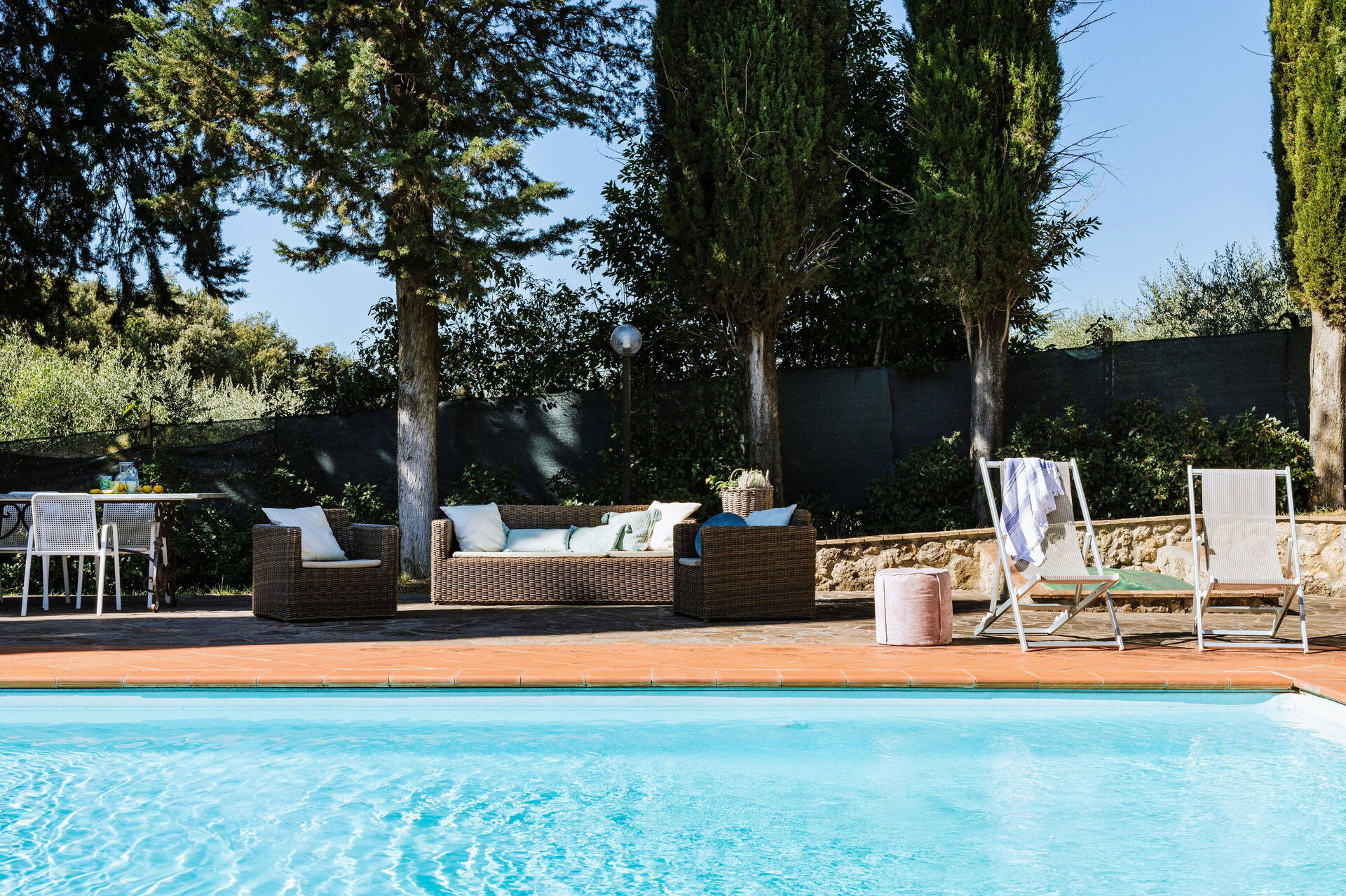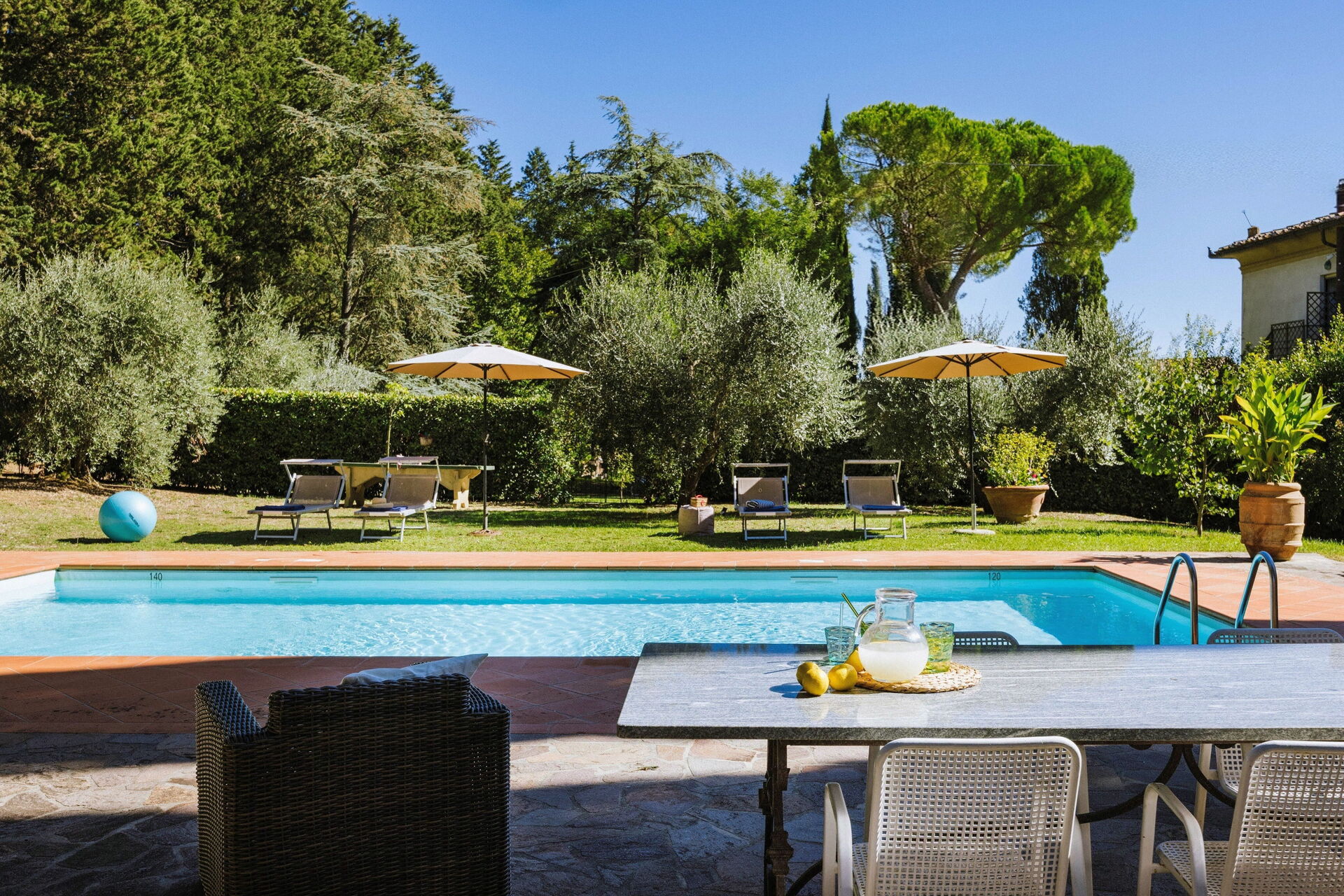 Ved ankomst vil I møde en fin ren velholdt ejendom med udsigt over bakkerne ideel til behagelig ferie i Toscana. Uanset hvordan I tilbringer dagene - med museumsbesøg, sightseeing, shopping eller bare ved at køre rundt på landet, så kan I slappe af med familie og venner ved poolen, når I kommer hjem, hvilket er en perfekt måde at afslutte endnu en dejlig dag på i Toscana. Til jeres store nydelse er der på ejendommen legeplads, gårdhave og barbecue. Hvis I nyder at lave mad til familie og venner så er der et veludstyret køkken inkluderet kaffemaskine, mikroovn, brødrister, komfur og køleskab, samt, , samt masser af service og bestik til op til 14 personer.