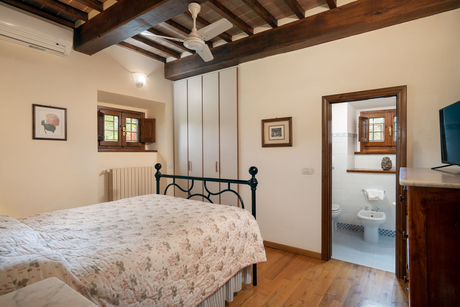 Soveværelse med bad: dobbeltseng, WIFI internet, klimaanlæg, vask, wc, bidet, bruser, hårtørrer.