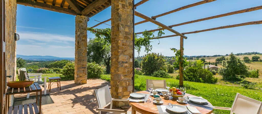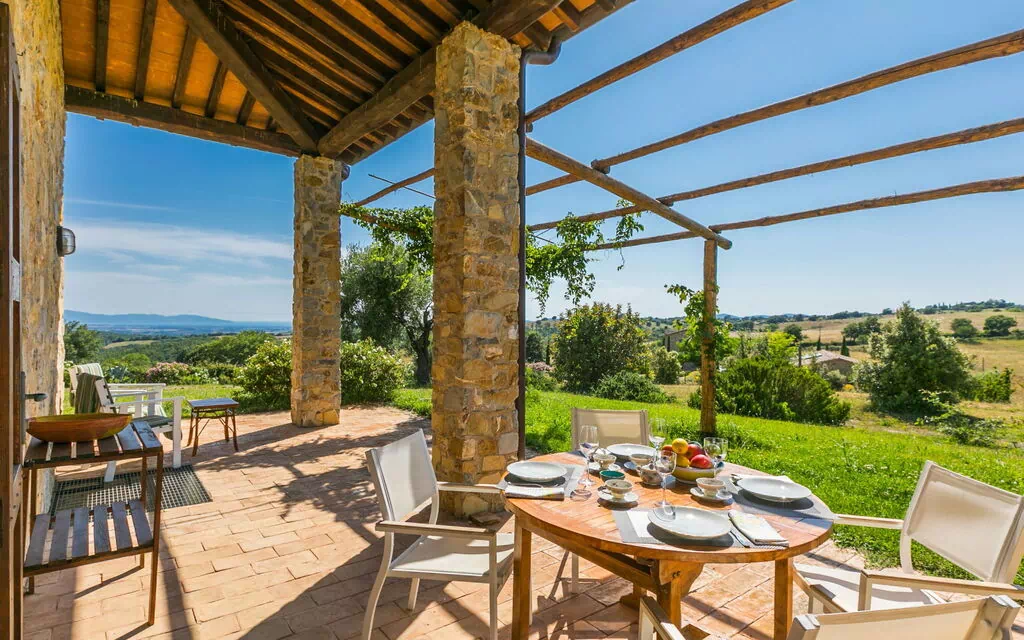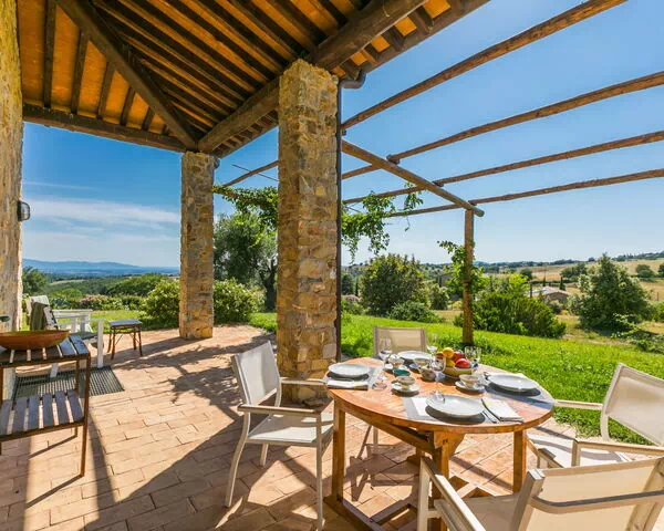 Haven på 500 m² med frodig græsplæne udgør et intimt og roligt område til afslapning, og gæster har adgang til den større 7 hektar stor fælles ejendom. En pergola tilbyder skygge og er velegnet til udendørs spisning eller afslapning, og haven er udstyret med møbler. Terrassen giver udsigt over det toscanske landskab mod Argentario og Giglio Island. Vandrestier begynder blot 50 meter fra huset og gør det muligt at udforske de omgivende bakker og enge direkte fra ejendommen.