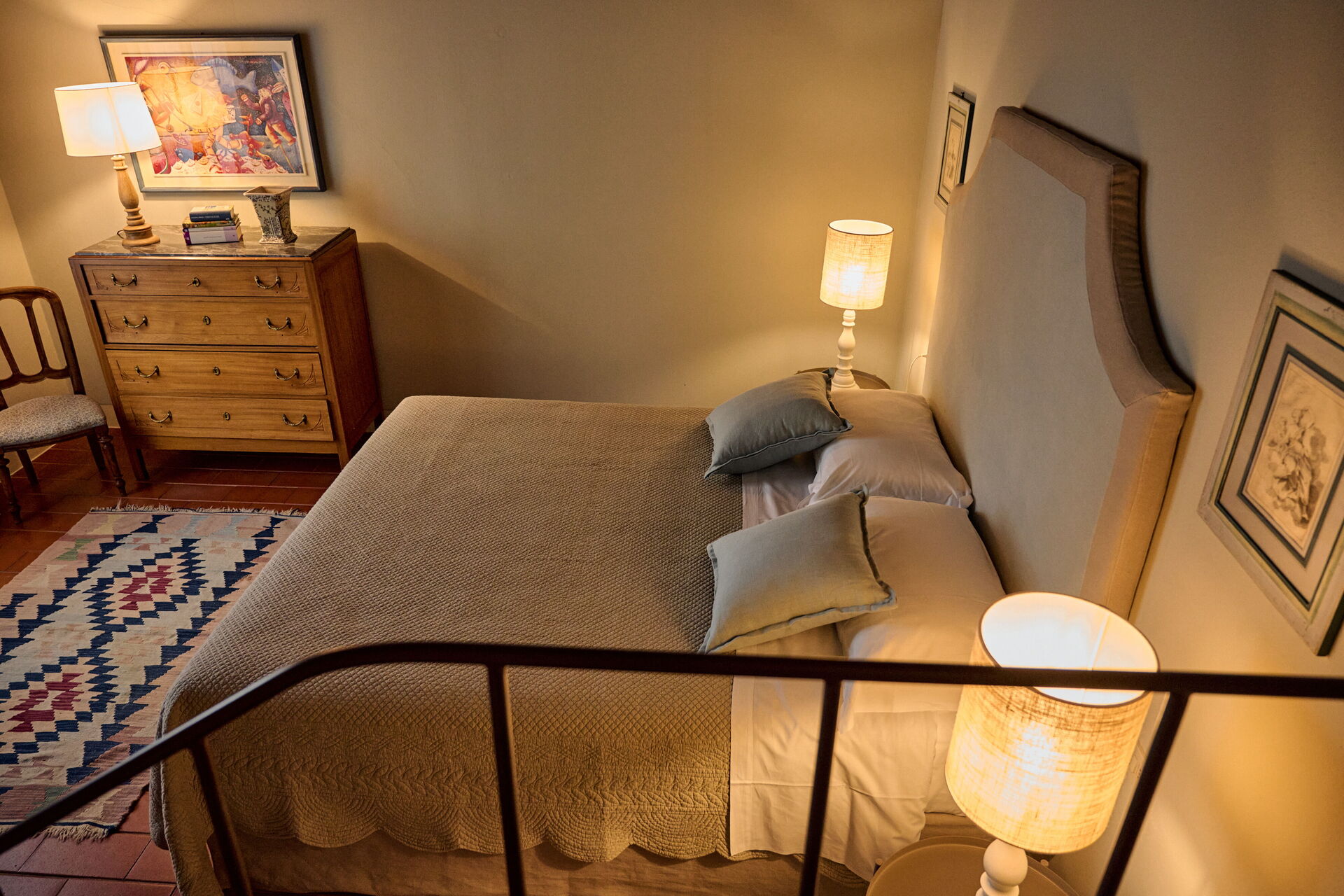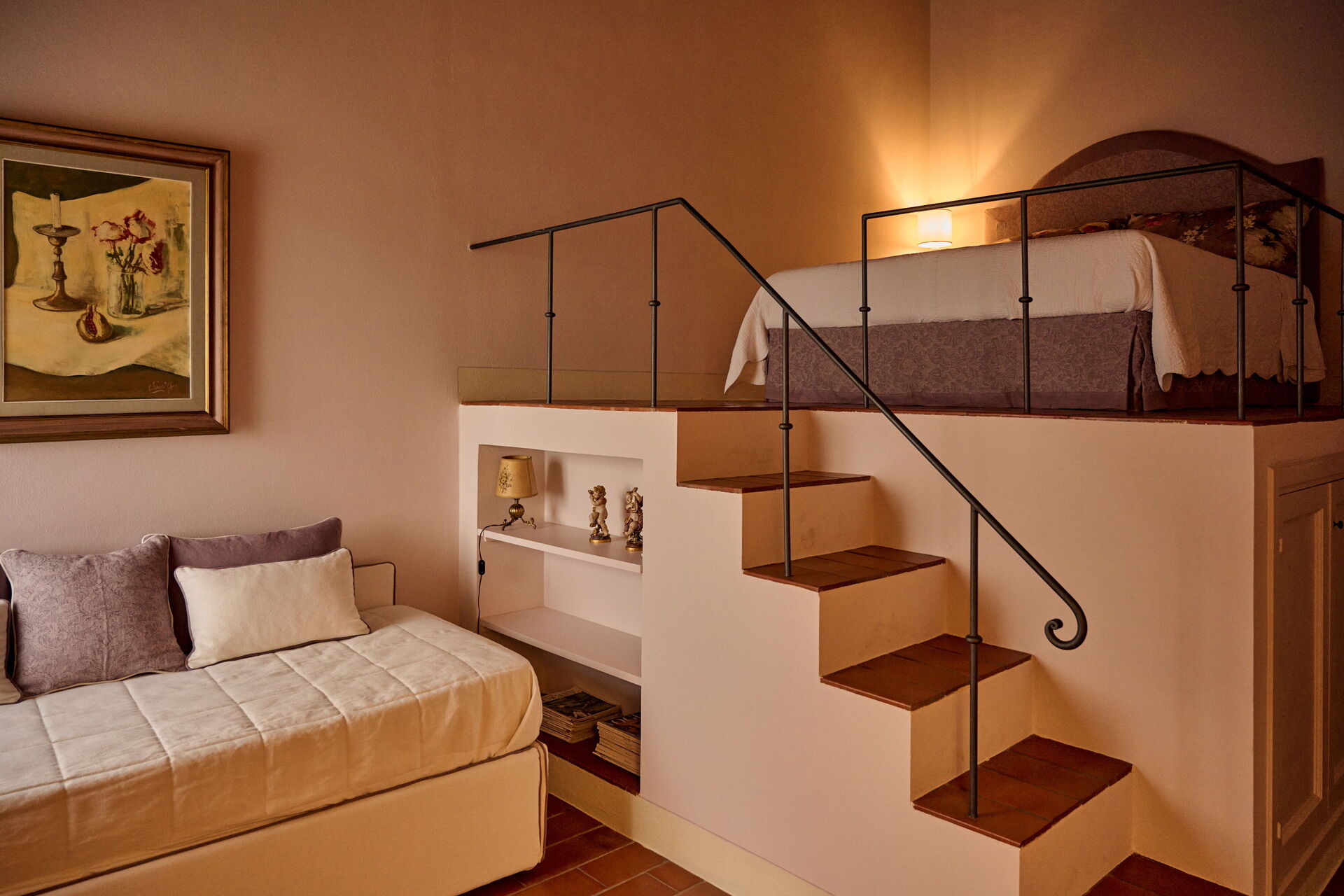 1 dobbeltværelse med eget badeværelse med bruser og stort walk-in-garderobe, suite med opholdsstue og badeværelse med bruser og adgang til 1 dobbeltværelse (4 trin ned), 1 dobbeltværelse med eget badeværelse med bruser, 1 twin værelse, badeværelse med bruser, 1 dobbeltværelse med eget badeværelse med bruser, 1 twin værelse med eget badeværelse med bruser (en seng er en udtræksseng) og adgang til mezzanin med dobbeltseng.
