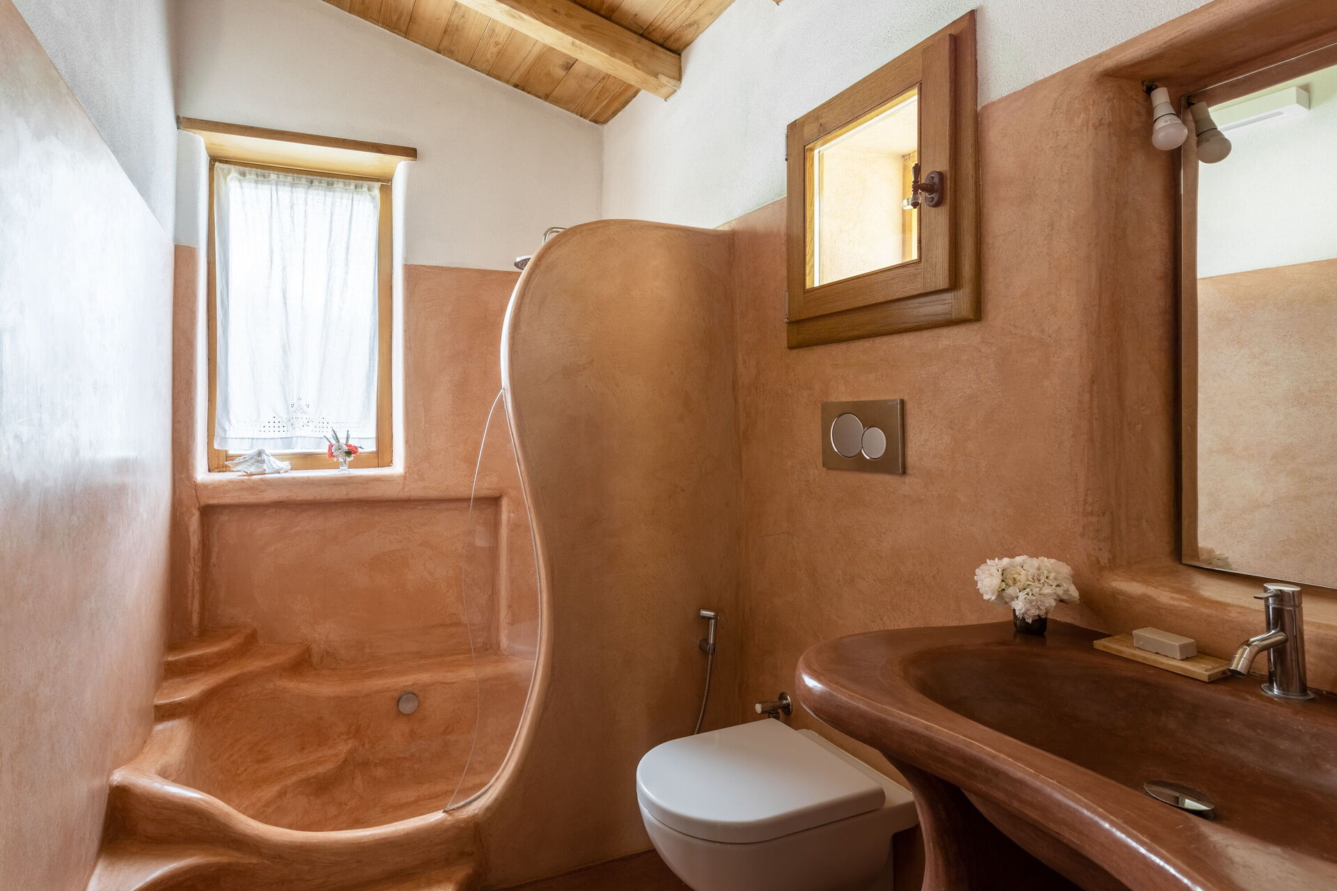 Badeværelse: vask, wc, bidet, bruser, hårtørrer.