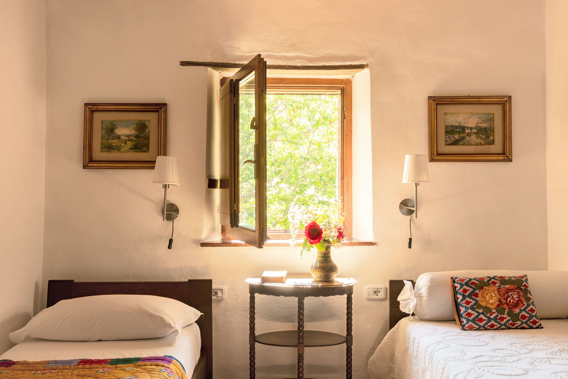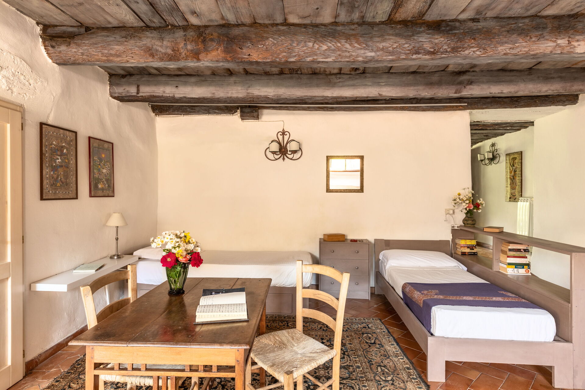 Soveværelse med bad 3: to enkeltsenge, WIFI internet, skrivebord, vask, wc, bruser, hårtørrer, udgang til have.