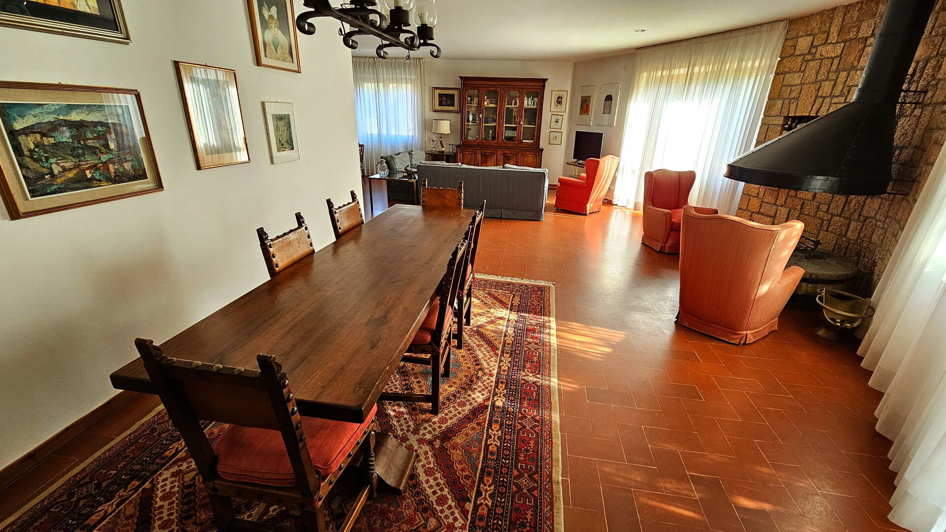 Stue (75 m2): sofa, lænestol, kamin, spisebord, WIFI internet, tv, stereoanlæg, udgang til have, udgang til veranda.