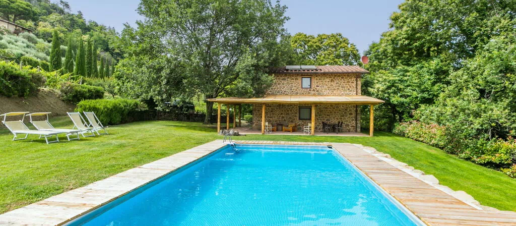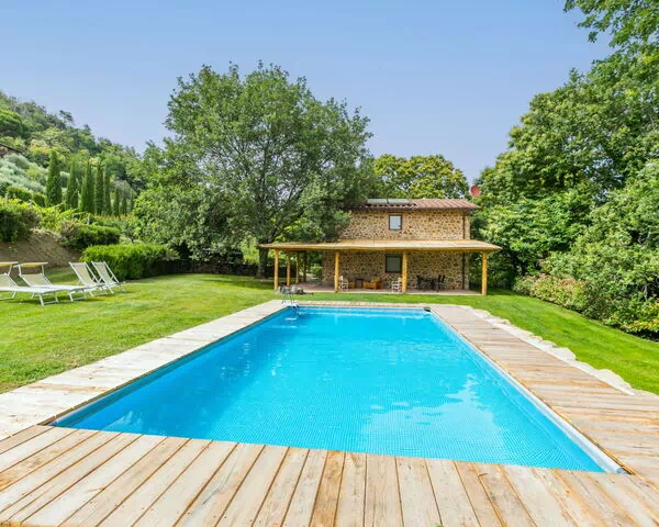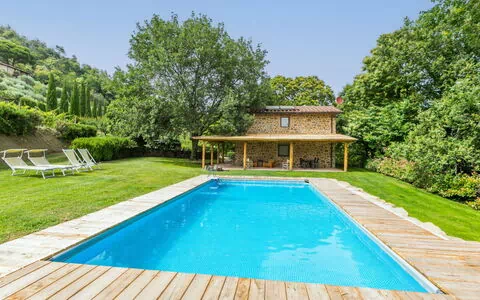 Den private svømmepøl måler 10 x 7 meter med en dybde på 120 cm og er tilgængelig fra 26. april til 27. september. Poolen vedligeholdes regelmæssigt af ejeren og gartner. Den private naturhave er udstyret med havemøbler, og der er et grillområde til rådighed. De delte terrasser på ejendommen omfatter velholdte områder med forskellige planter og en åben eng, som inviterer til gåture og stille stunder i det toscanske landskab.