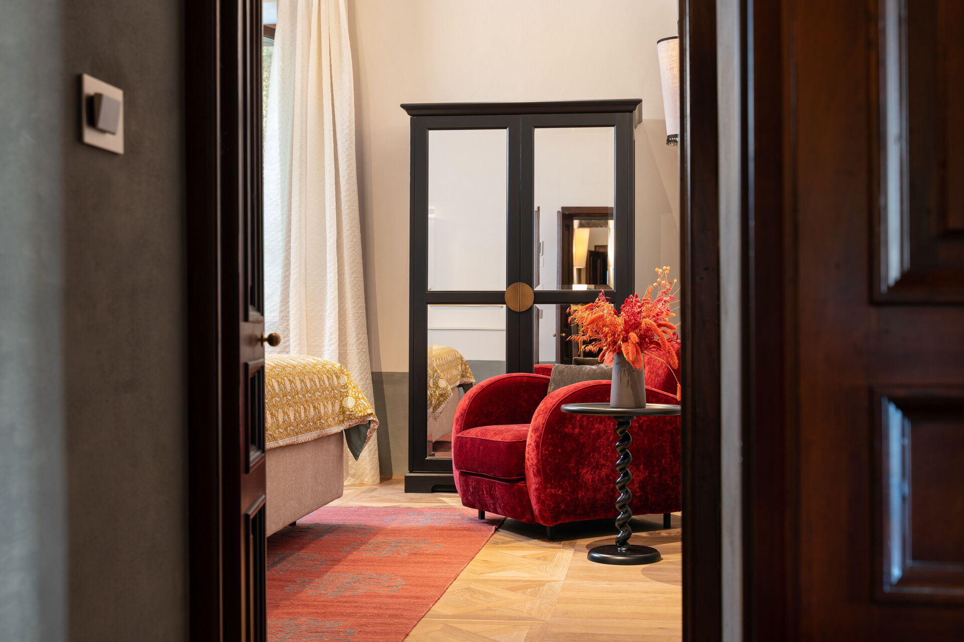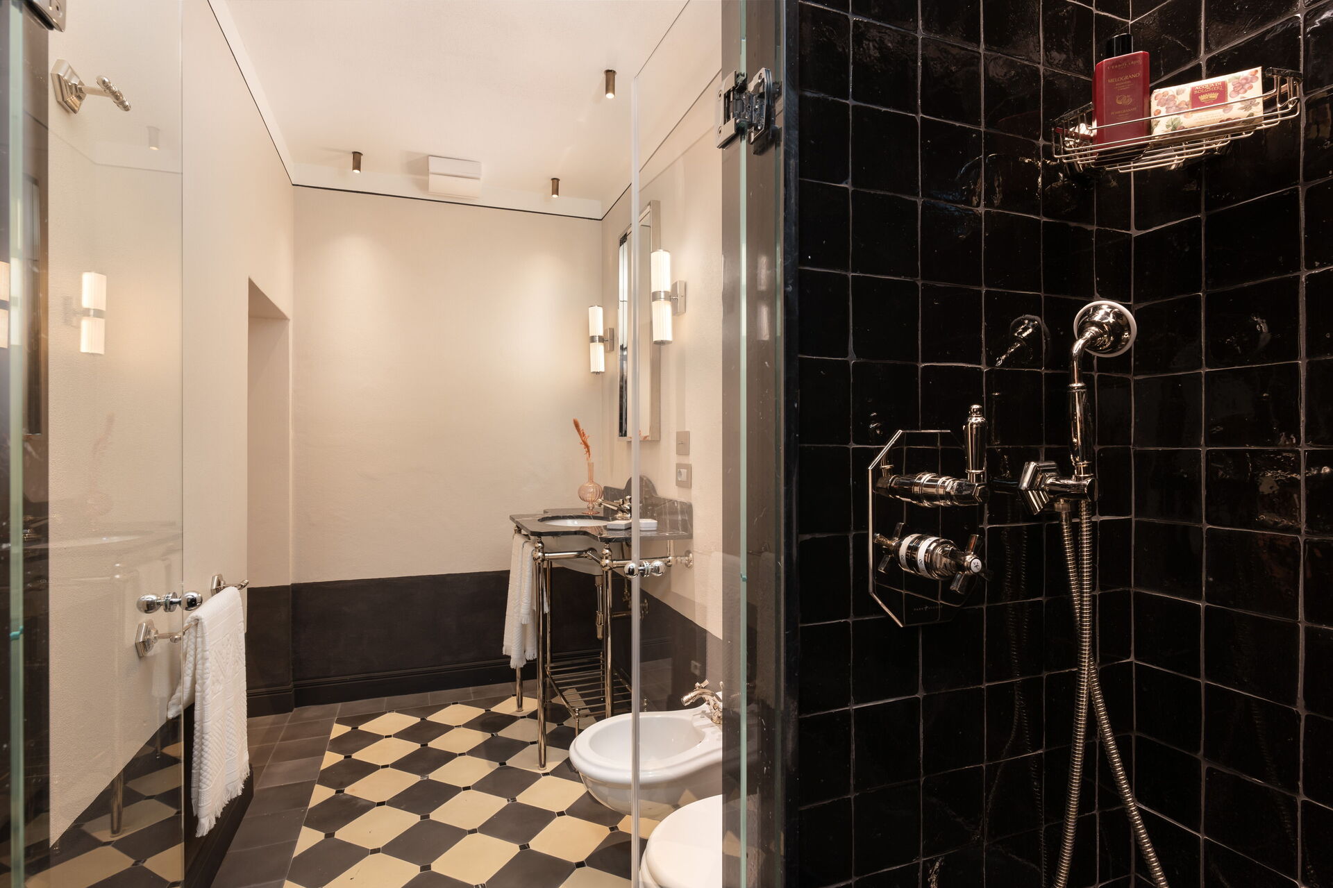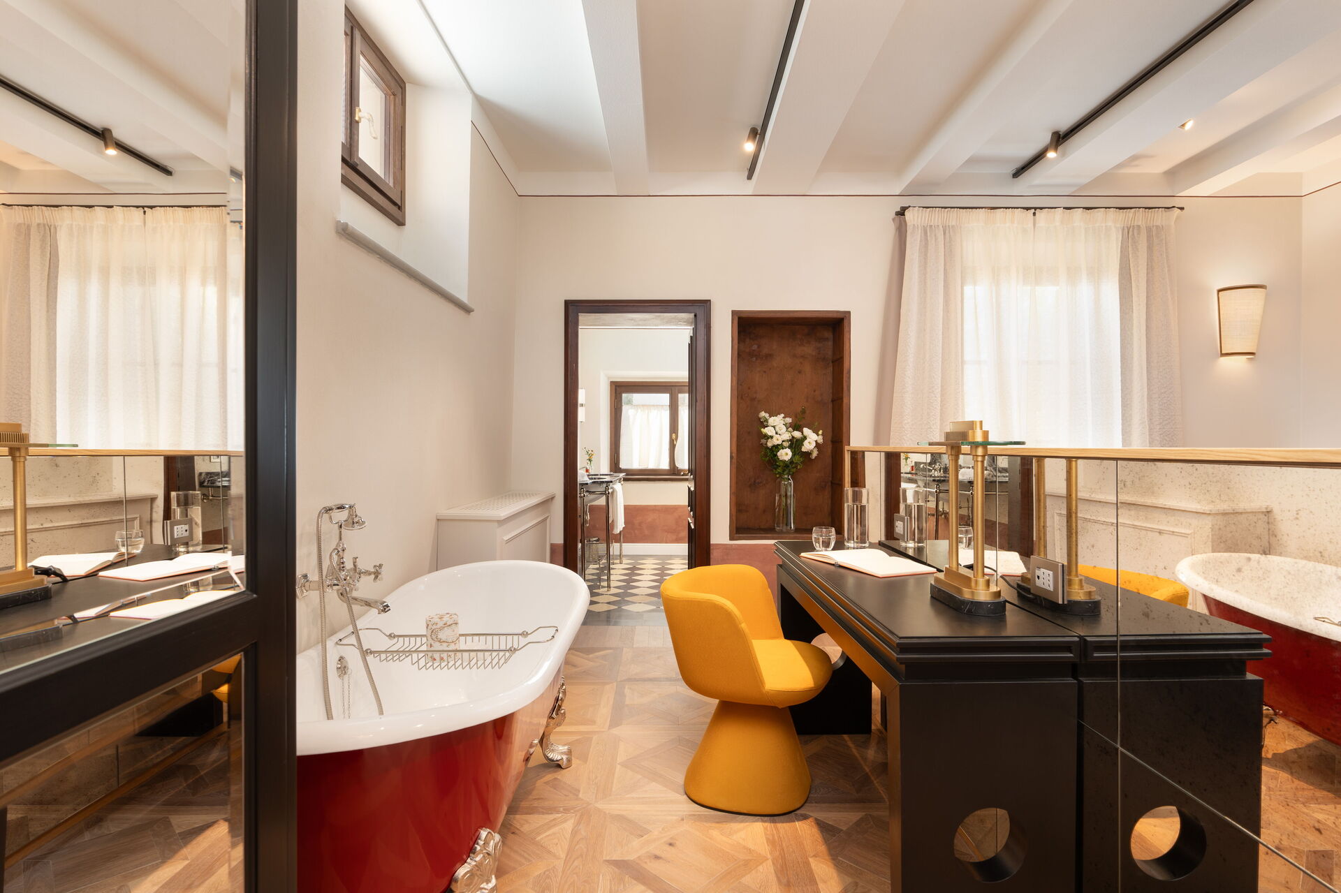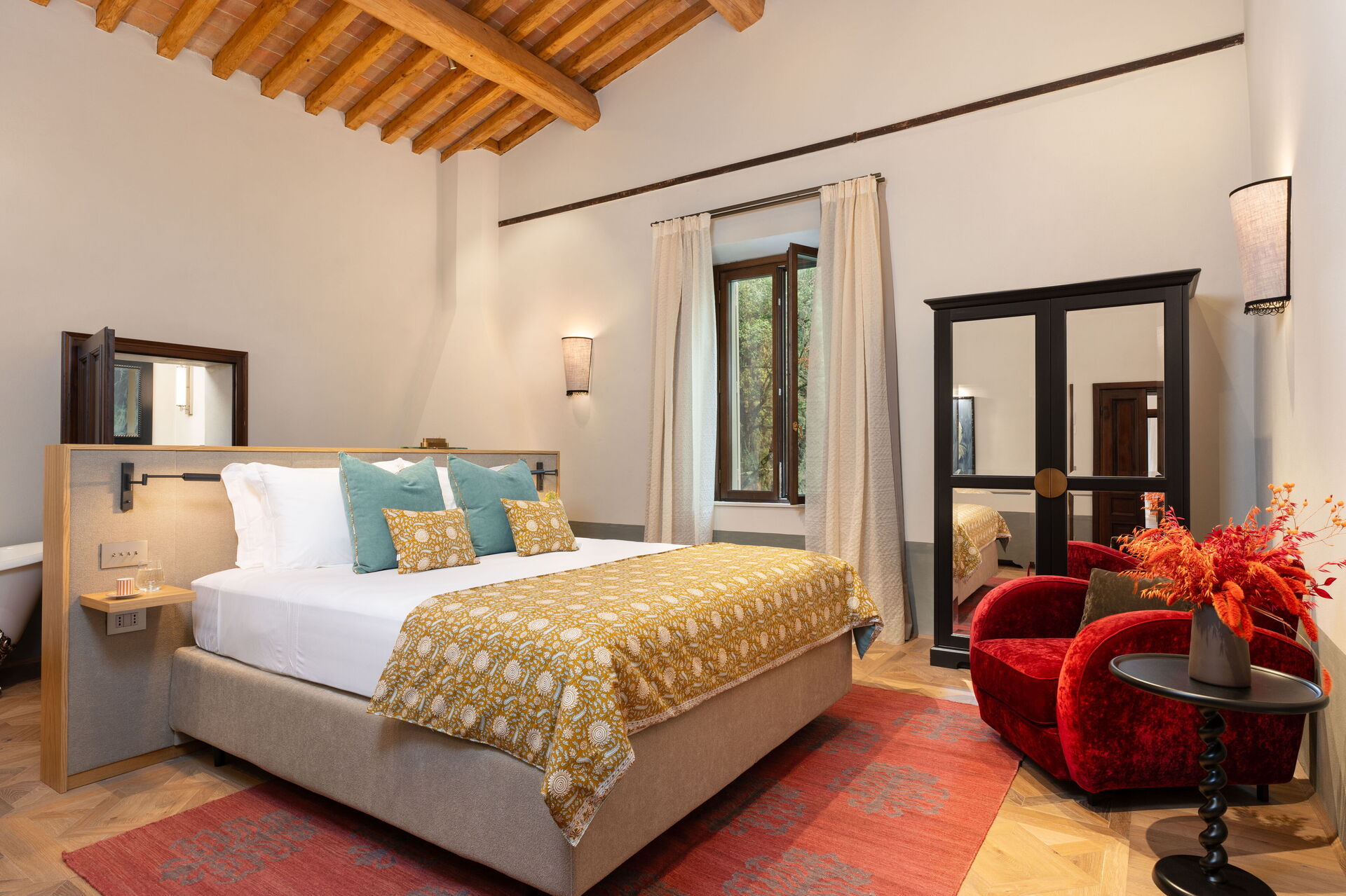 Soveværelse med bad 2: king size seng (bredde: 180m, længde: 200m), WIFI internet, klimaanlæg, vask, wc, bidet, badekar, bruser, hårtørrer, udgang til gårdhave.