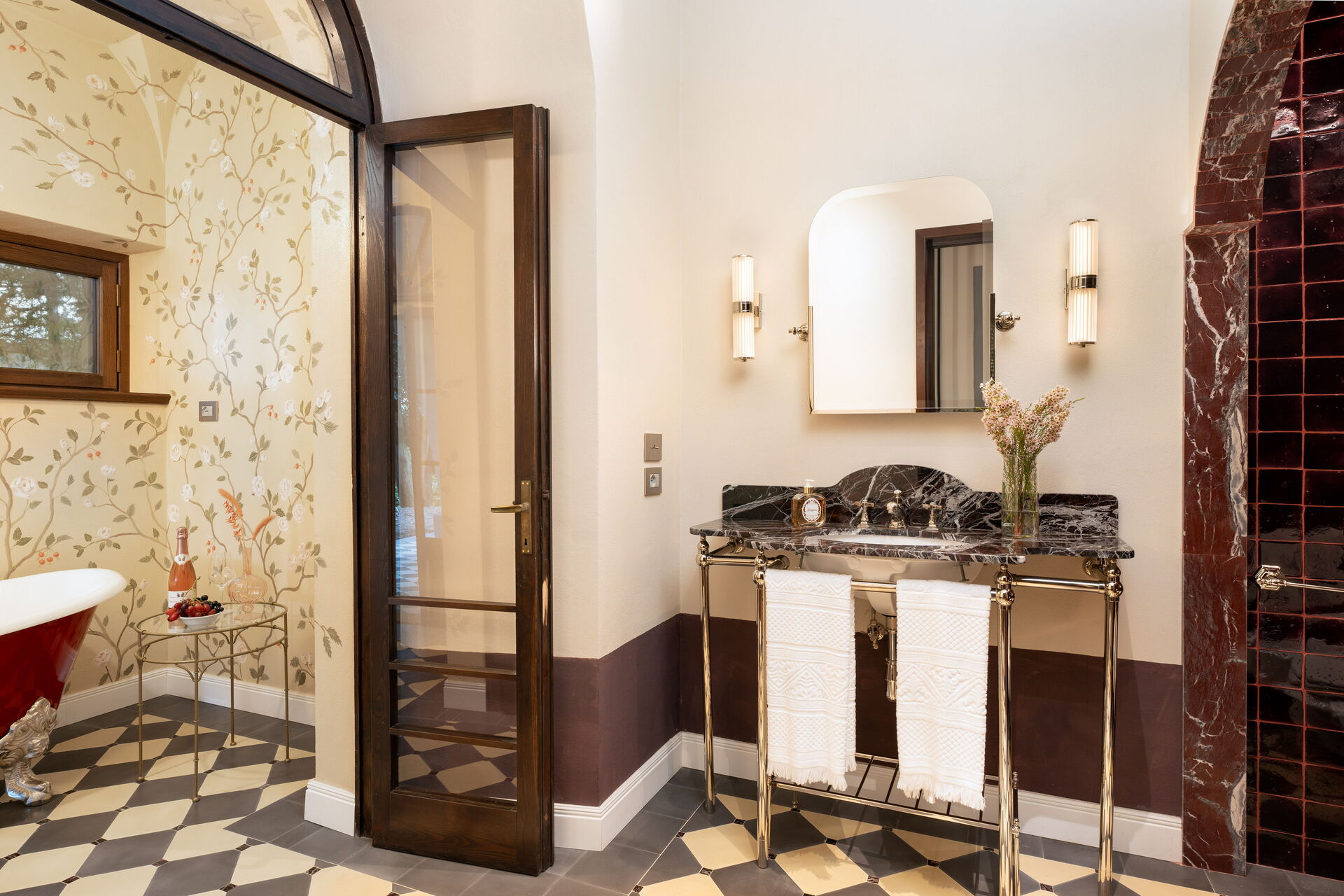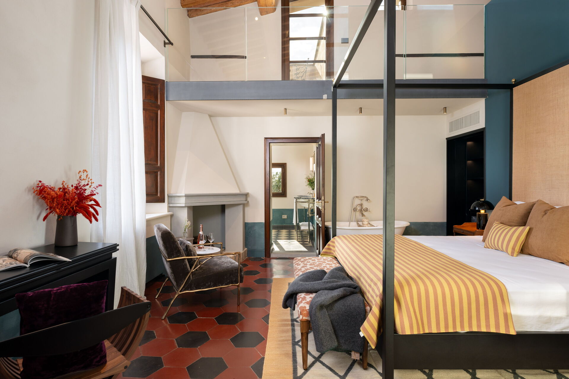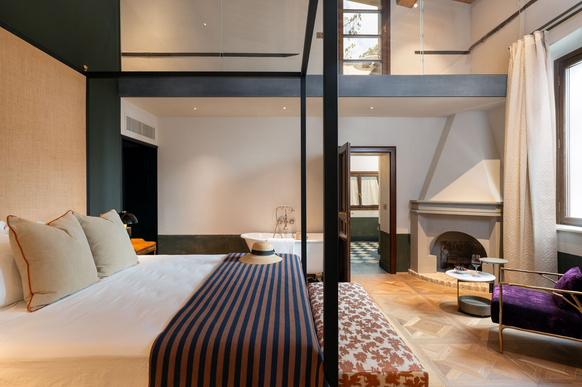Soveværelse med bad 1: king size seng (bredde: 180m, længde: 200m), WIFI internet, klimaanlæg, vask, wc, bidet, badekar, bruser, hårtørrer, udgang til terrasse, hems.