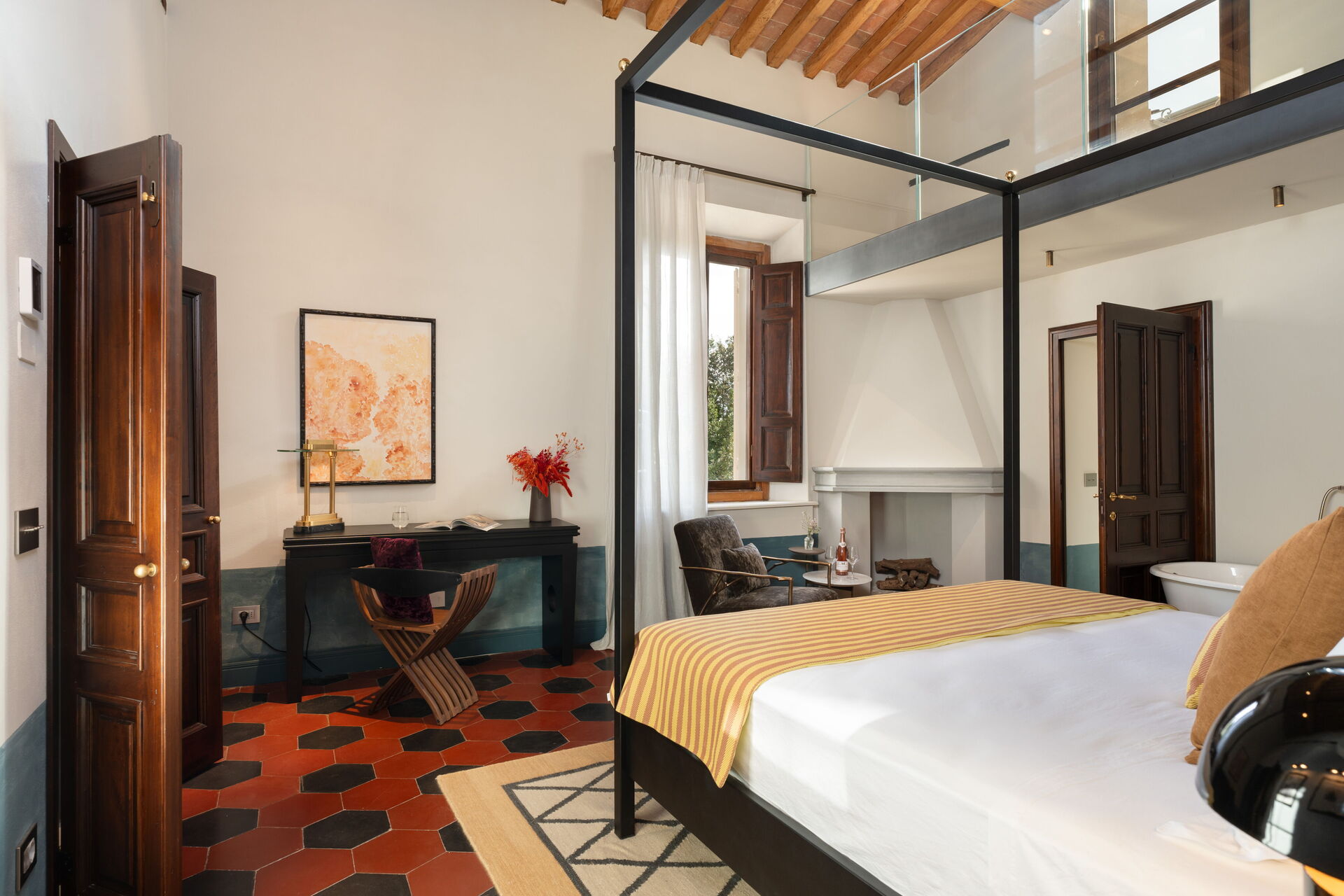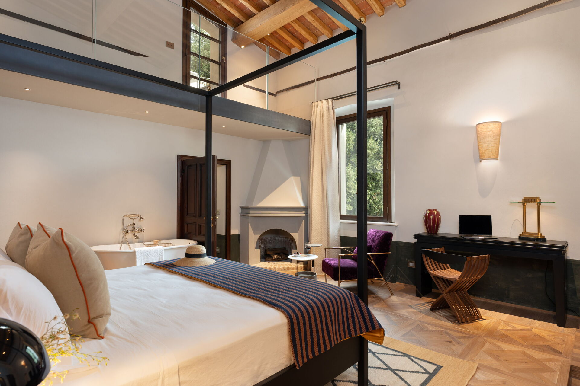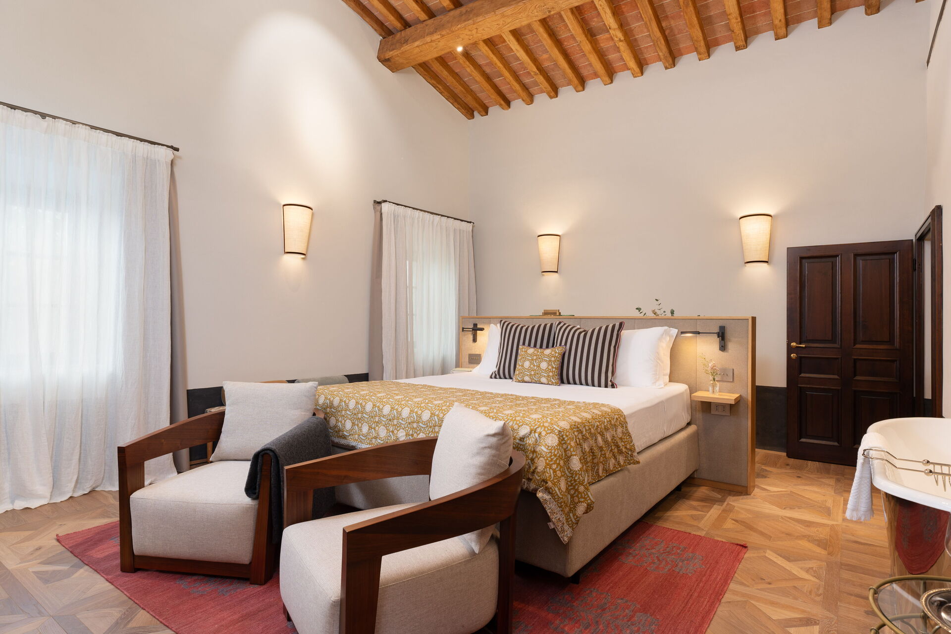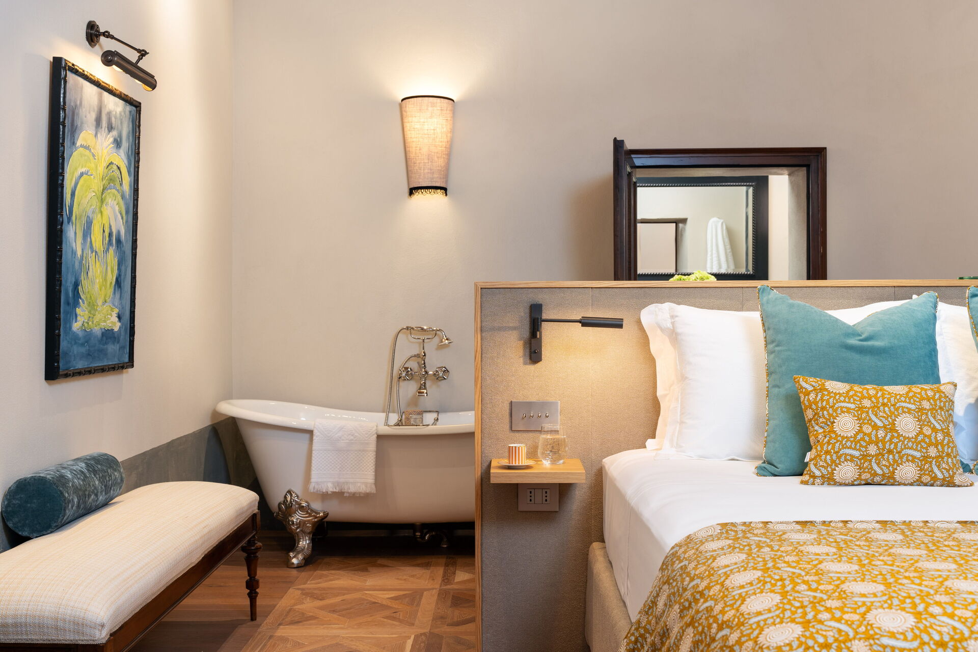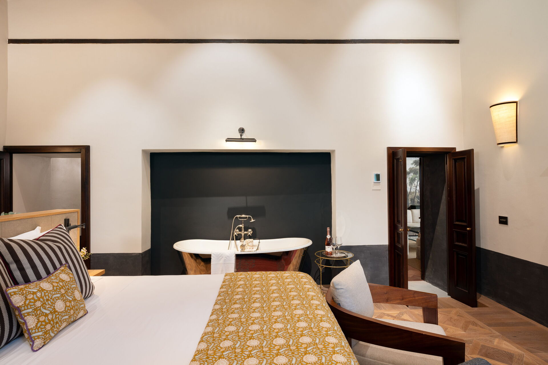 Soveværelse med bad: king size seng (bredde: 180m, længde: 200m), WIFI internet, klimaanlæg, vask, wc, bidet, badekar, bruser, hårtørrer, udgang til terrasse.