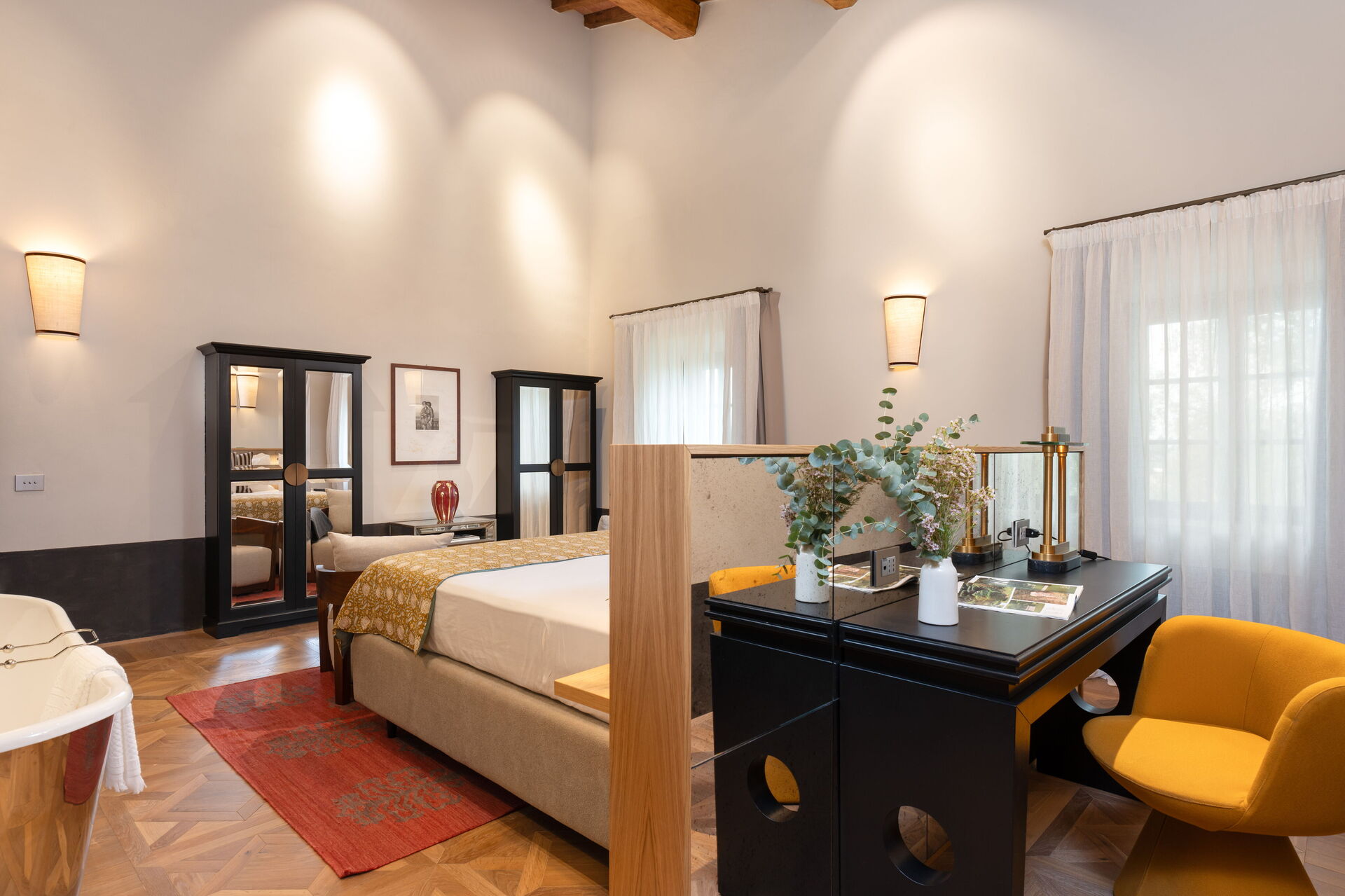 Soveværelse med bad 4: king size seng (bredde: 180m, længde: 200m), WIFI internet, klimaanlæg, vask, wc, bidet, badekar, bruser, hårtørrer.
