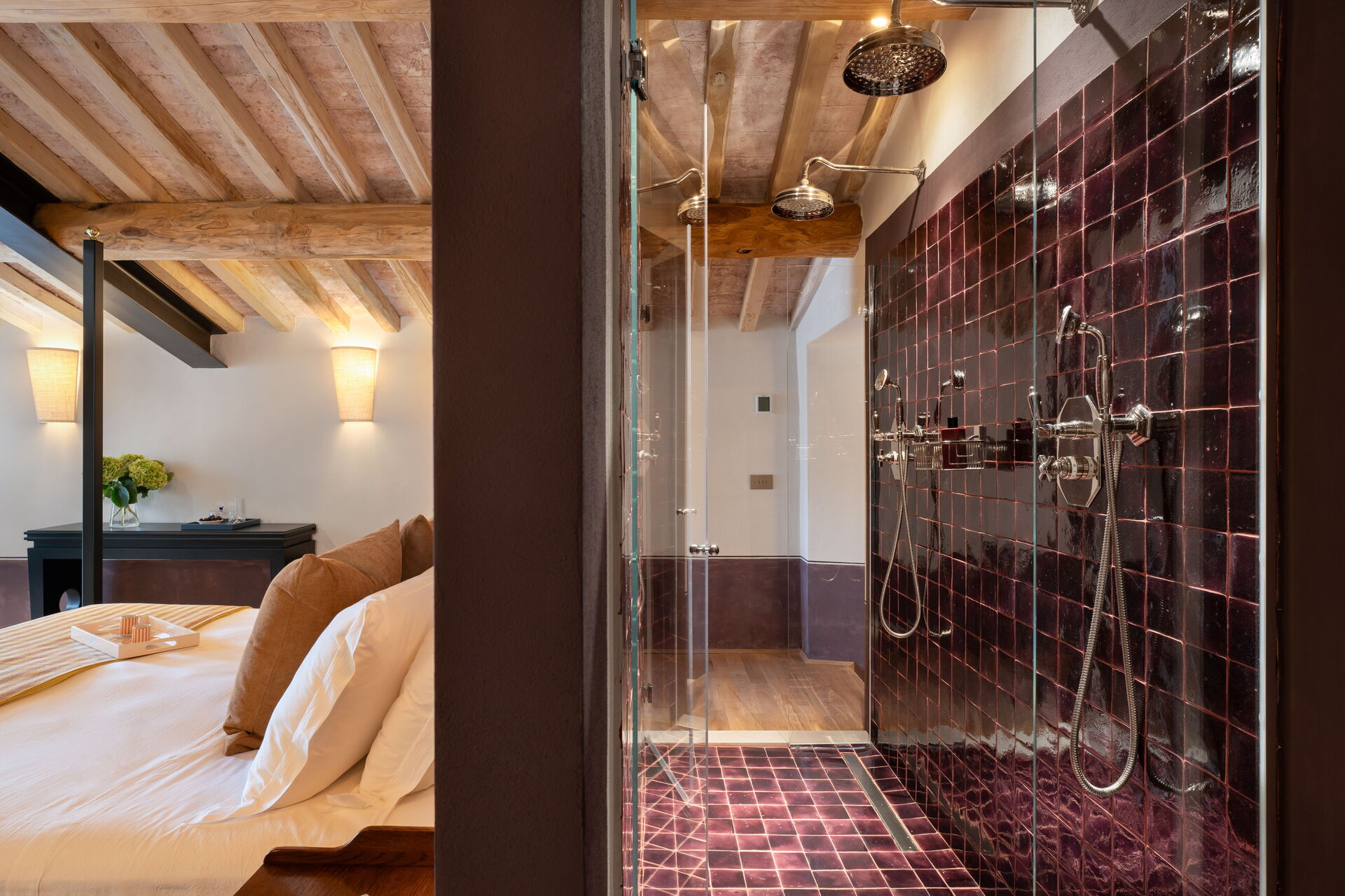 Soveværelse med bad 2: king size seng (bredde: 180m, længde: 200m), WIFI internet, klimaanlæg, vask, wc, bidet, badekar, bruser, hårtørrer, udgang til terrasse, hems.