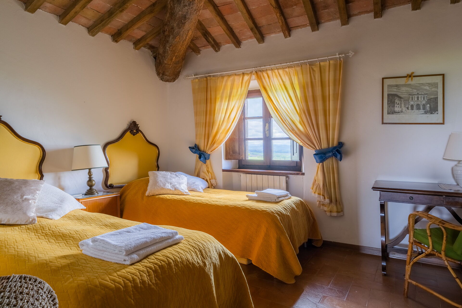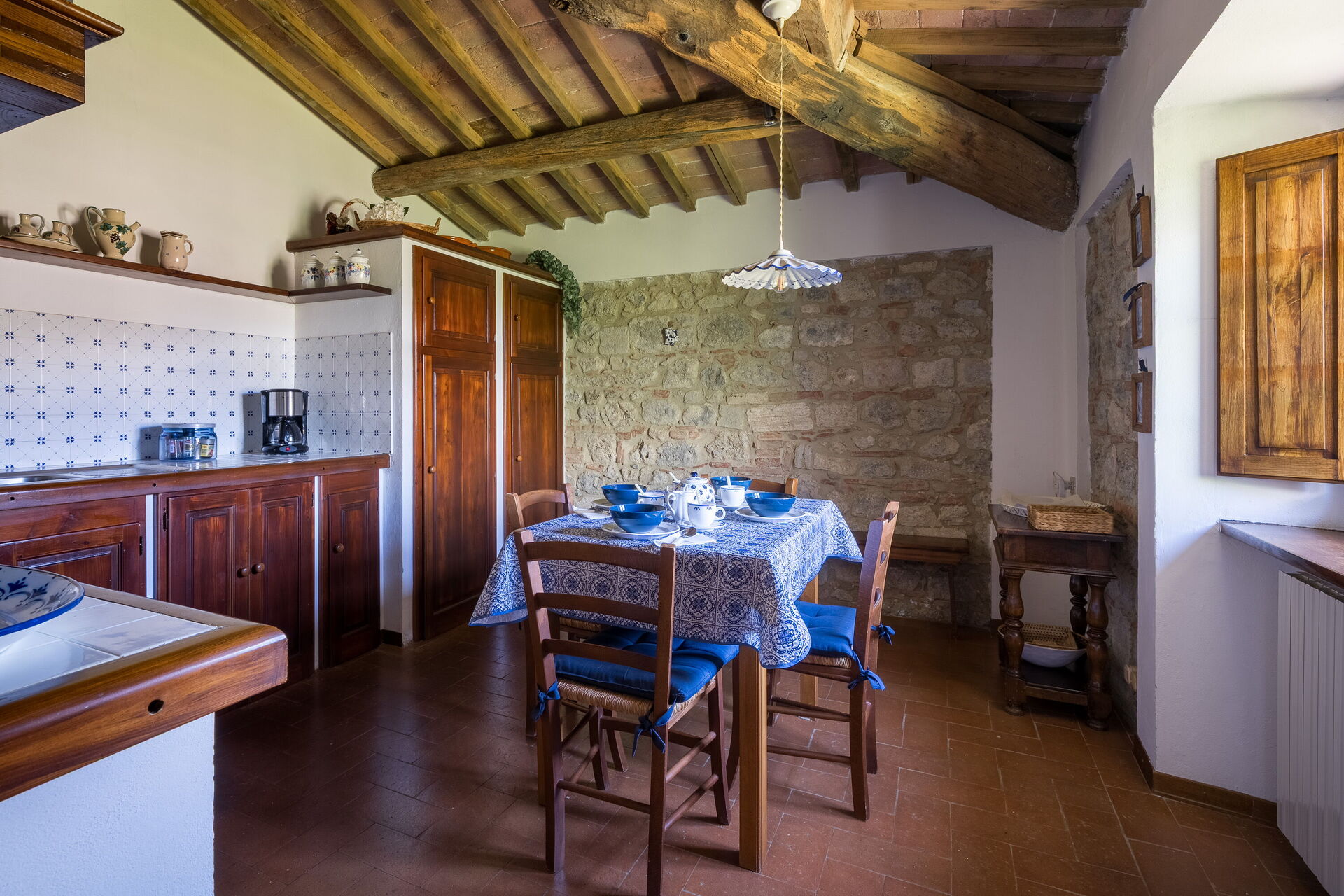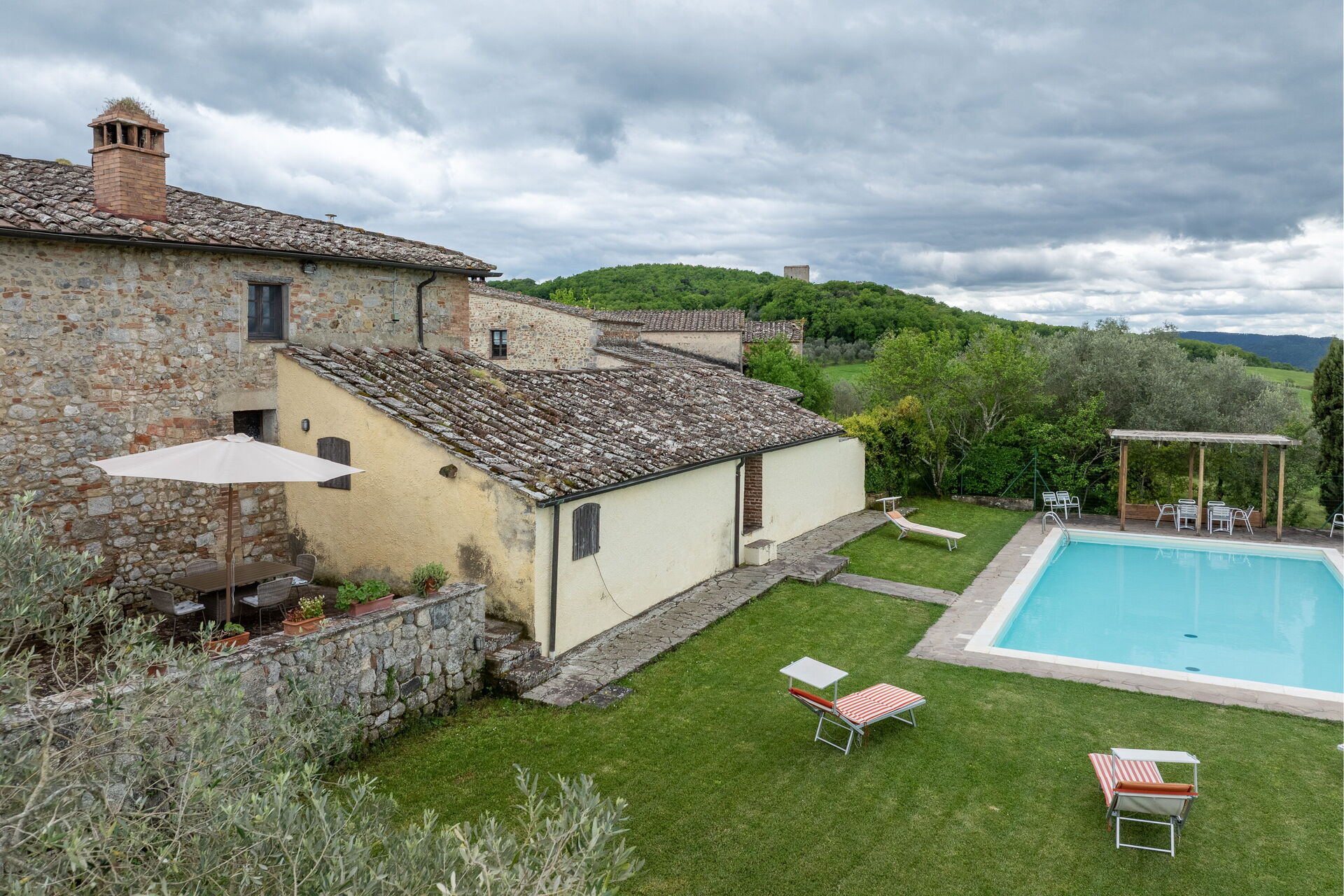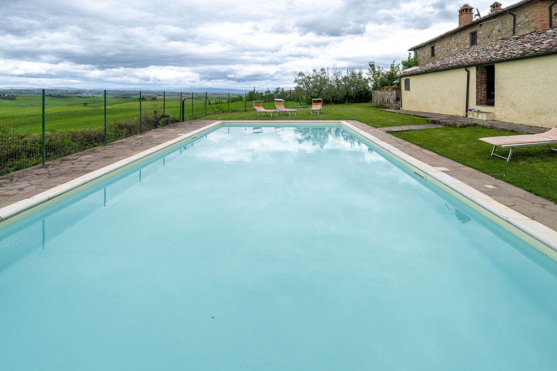Når I ankommer, vil I møde en fin ren velholdt ejendom med udsigt over bakkerne perfekt til rolig ferie i Toscana. Uanset hvordan I tilbringer dagene - med shopping, sightseeing, museumsbesøg eller bare ved at køre rundt på landet, så kan I slappe af med familie og venner ved poolen, når I kommer hjem, hvilket er en perfekt måde at afslutte endnu en dejlig dag på i Toscana. Hvis I nyder at lave mad til familie og venner så er der et veludstyret køkken inkluderet kaffemaskine, brødrister, komfur og køleskab, samt, , samt masser af service og bestik til op til seks personer.