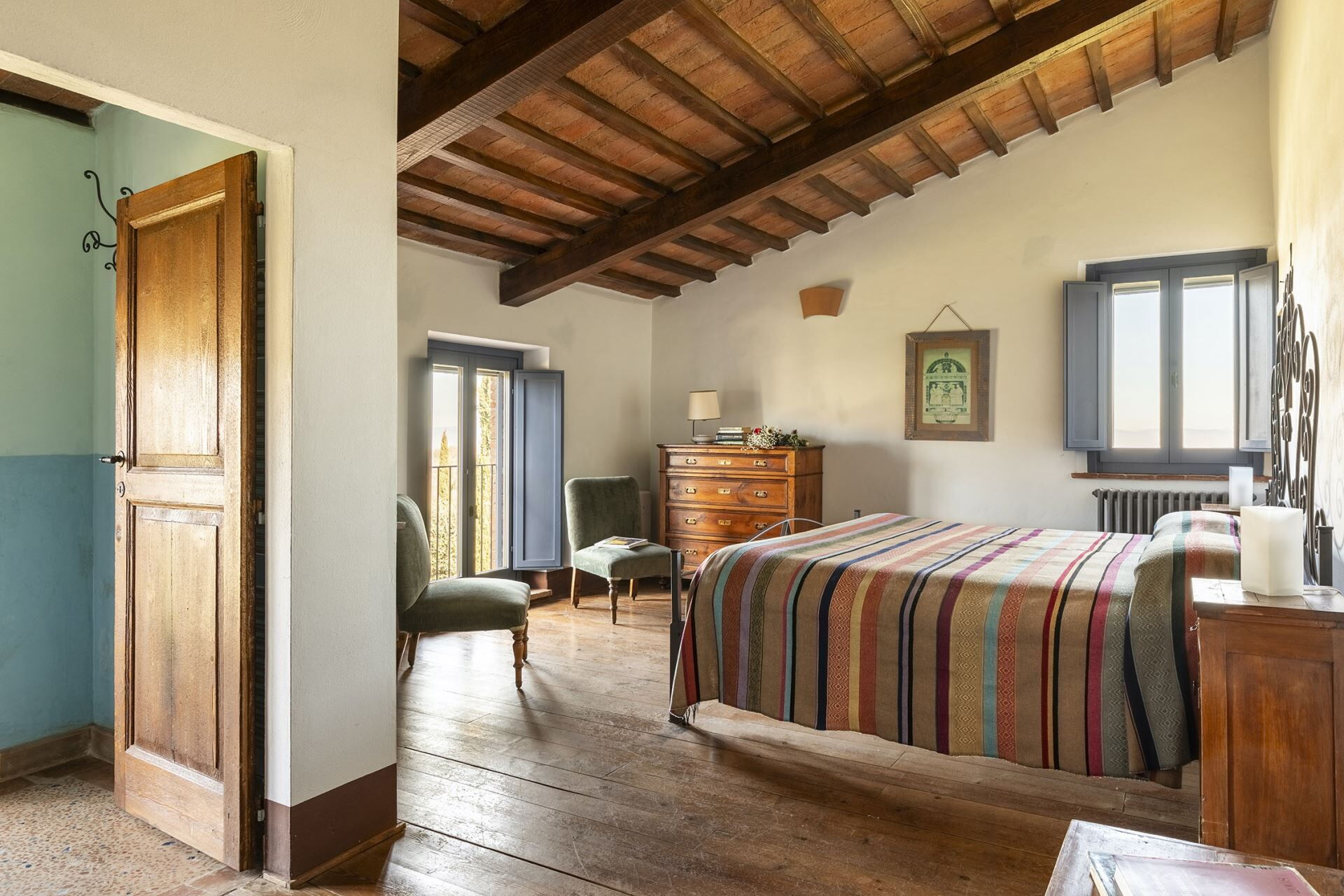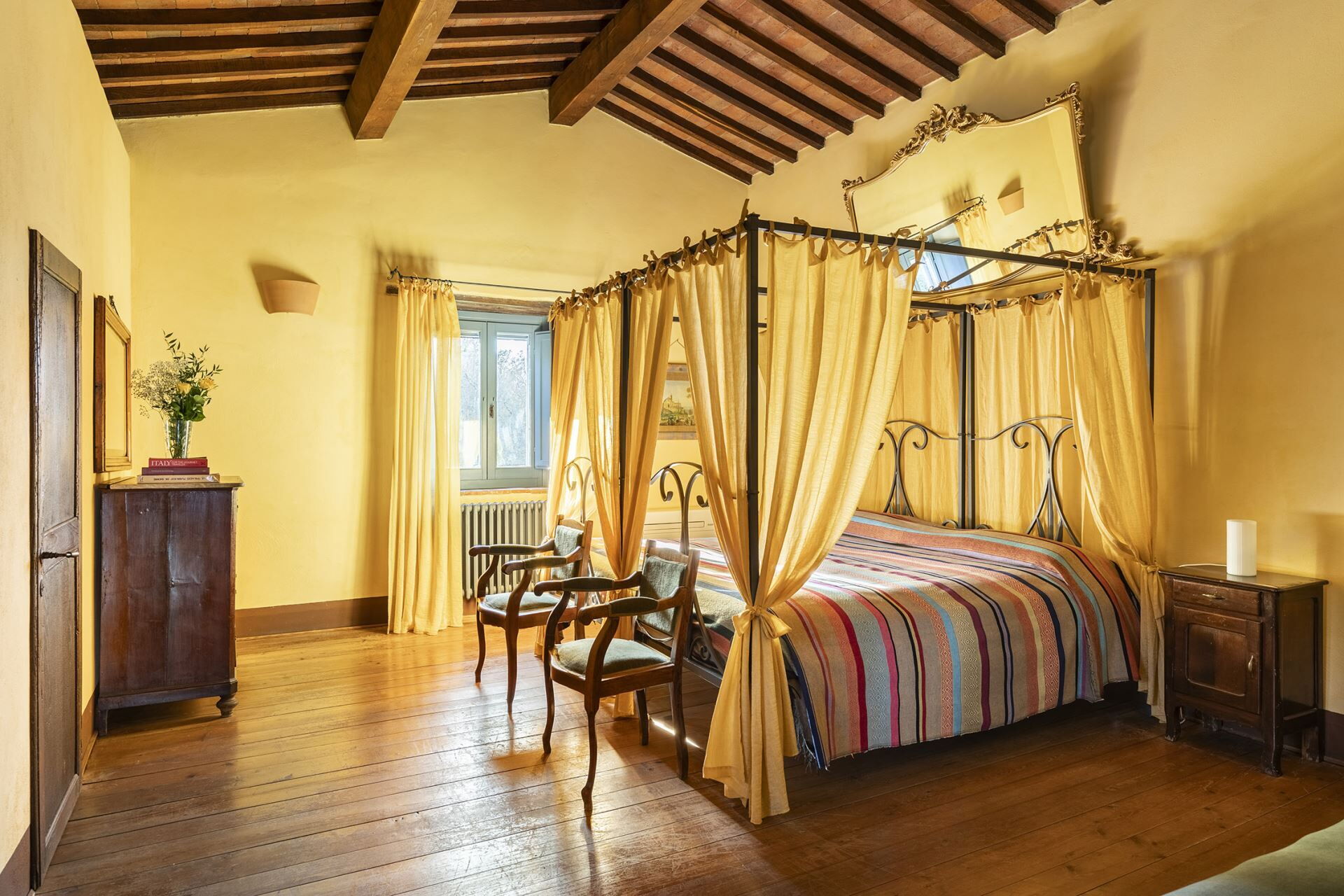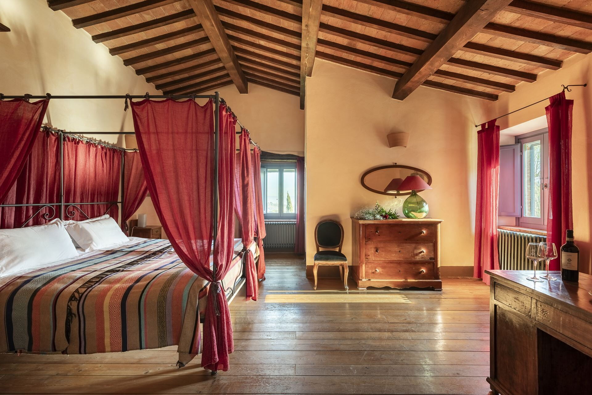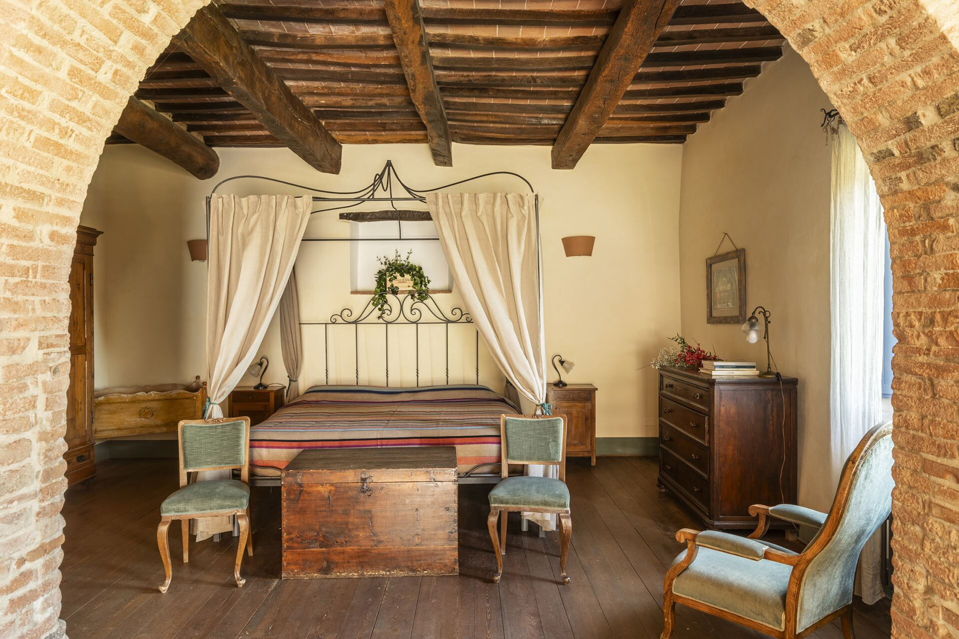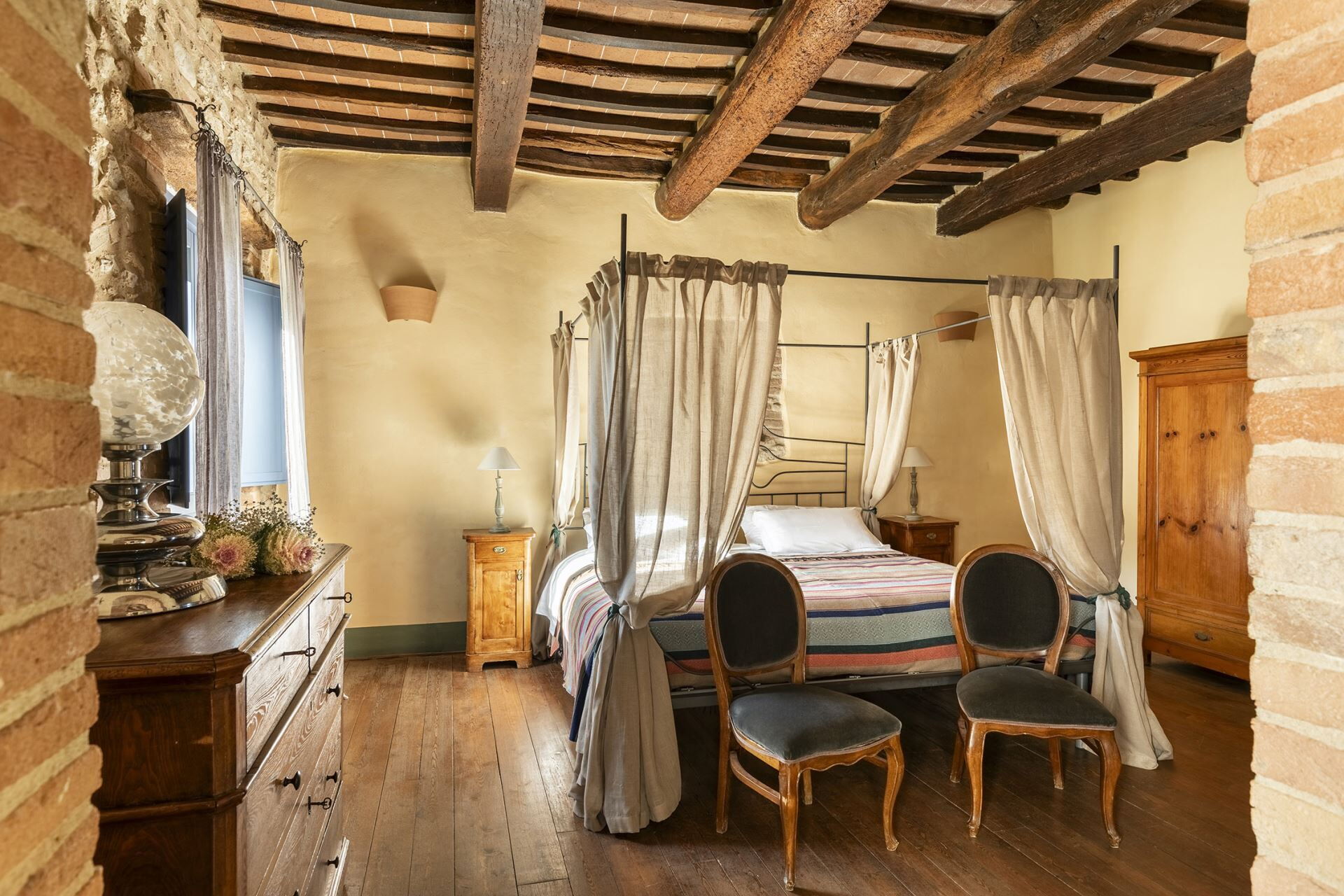 Denne fritliggende bondegårdsferiebolig strækker sig over 450 kvadratmeter og ligger indlejret på skråningerne af Monte Cappuccini, som adskiller Val d'Orcia fra Val di Chiana i Montepulciano, Italien. Ejendommen er for nylig blevet restaureret med omhyggelig opmærksomhed på interiørindretningen og fremviser autentiske antikke møbler, traditionelle terracottalofter og antikke parketgulve, der legemliggør ægte toskansk stil. De vil opleve, at denne fritliggende bolig tilbyder både afslapning og nem adgang til at udforske de omkringliggende vingårde og olivenlunde, der karakteriserer områdets bakker og sletter. Ejendommen tilbyder bekvem parkering på stedet og gratis internetforbindelse via Wi-Fi gennem hele Deres ophold, hvilket sikrer, at De forbliver forbundet, mens De nyder det toskanske landskabs ro.