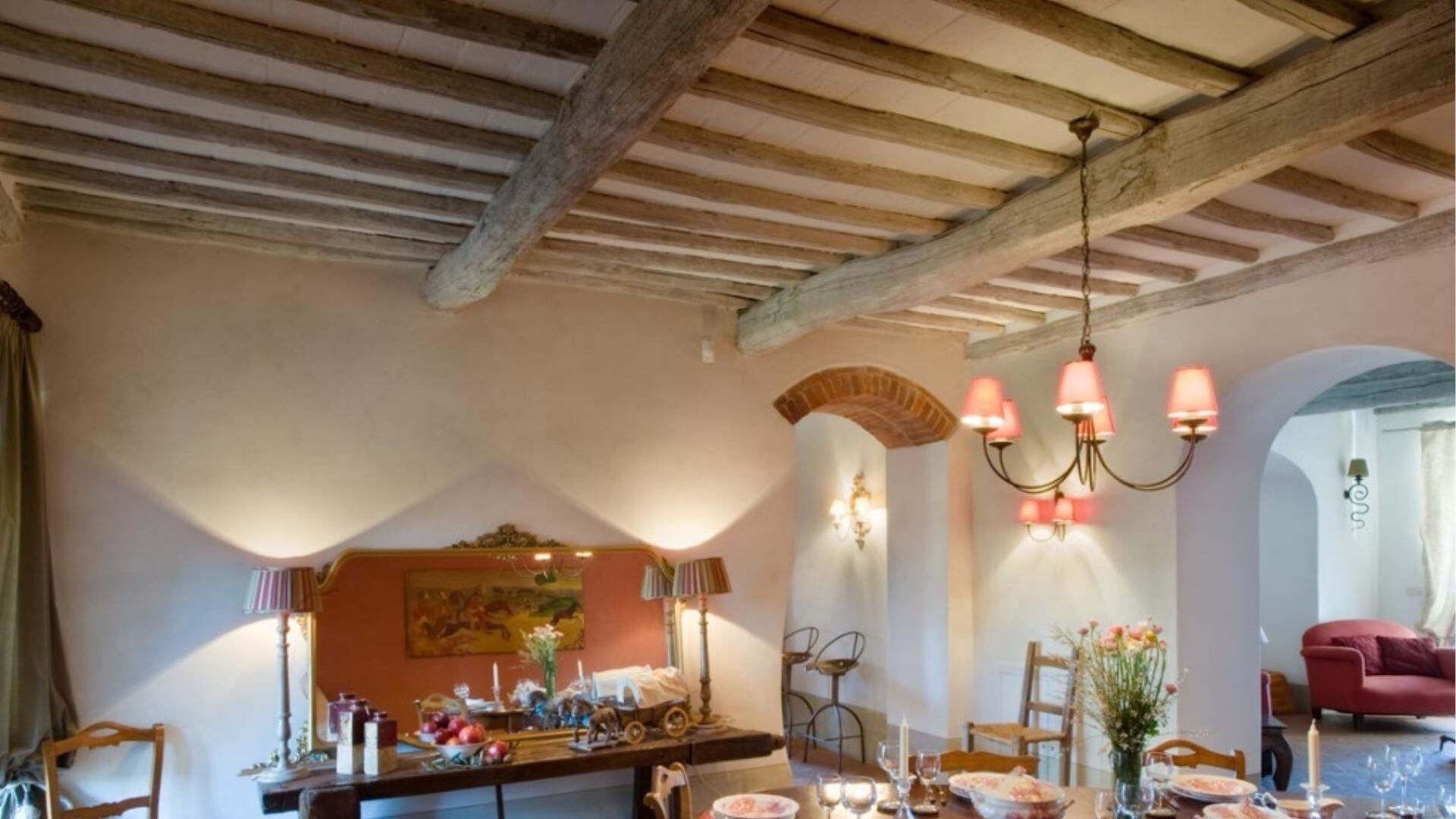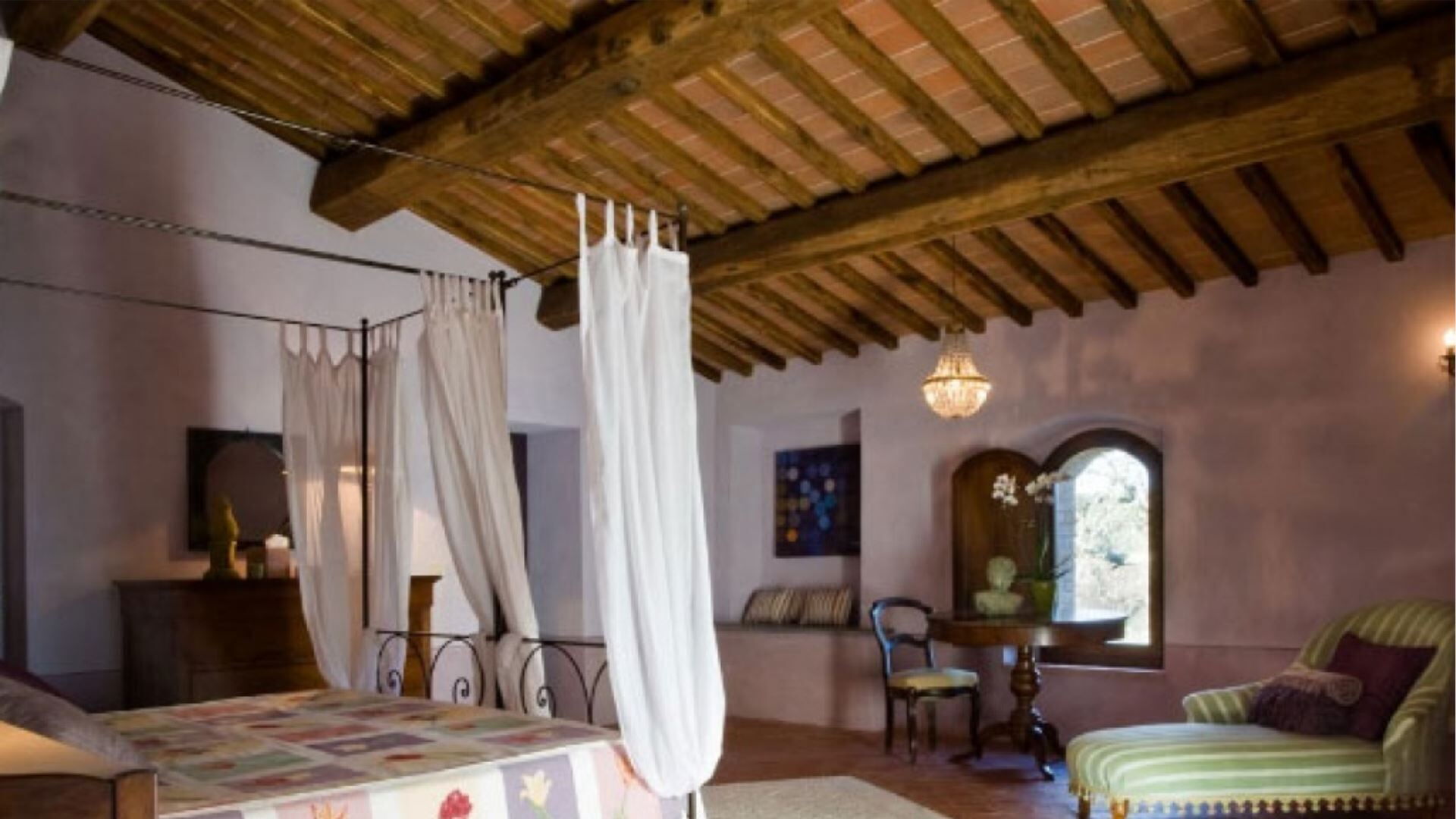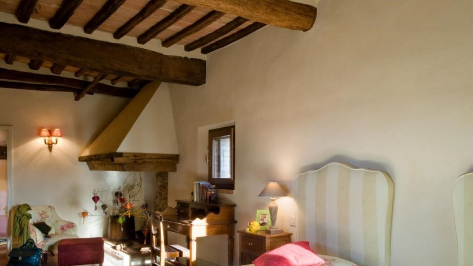 Indkvarteringen kan rumme op til 10 gæster fordelt på 7 soveværelser og 7 badeværelser, omhyggeligt fordelt mellem hovedvillaen og den ombyggede ladebygning. Hovedbygningen er tilgængelig via to separate indgange, hvor den ene fører til en lobby, garderobe og vaskerum. Til højre for denne indgang finder De et dobbeltværelse i stueetagen med eget badeværelse med bruser, specielt designet til kørestolsadgang. Den anden indgang åbner direkte ind til det store køkken. Også i stueetagen, bag spisestuen, er endnu et dobbeltværelse med tilstødende badeværelse med bruser. Fra indgangen stiger to ramper af gamle travertintrapper op til en repos, der åbner ud til en overdækket terrasse. På dette øverste niveau, til højre, finder De et dobbeltværelse med eget badeværelse med bruser, mens De til venstre finder en stor opholdsstue med pejs, der forbinder til to yderligere dobbelt- eller tosengsværelser, hvert med tilhørende badeværelser med både bruser og badekar. Den tilstødende lade er blevet omdannet til et moderne åbent rum, der kan huse 4 yderligere gæster. På det øverste niveau af laden vil De opdage to soveværelser, et dobbelt og et tosengssoveværelse, hver udstyret med bad og bruser. En åben trappe fører ned fra dette loftniveau til stueetagens opholdsstue, som har pejs, spisestue og åbent køkken.