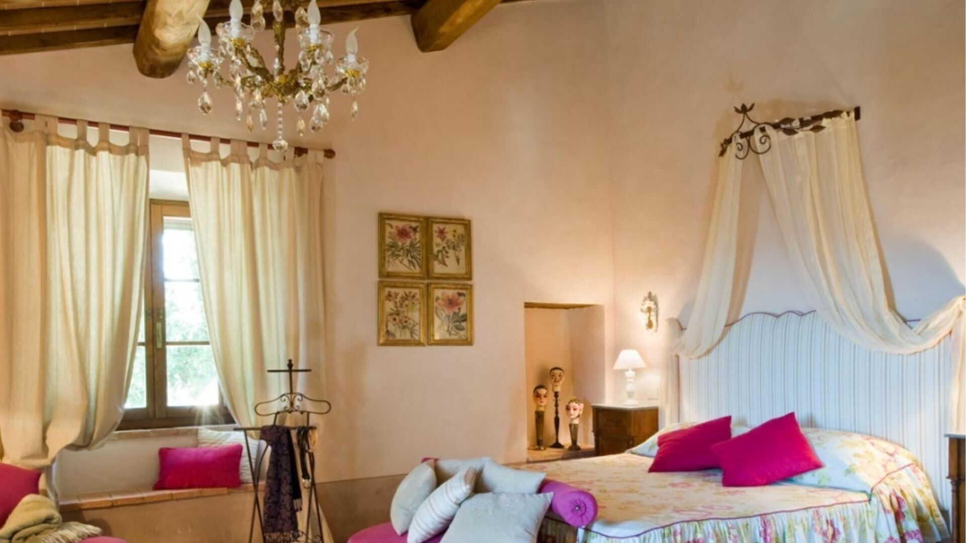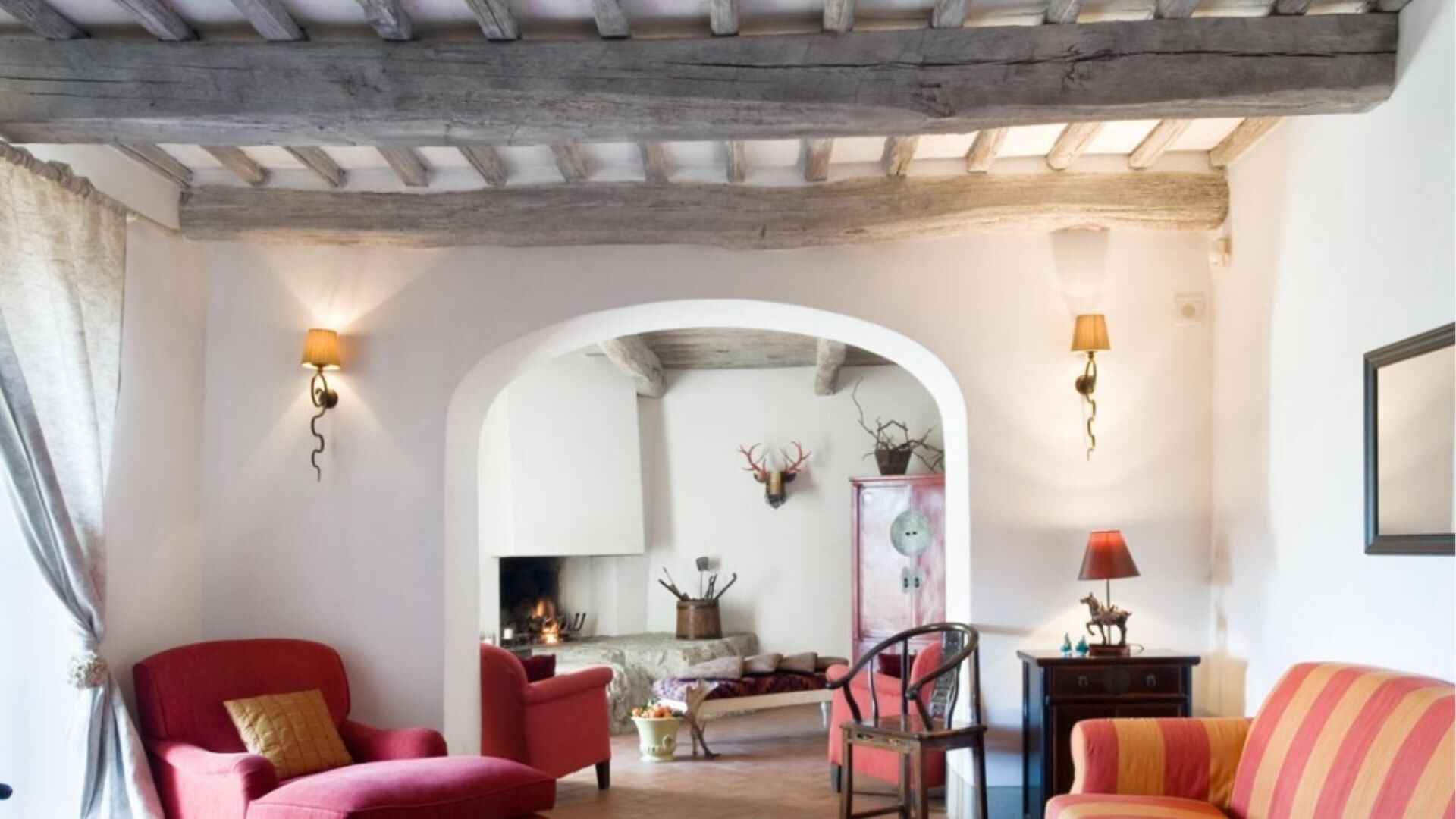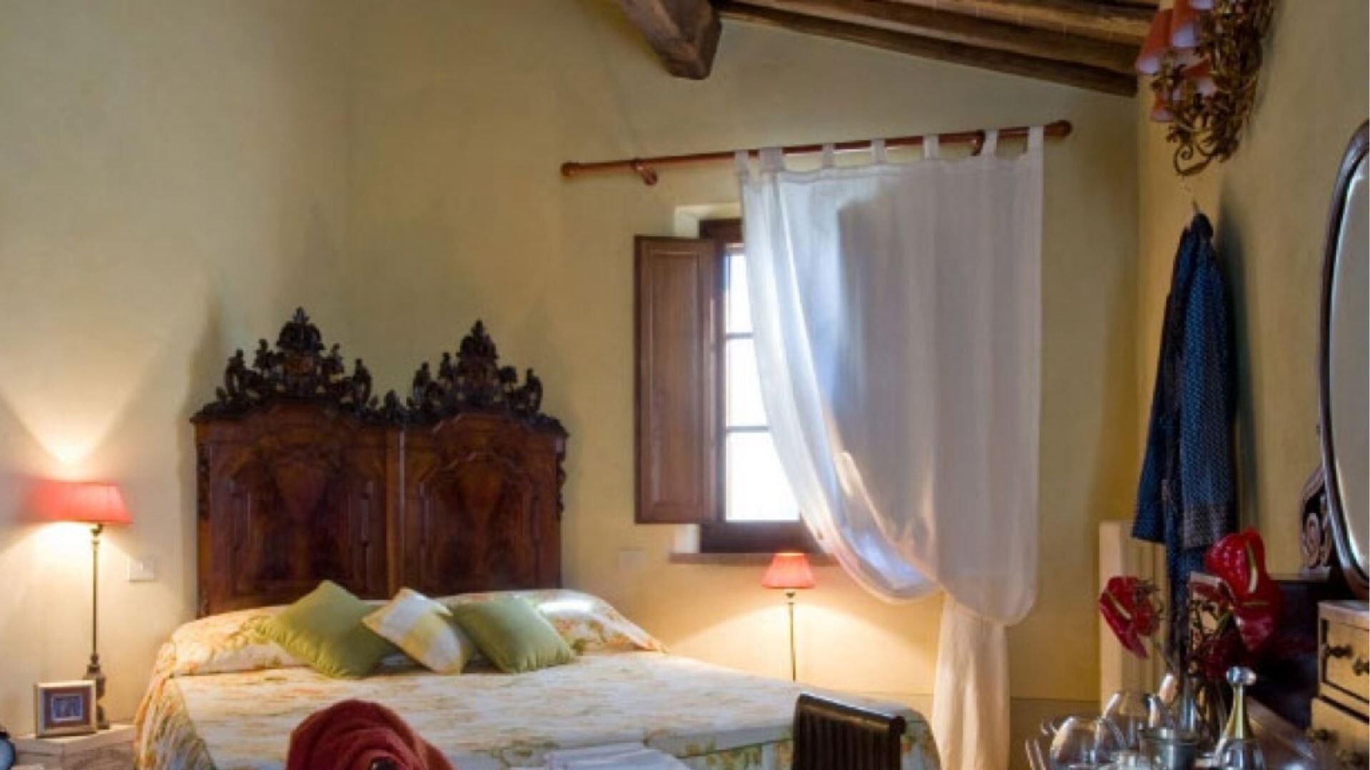 Indkvarteringen kan rumme op til 10 gæster fordelt på 7 soveværelser og 7 badeværelser, omhyggeligt fordelt mellem hovedvillaen og den ombyggede ladebygning. Hovedbygningen er tilgængelig via to separate indgange, hvor den ene fører til en lobby, garderobe og vaskerum. Til højre for denne indgang finder De et dobbeltværelse i stueetagen med eget badeværelse med bruser, specielt designet til kørestolsadgang. Den anden indgang åbner direkte ind til det store køkken. Også i stueetagen, bag spisestuen, er endnu et dobbeltværelse med tilstødende badeværelse med bruser. Fra indgangen stiger to ramper af gamle travertintrapper op til en repos, der åbner ud til en overdækket terrasse. På dette øverste niveau, til højre, finder De et dobbeltværelse med eget badeværelse med bruser, mens De til venstre finder en stor opholdsstue med pejs, der forbinder til to yderligere dobbelt- eller tosengsværelser, hvert med tilhørende badeværelser med både bruser og badekar. Den tilstødende lade er blevet omdannet til et moderne åbent rum, der kan huse 4 yderligere gæster. På det øverste niveau af laden vil De opdage to soveværelser, et dobbelt og et tosengssoveværelse, hver udstyret med bad og bruser. En åben trappe fører ned fra dette loftniveau til stueetagens opholdsstue, som har pejs, spisestue og åbent køkken.
