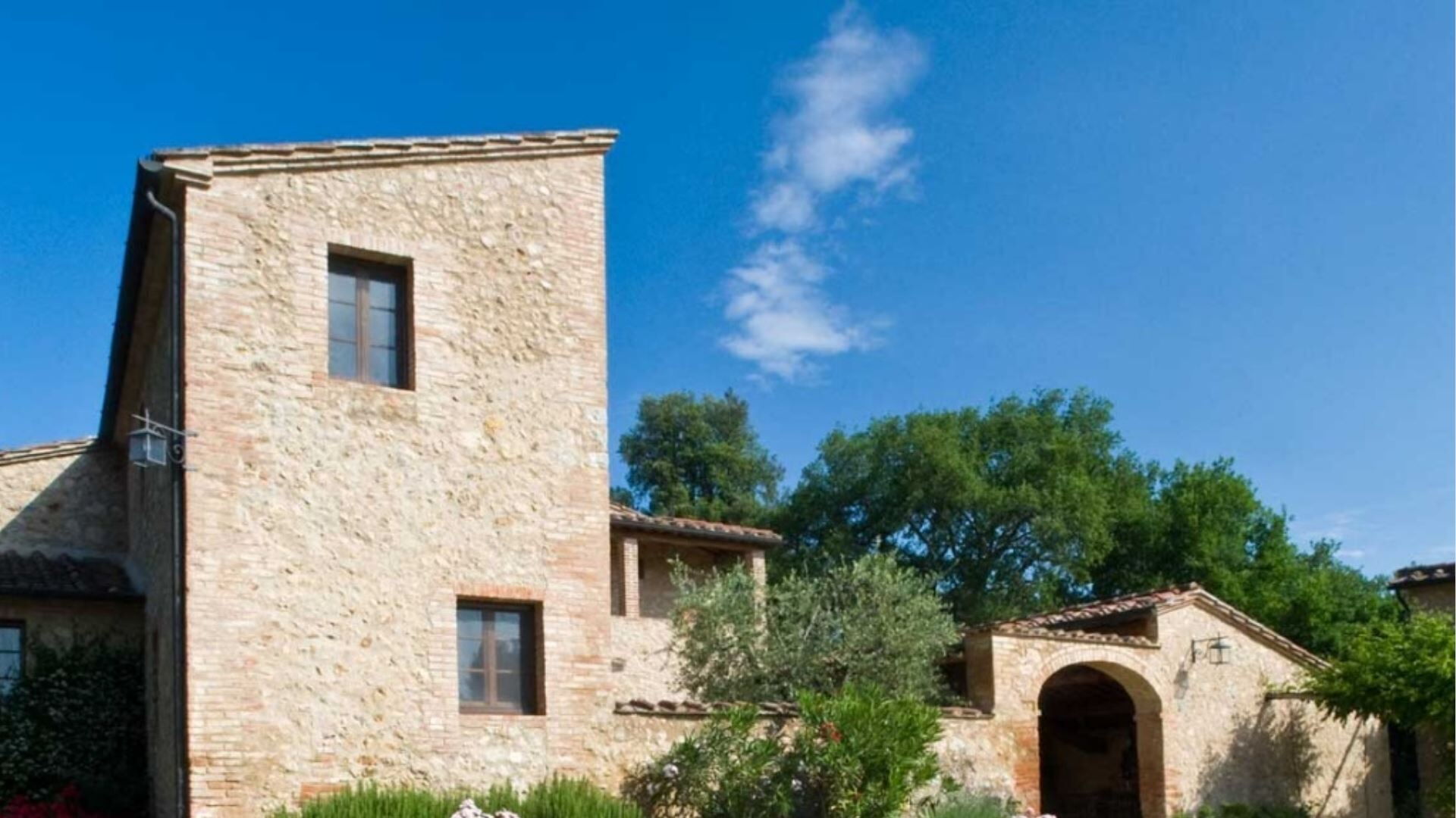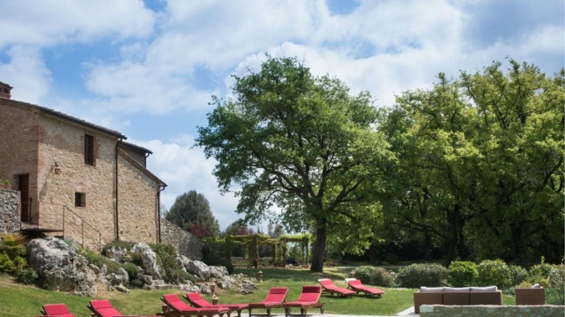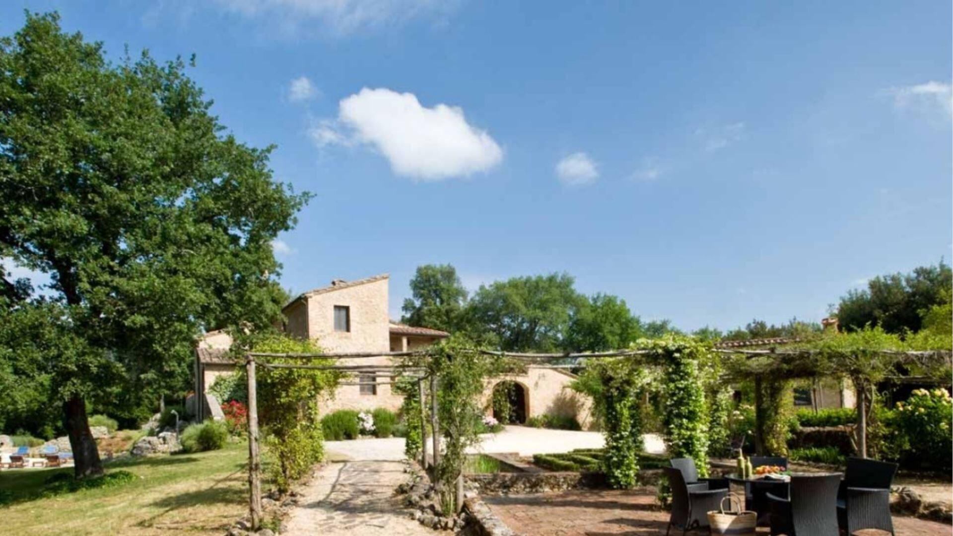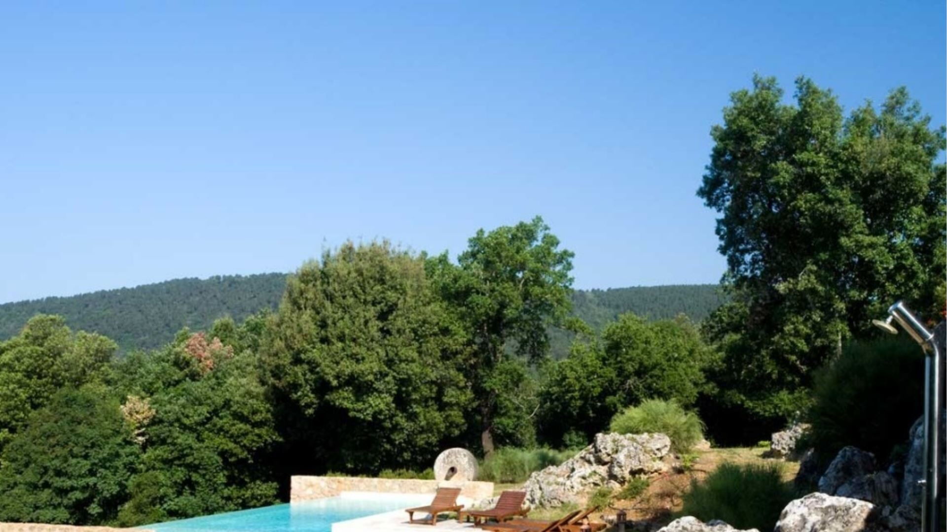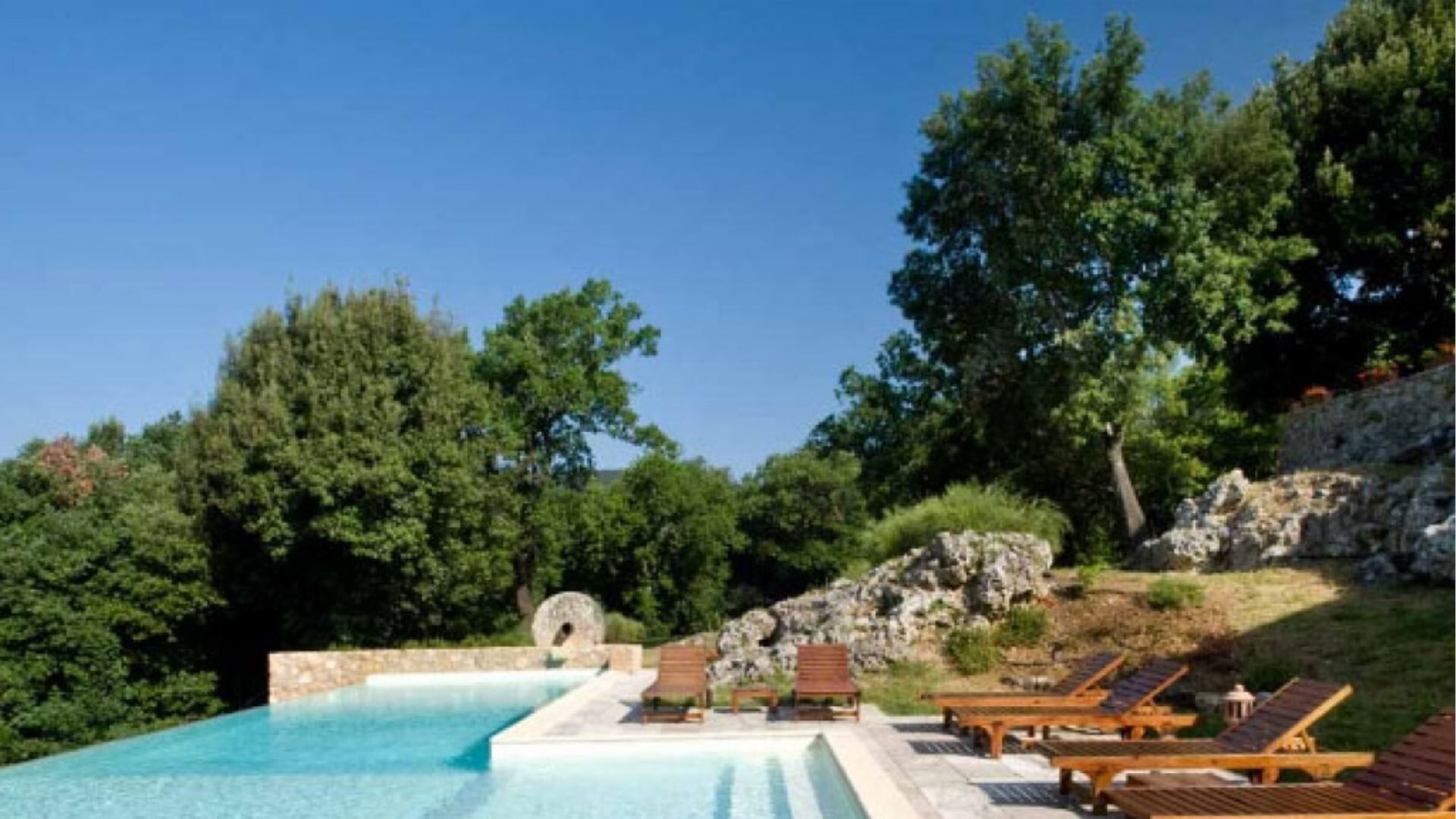 Udendørsområderne på denne bemærkelsesværdige ejendom er designet til at maksimere Deres nydelse af det betagende toskanske landskab. Midtpunktet er en fantastisk infinity pool, der måler 4,5 gange 13 meter, beliggende på en travertinterrasse, der smelter sømløst sammen med det omkringliggende naturlige klippemiljø og byder på spektakulær udsigt over Montagnola Senese. En fontæne med frisk vand flyder kontinuerligt ind i poolen og giver vidunderligt klart vand og en forfriskende naturlig rygmassage. Trin fra opholdsstuen fører ned til den nedre have og park, hvor De vil finde smukt anlagte områder med pergolaer og flere terrasser, der er perfekte til afslapning og spisning under åben himmel. En overdækket terrasse har udsigt over gårdspladsen og er tilgængelig fra den øvre repos, mens endnu en lille møbleret terrasse ud for spisestuen giver udsigt over skovene og laden. Stueetagens opholdsstue åbner gennem franske døre ud til en terrasse i Zen-stil med udsigt over poolen, ideel til at nyde aftencocktails og de sidste solstråler. Laden har en brolagt terrasse, der er tilgængelig gennem to store døre, perfekt til udendørs spisning. Yderligere udendørsfaciliteter omfatter et grillområde, en udvendig brændeovn til brød og pizza samt et grønt område med pergola, alt sammen forbedret af sikkerheds- og stemningsbelysning i hele området.