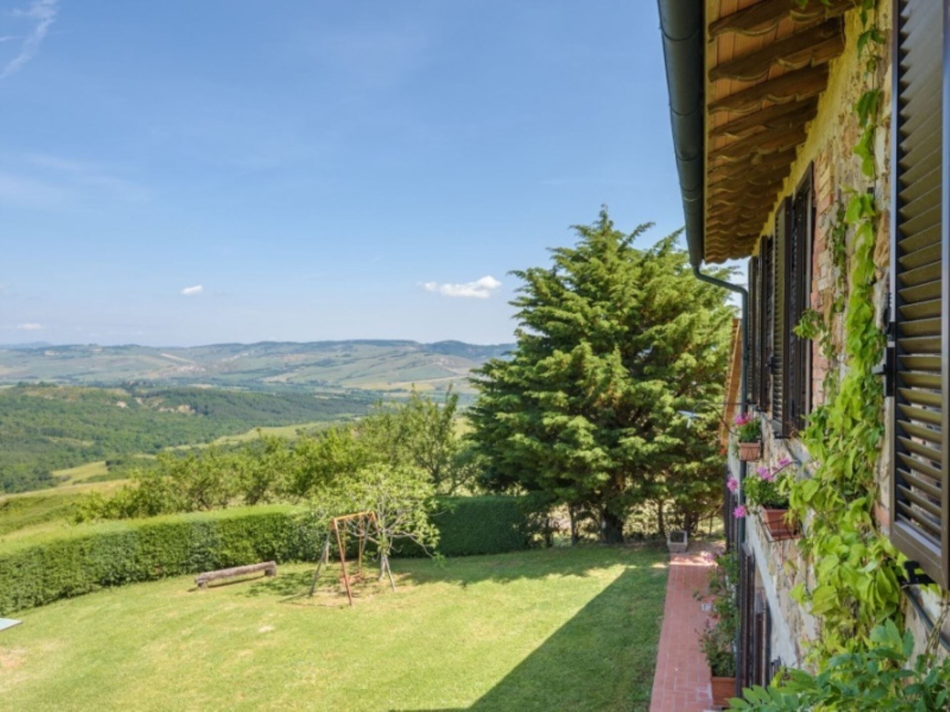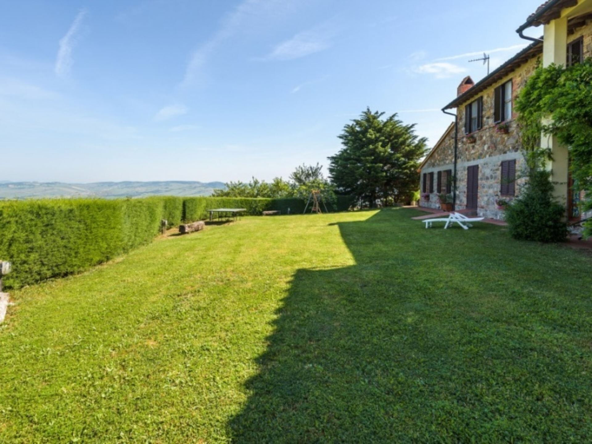Udendørsområderne ved Podere del Mezzadro tilbyder exceptionelle områder til afslapning og underholdning. De vil nyde en panoramisk ikke-opvarmet swimmingpool på 8 x 4 meter med en dybde fra 1,20 til 1,40 meter, som er indhegnet af sikkerhedsmæssige årsager og åben fra 1. maj til 31. oktober. Ejendommen har en stor have, der omgiver landstedet og giver rigelig plads til udendørs aktiviteter og fritid. En charmerende jasminpergola strækker sig fra huset og skaber et skyggefuldt område, hvor De kan spise udendørs ved komfortable jernborde med stole. De vil finde udendørsmøbler strategisk placeret over hele området for at maksimere Deres nydelse af den fantastiske udsigt. Et grill-område er tilgængeligt til tilberedning af måltider i det fri, og børn vil blive begejstrede for den dedikerede legeplads. Lejlighederne i stueetagen åbner direkte ud til jasminpergolen, mens Lavanda-lejligheden giver adgang gennem en altandør til den store bagvedliggende græsplæne. Oleandro-lejligheden vender ud mod et lille, afsondret grønt hjørne af gården og tilbyder yderligere privatliv og ro.
